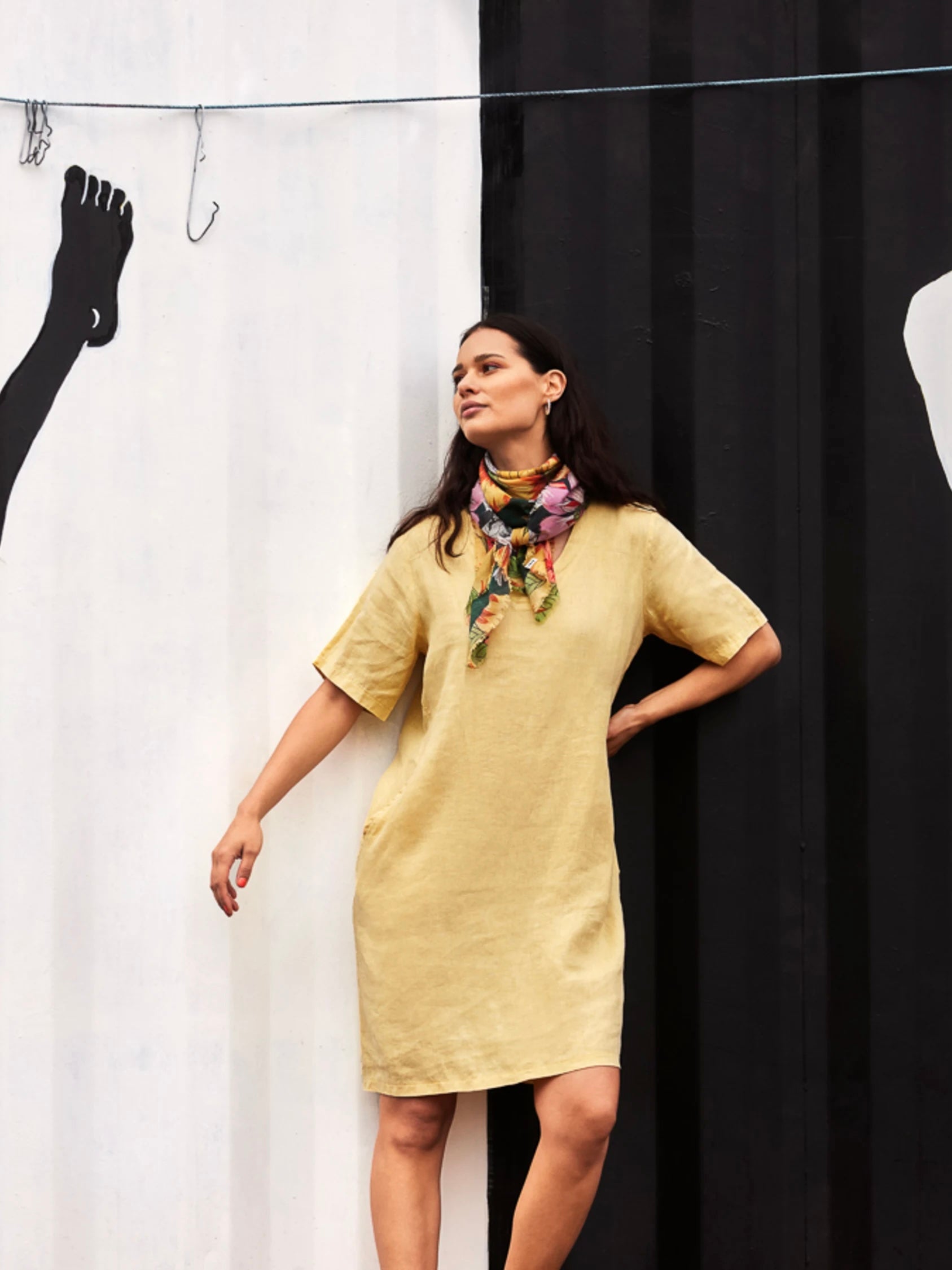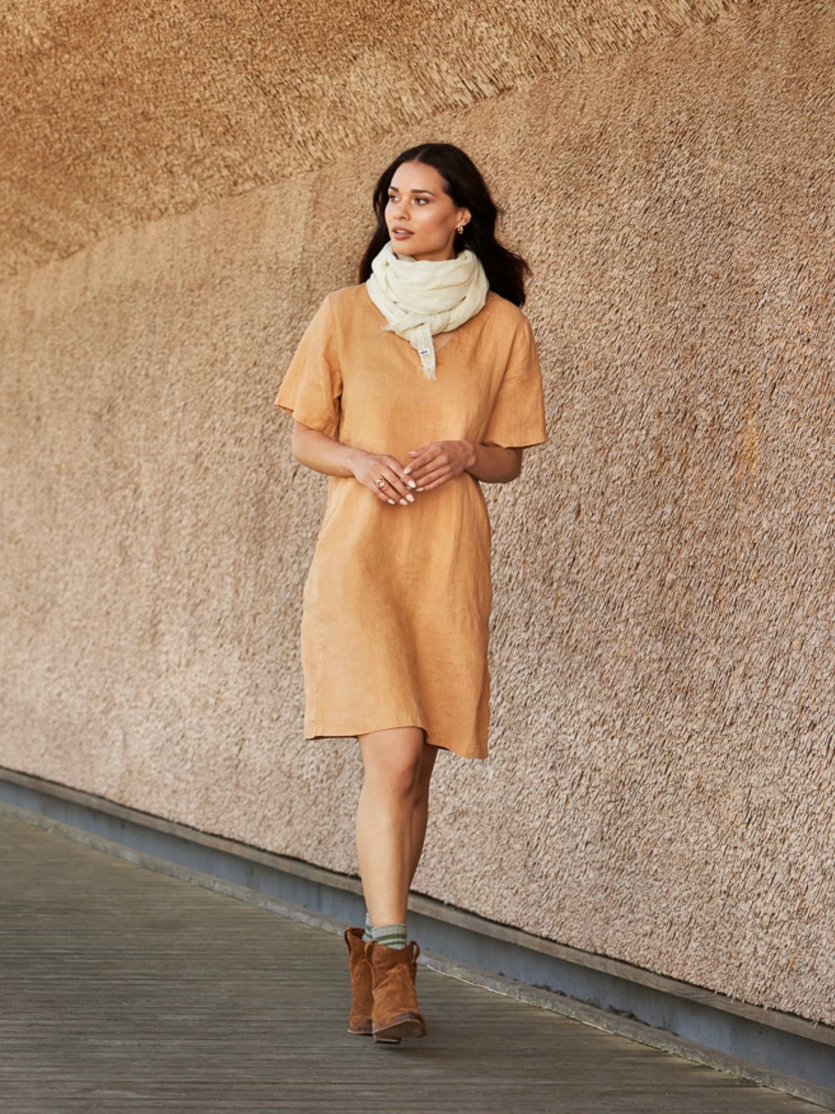 Lässiges Leinenkleid in leicht taillierter Form mit V-förmigen Halsausschnitt. Weite kurze Ärmel. Mit seitlichen Eingrifftaschen. Besonders hochwertige Leinenqualität.