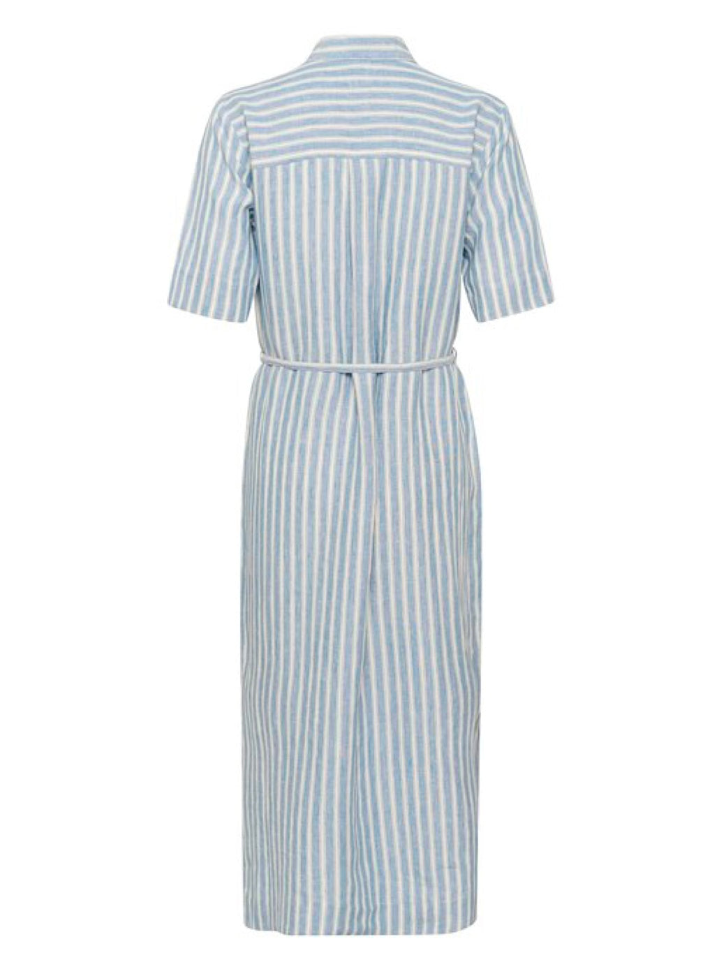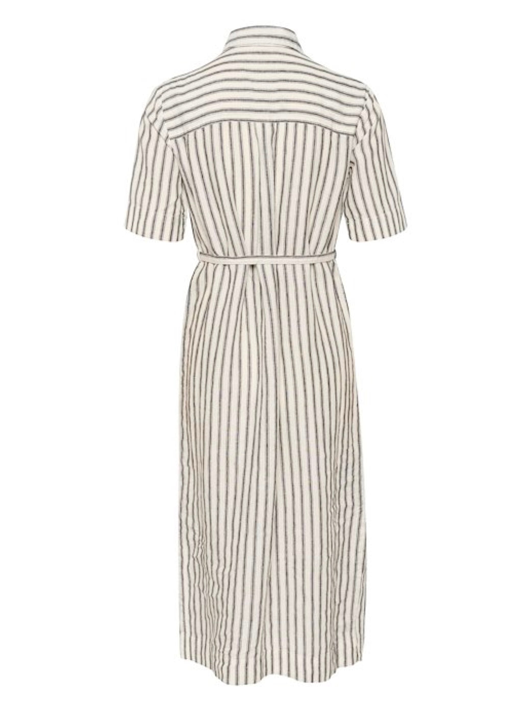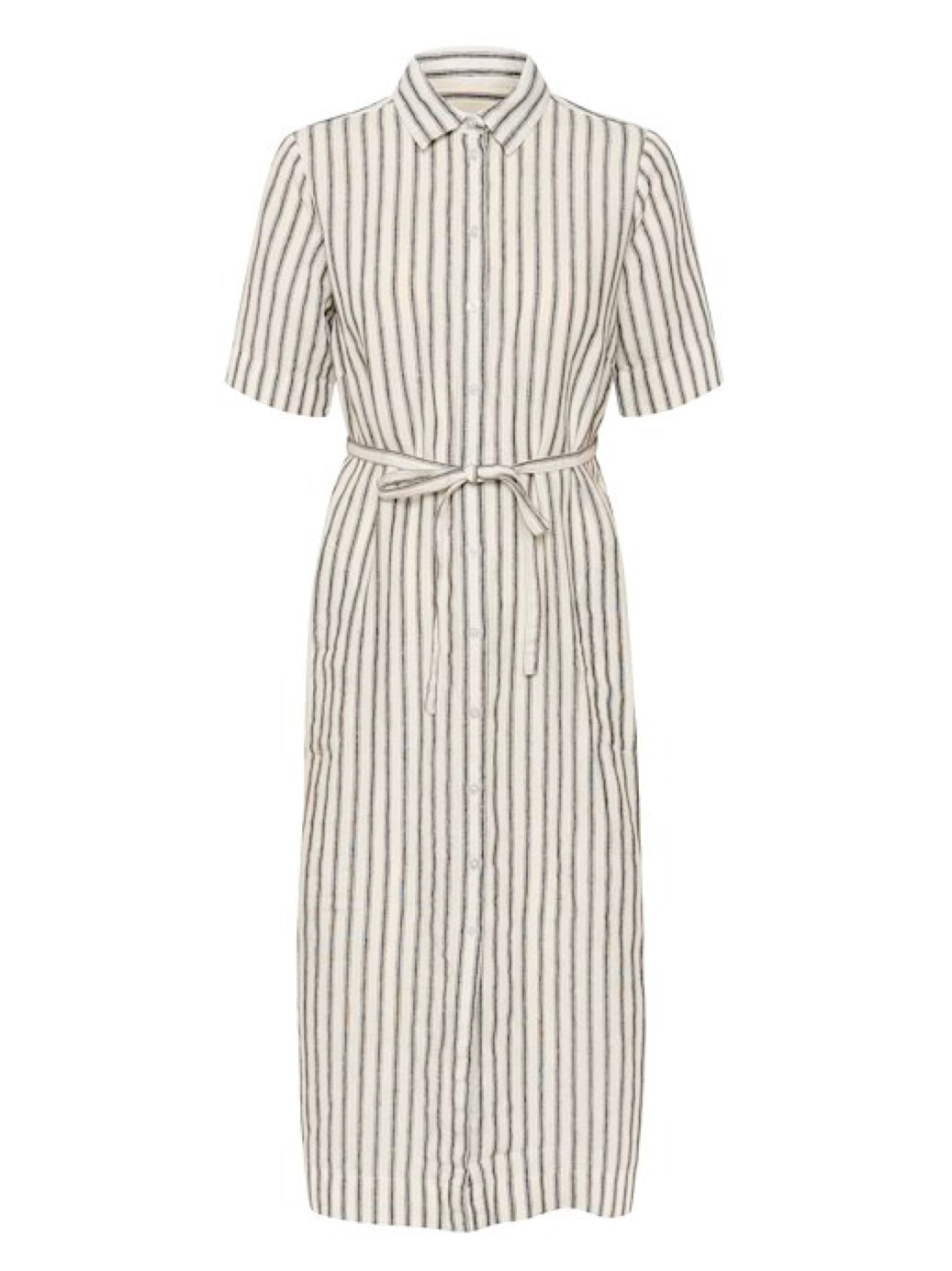 Wadenlanges, durchgeknöpftes Hemdblusenkleid in dezentem Streifendessin. Gerade Form, ein Bindegürtel wird mitgeliefert. Mit kurzen Ärmeln gearbeitet. Aus einer angenehmen Leinenqualität gefertigt.