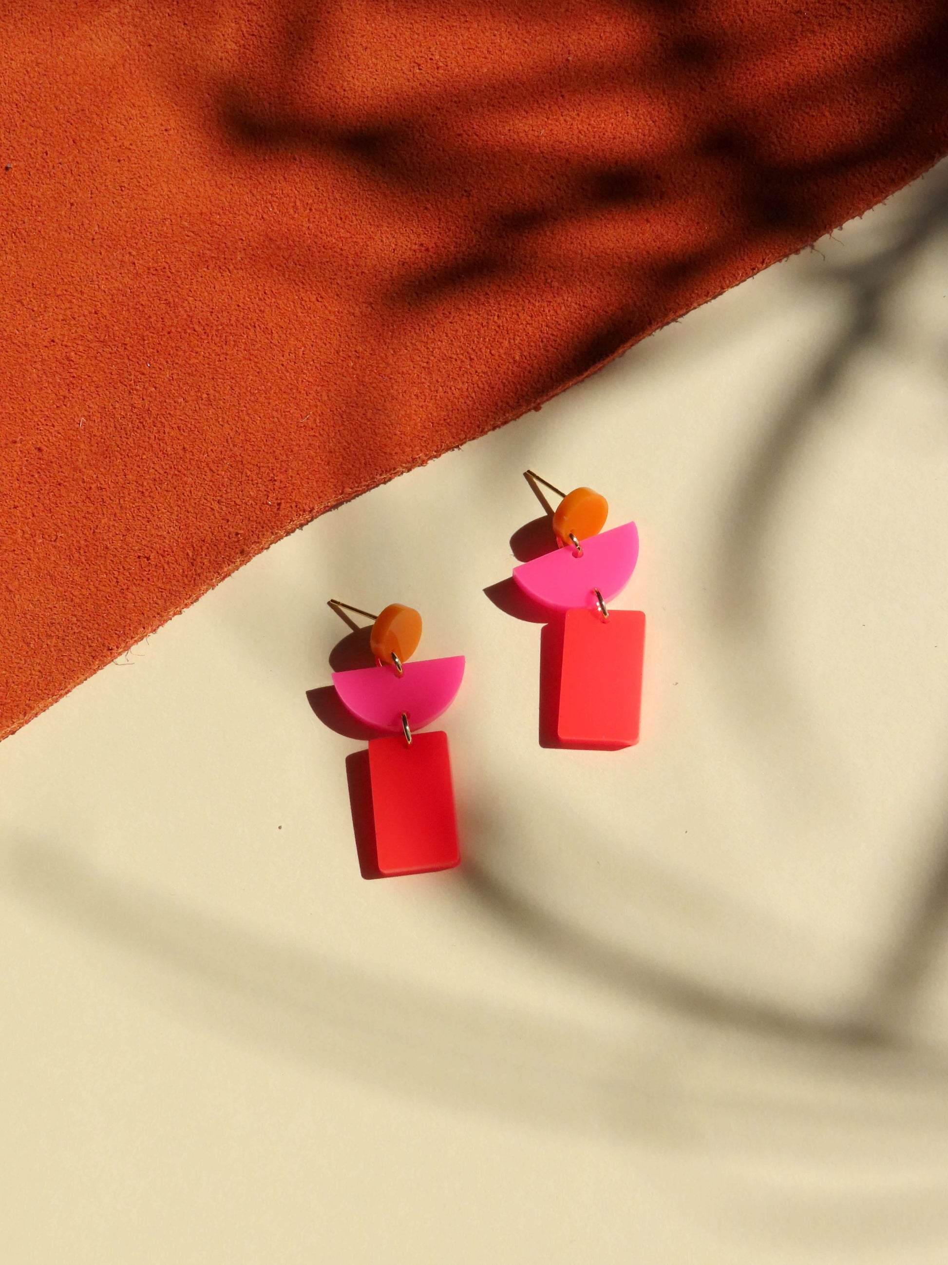 Der feuerrote Anhänger trifft auf knalliges Pink und sonniges Orange – ein Farbdreiklang, der sofort gute Laune macht. Und dank federleichtem Acryl und Edelstahlsteckern trägst du sie stundenlang, ohne dass sie beschweren.