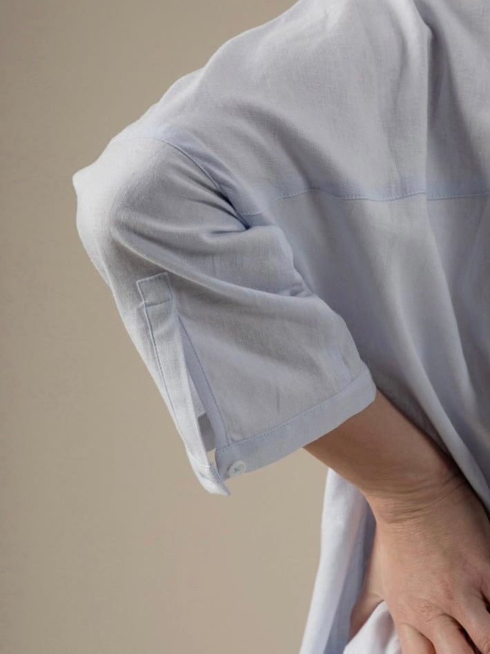 Lässige Longbluse aus einer soften Leinenqualität mit kleinem Hemdkragen. Gerade Form mit überschnittenen 3/4 Ärmeln und abgerundetem Saum, hinten etwas länger geschnitten. Vorn durchgeknöpft. Zeitloser Style, der immer in Mode ist. Auch als Tunika oder Kleid zu tragen.