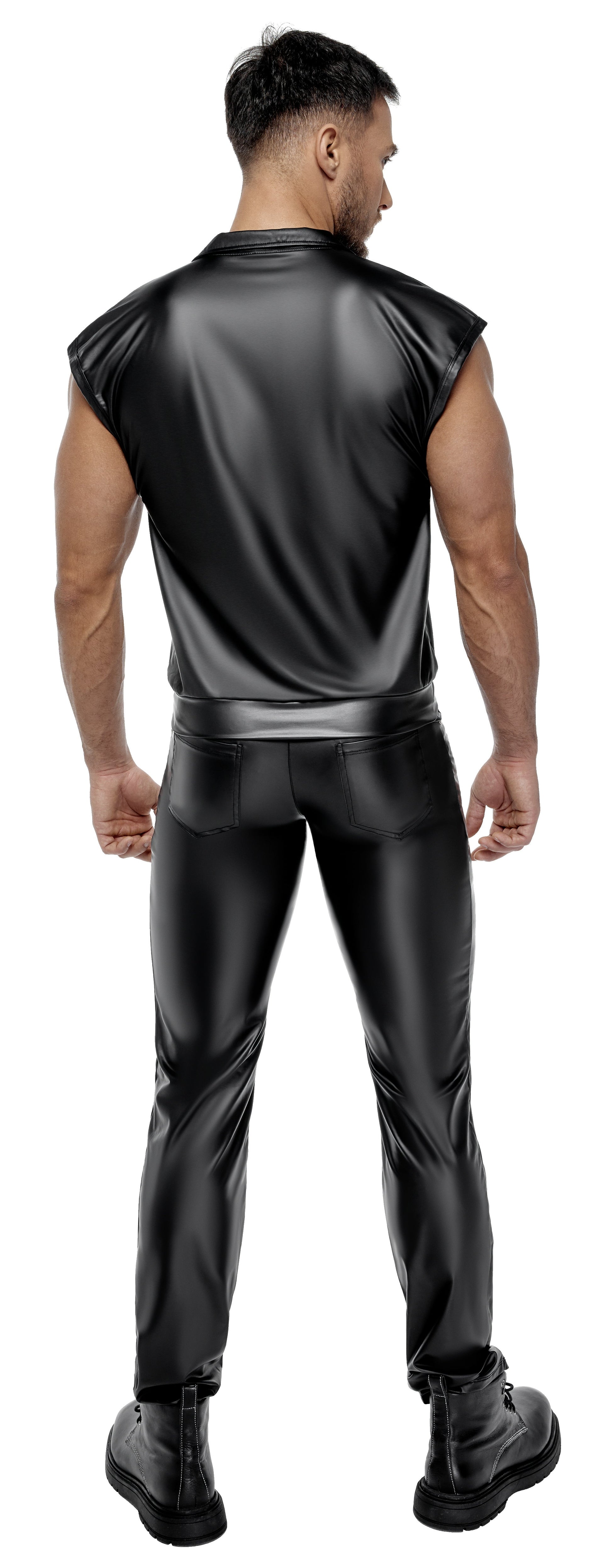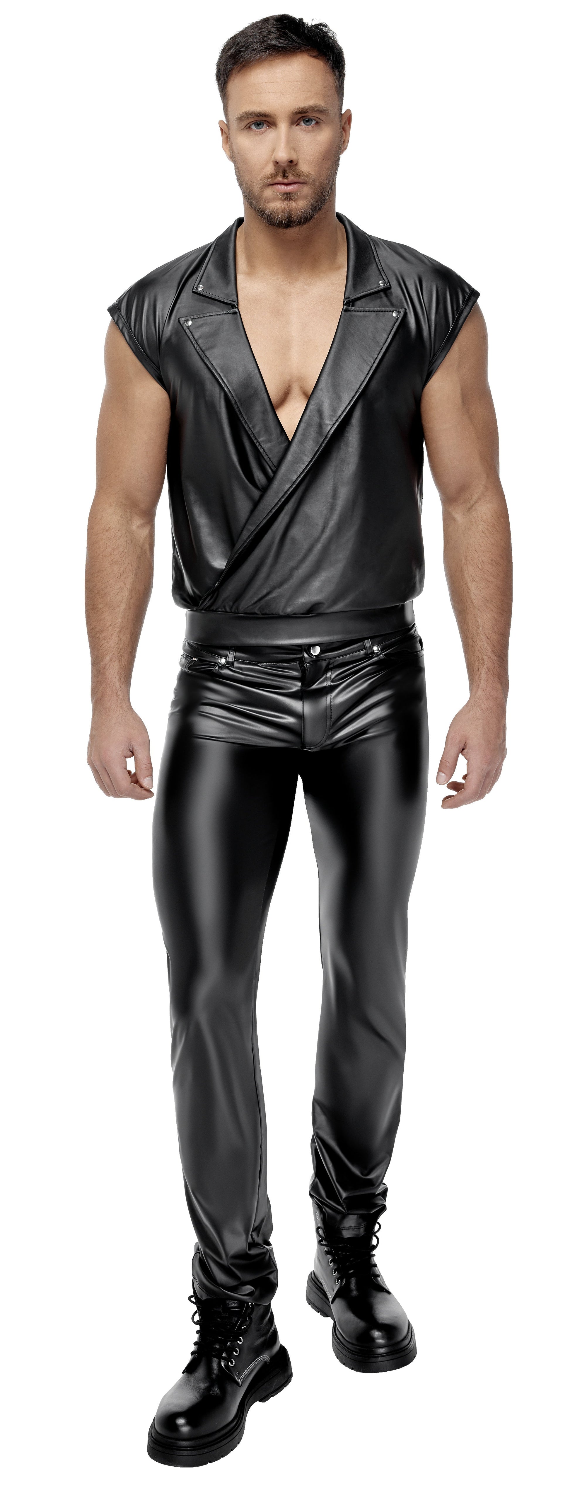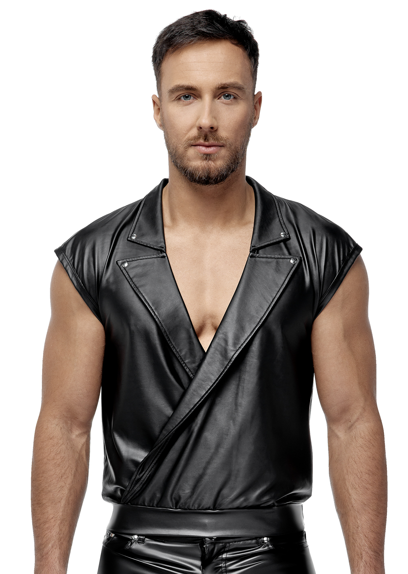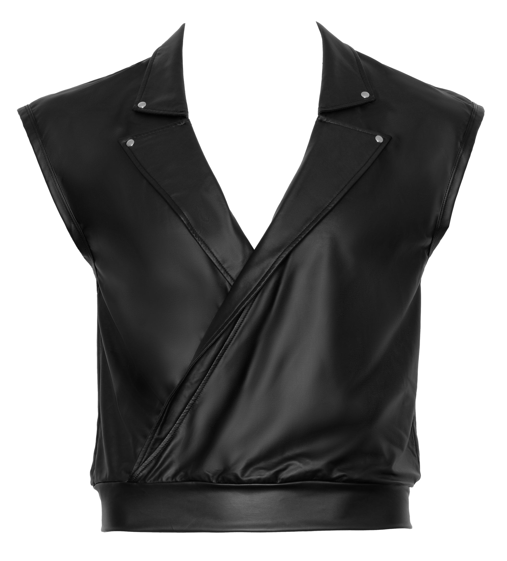 Loose casual shirt in a stylish black matte look with casually overlapping sleeves and elastic waistband at the hem. Open overlapping front with long, studded lapel collar. Soft and stretchy all around for maximum comfort.