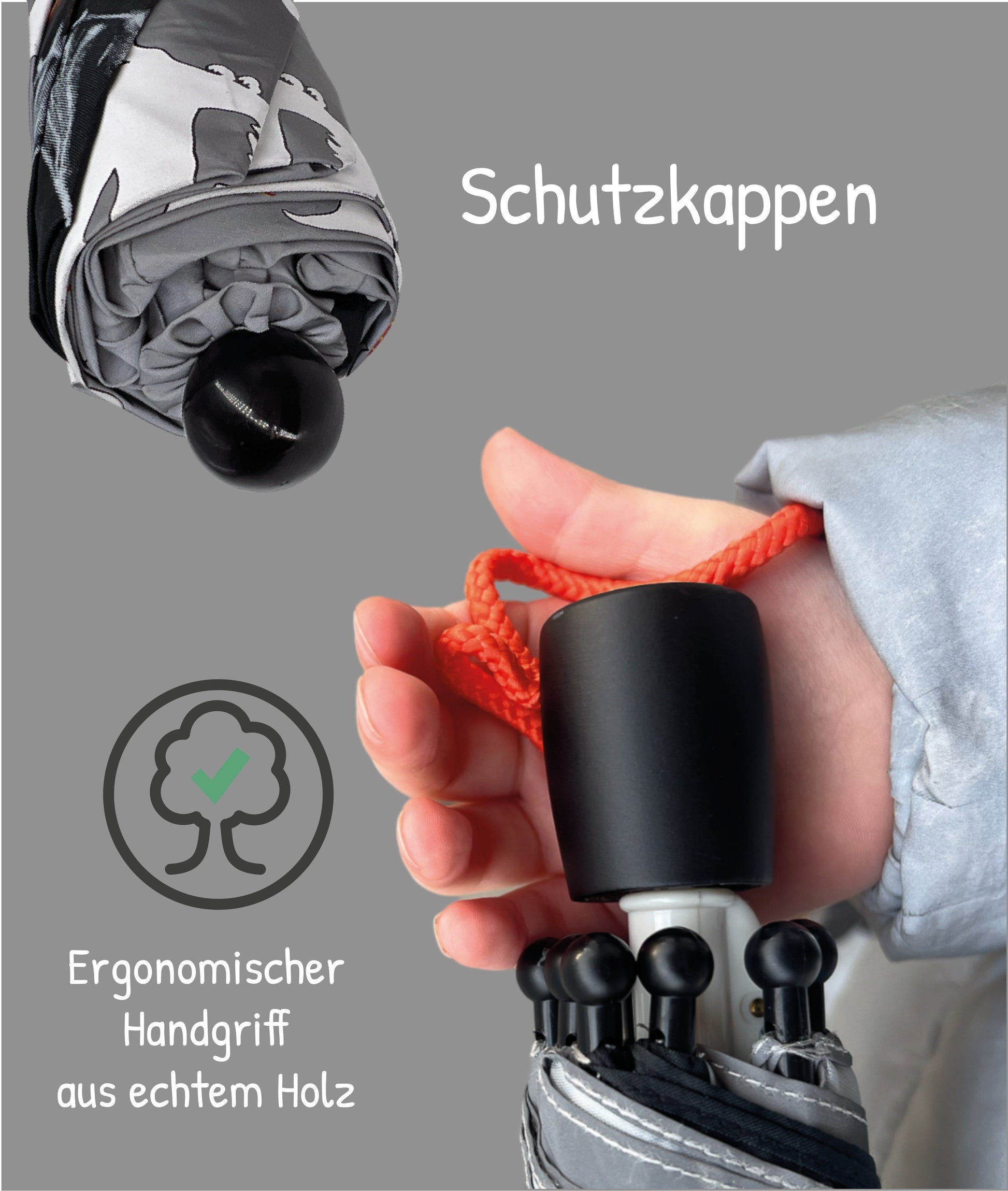 Das robuste Polyestergewebe schützt zuverlässig vor Regen und schädlicher UV-Strahlung. Der ergonomisch geformte Holzgriff liegt angenehm und sicher in kleinen Händen – ideal für den täglichen Gebrauch.