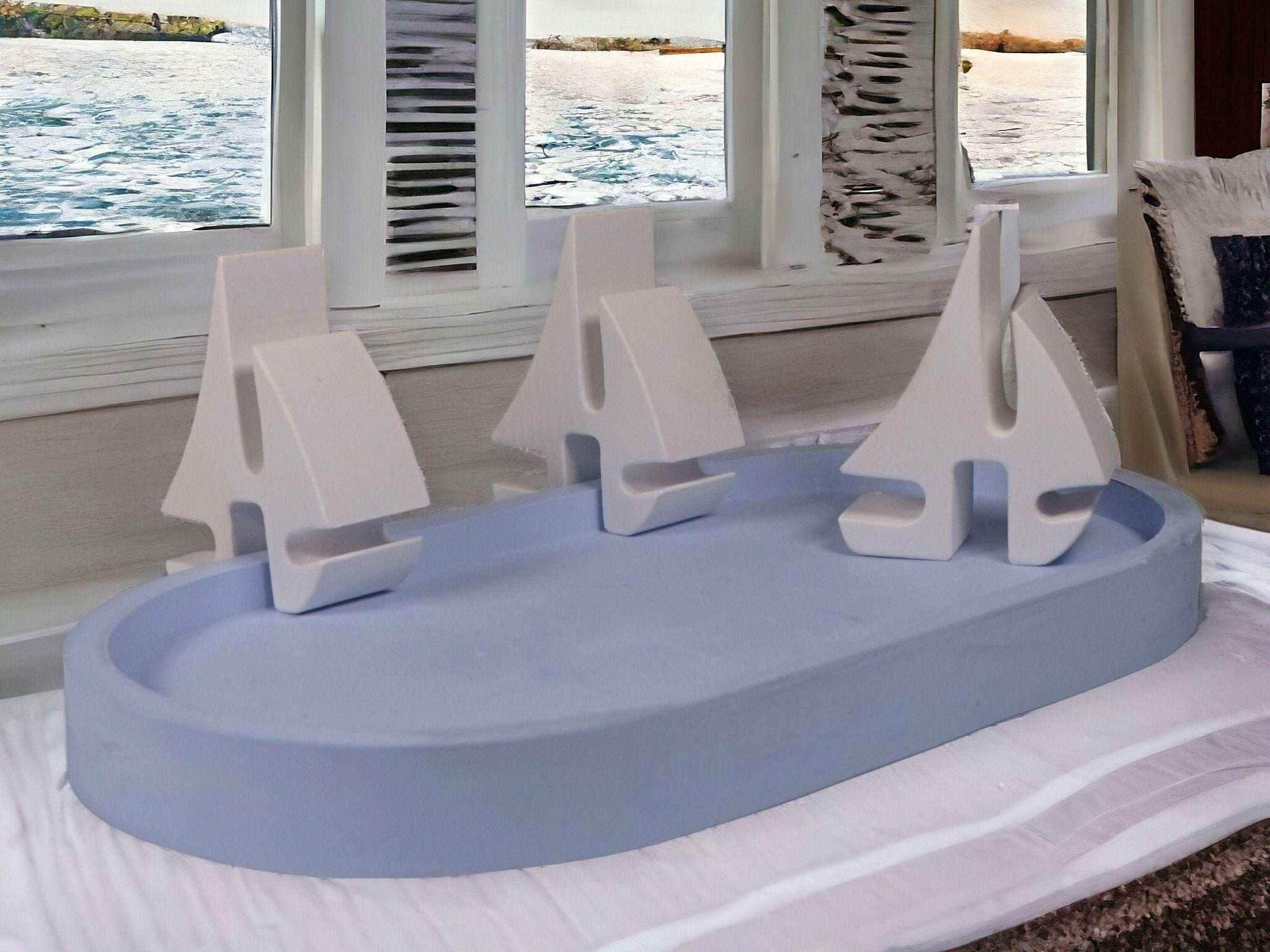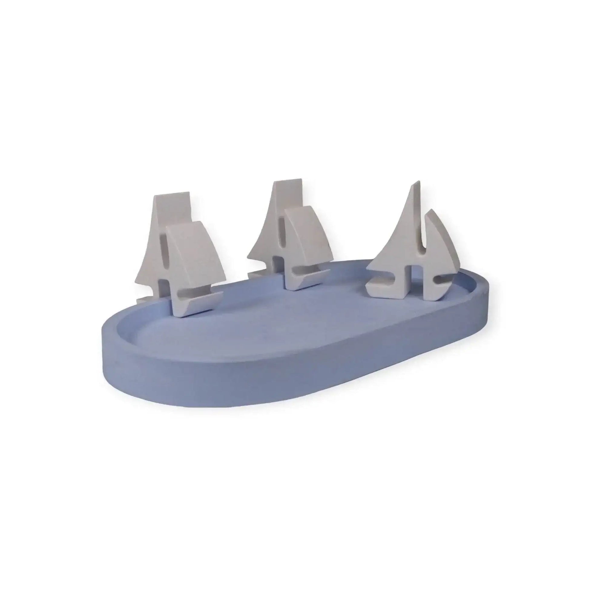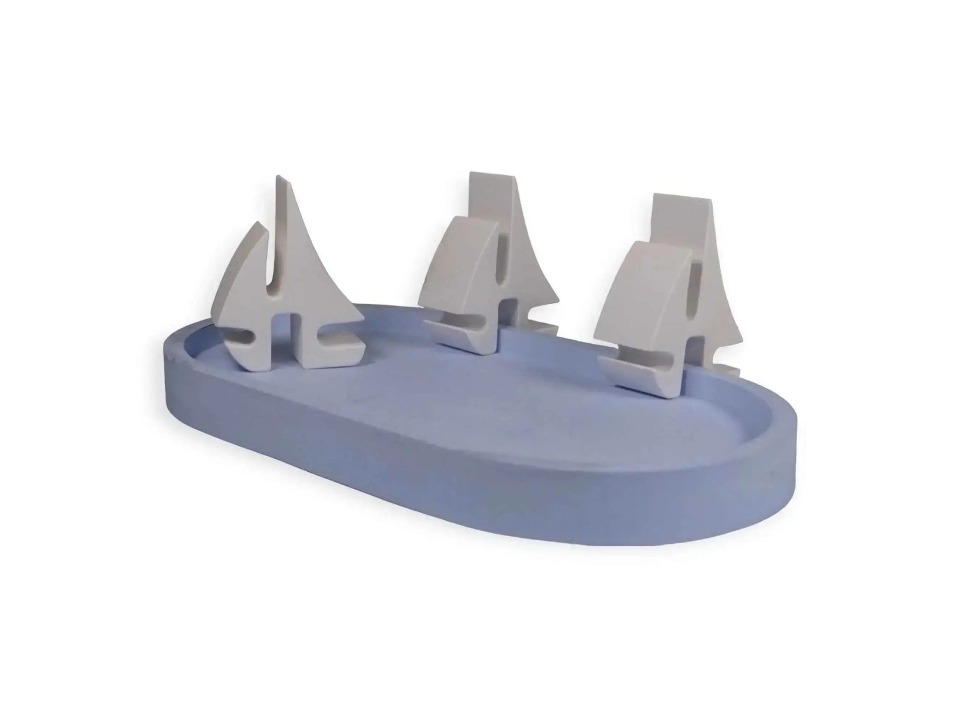 Bringe mit diesem handgefertigten Dekoteller aus hochwertiger Keramik frische Meeresbrise und stilvolles Küstenflair in dein Zuhause. Das charmante Arrangement aus drei Segelbooten auf einem ovalen Teller (170 × 90 mm) ist ein echtes Highlight für Sideboard, Esstisch oder Regal.
