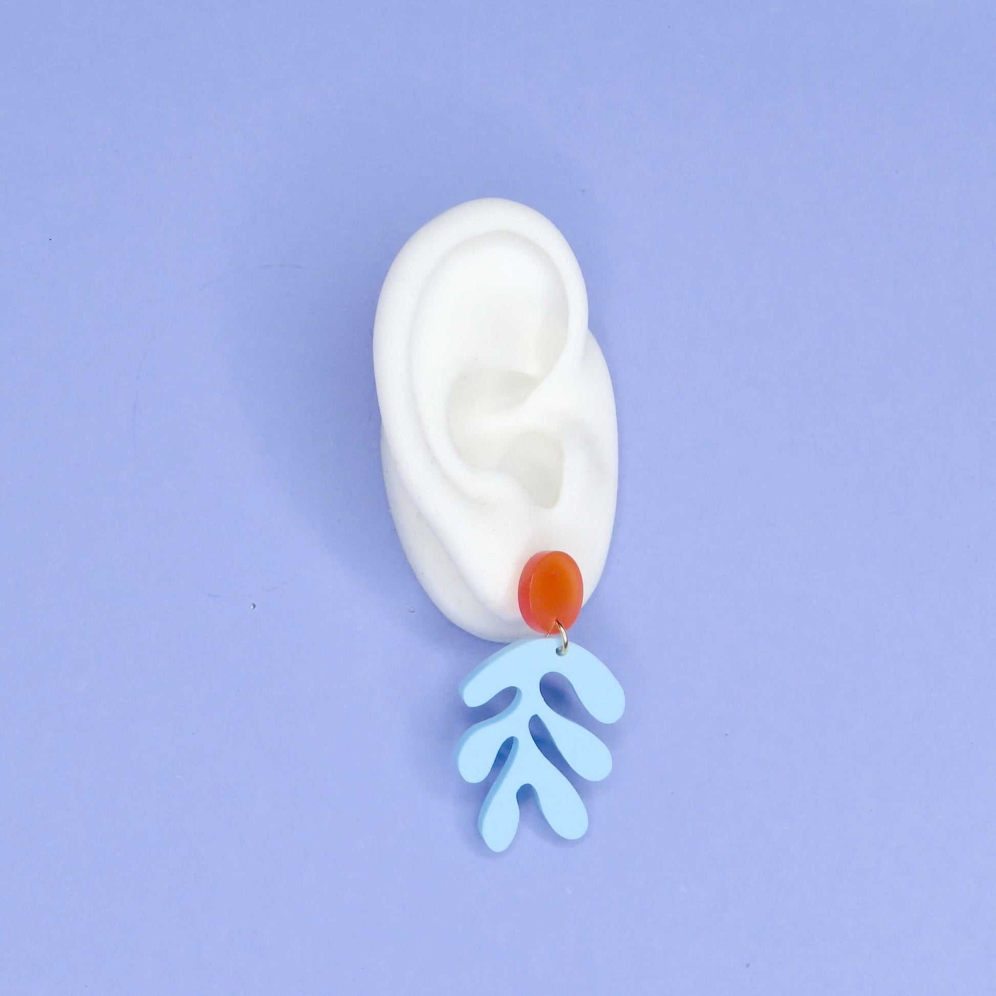 Das hellblaue Acryl erinnert mit seiner floralen Form an die ikonischen Scherenschnitte von Henri Matisse – verspielt, elegant und stilvoll zugleich. Der orangefarbene Stecker setzt dazu einen leuchtenden Akzent.