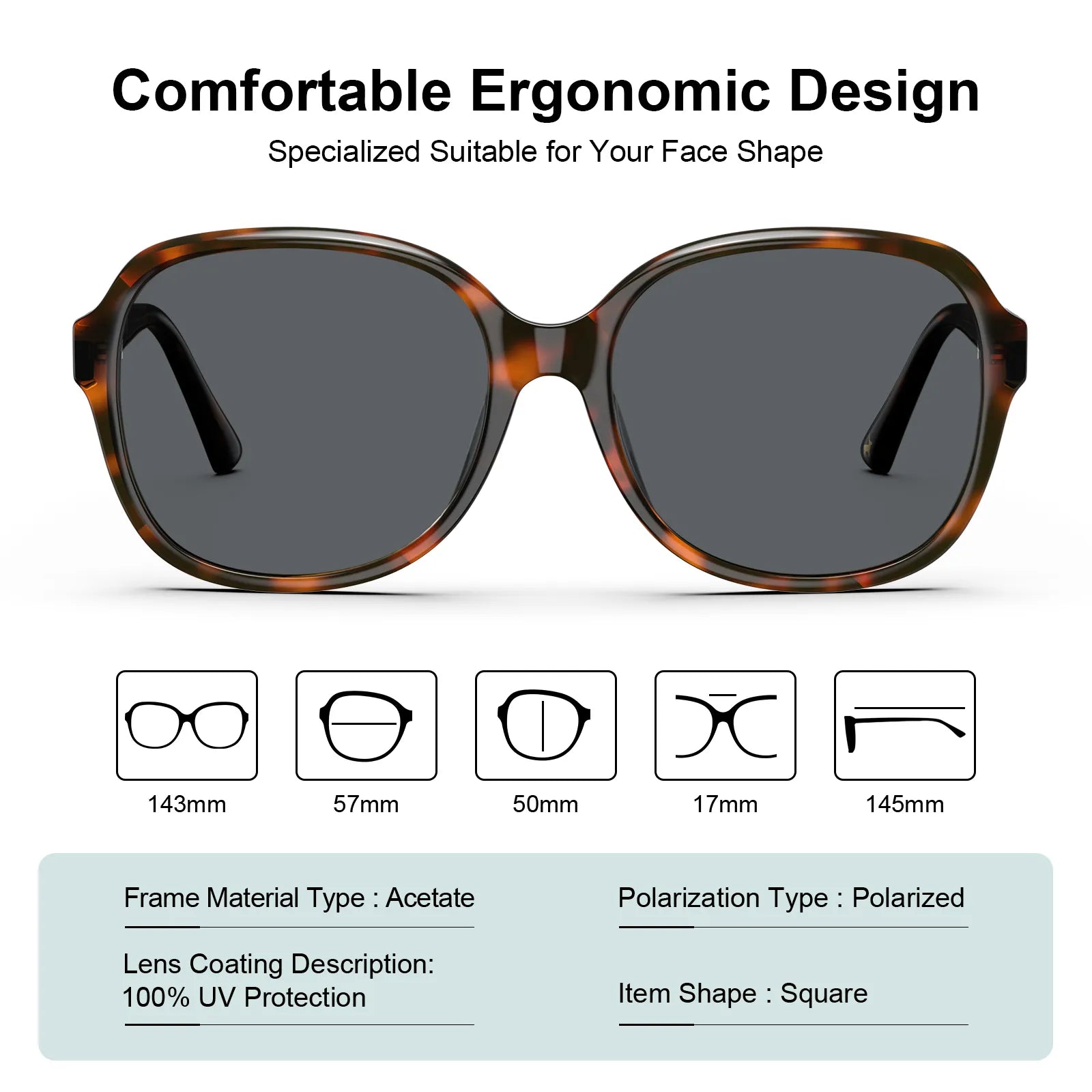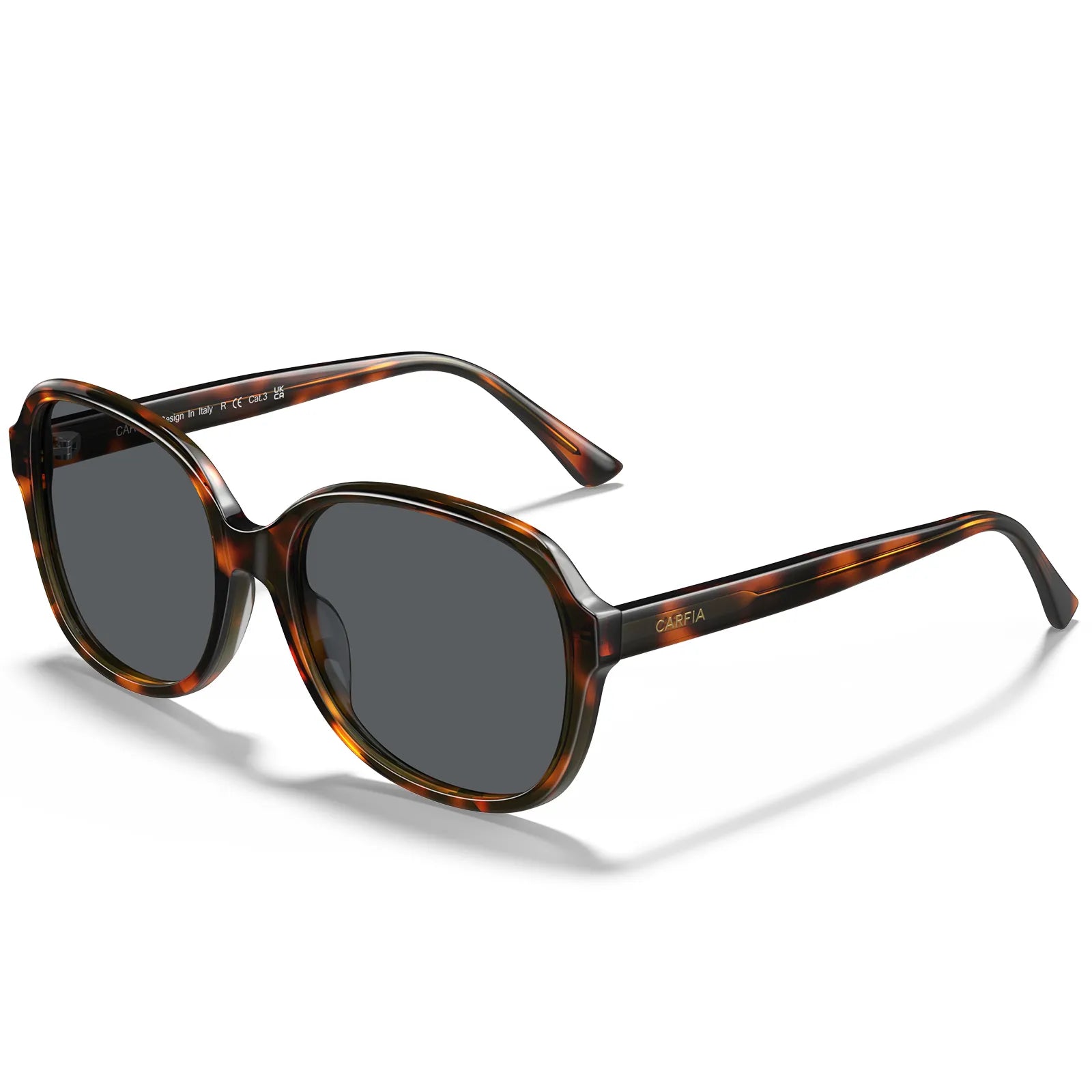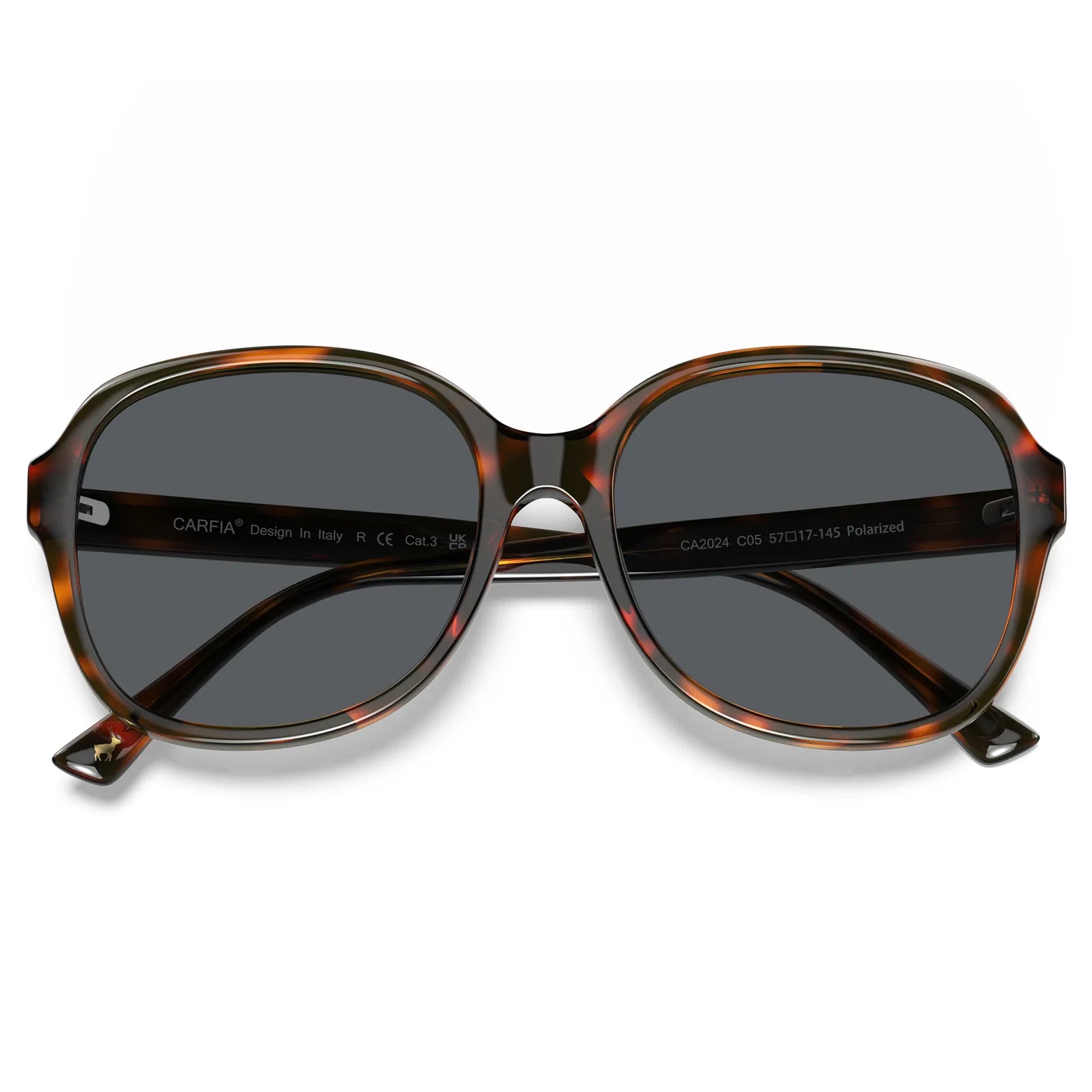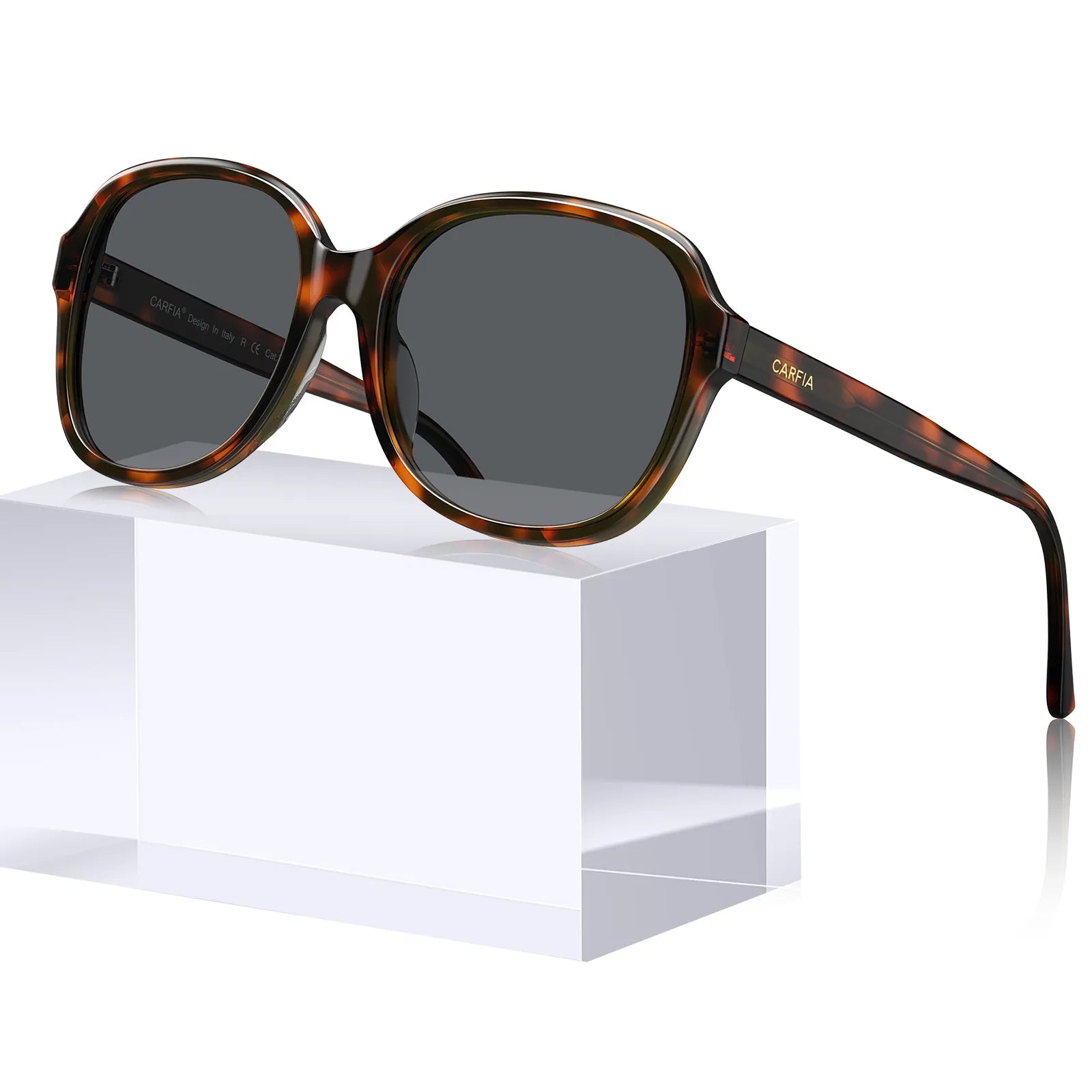 Ergonomic Construction Sun Glasses for Women - These polarized women's sunglasses offer enhanced lens coverage (with a lens width of 57mm) and a specialized lens curvature that provides perfect protection against sidelight. They are ideal for activities like golf, driving, and handling anything else that the sun presents!Polarized UVA, UVB Rays Protection - The lenses are highly effective at polarization, so your eyes won't be irritated by the brightness of the sunshine. Instead, it's a very soothing experience, allowing you to enjoy your daily life without having to squint.Real Expensive Acetate Eyewear - Carfia's hand-crafted cellulose acetate frames come with embedded patterns and feature a rich color finish, making them just as excellent as the world's most renowned brands. Because we believe that everyone should have the opportunity to wear high-quality eyeglasses.Hardware & Details - The three-barrel hinge adds durability to the frame's structure. The exclusive colors result in a unique pattern for each frame. These sunglasses are not only aesthetically pleasing for fashion but also great for protecting your eyes on sunny days, even if you have puffy eyes.Package Bonus✚✚✚ - ✔ Women's Sunglasses, ✔ Polarization Testing Card, ✔ Soft Lenses Wipe, ✔ 365 Days Free Replacement Card, ✔ Nice Leather Eyeglass Case, ✔ Hard Protection Box. It's 100% risk-free to try. In case of any issues, just contact the seller without hesitation, and they'll solve the problem to your satisfaction.