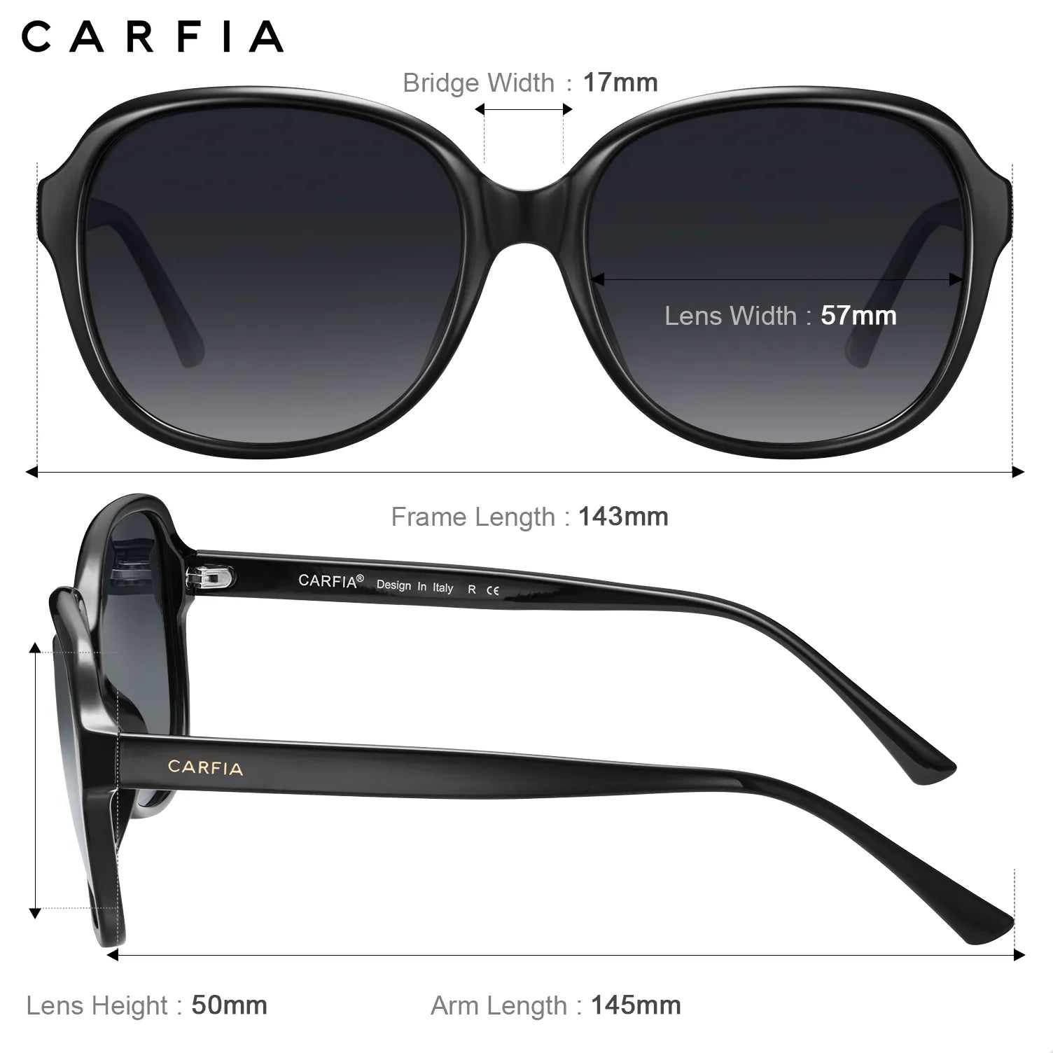 Ergonomic Construction Sun Glasses for Women - These polarized women's sunglasses offer enhanced lens coverage (with a lens width of 57mm) and a specialized lens curvature that provides perfect protection against sidelight. They are ideal for activities like golf, driving, and handling anything else that the sun presents!Polarized UVA, UVB Rays Protection - The lenses are highly effective at polarization, so your eyes won't be irritated by the brightness of the sunshine. Instead, it's a very soothing experience, allowing you to enjoy your daily life without having to squint.Real Expensive Acetate Eyewear - Carfia's hand-crafted cellulose acetate frames come with embedded patterns and feature a rich color finish, making them just as excellent as the world's most renowned brands. Because we believe that everyone should have the opportunity to wear high-quality eyeglasses.Hardware & Details - The three-barrel hinge adds durability to the frame's structure. The exclusive colors result in a unique pattern for each frame. These sunglasses are not only aesthetically pleasing for fashion but also great for protecting your eyes on sunny days, even if you have puffy eyes.Package Bonus✚✚✚ - ✔ Women's Sunglasses, ✔ Polarization Testing Card, ✔ Soft Lenses Wipe, ✔ 365 Days Free Replacement Card, ✔ Nice Leather Eyeglass Case, ✔ Hard Protection Box. It's 100% risk-free to try. In case of any issues, just contact the seller without hesitation, and they'll solve the problem to your satisfaction.