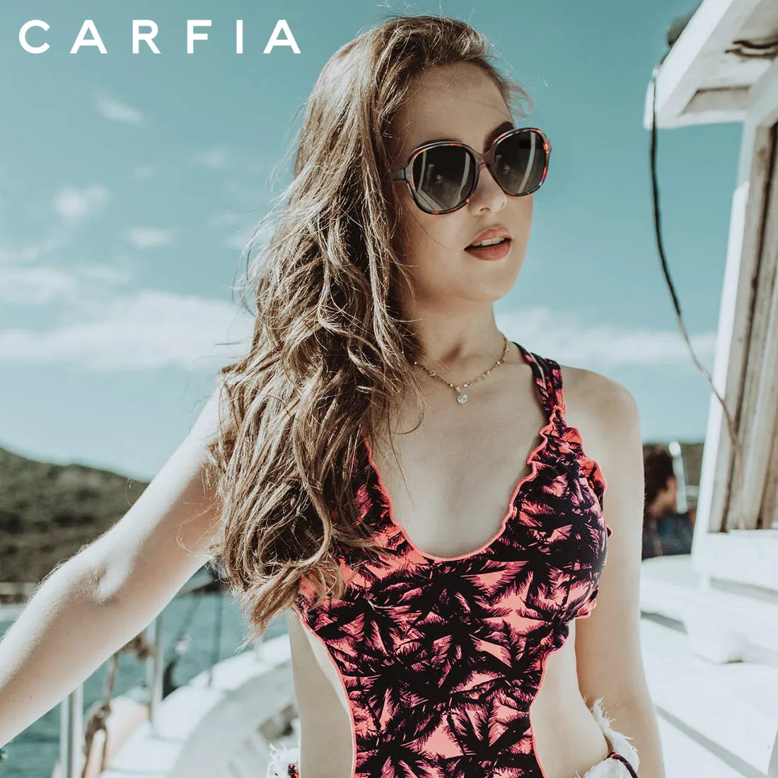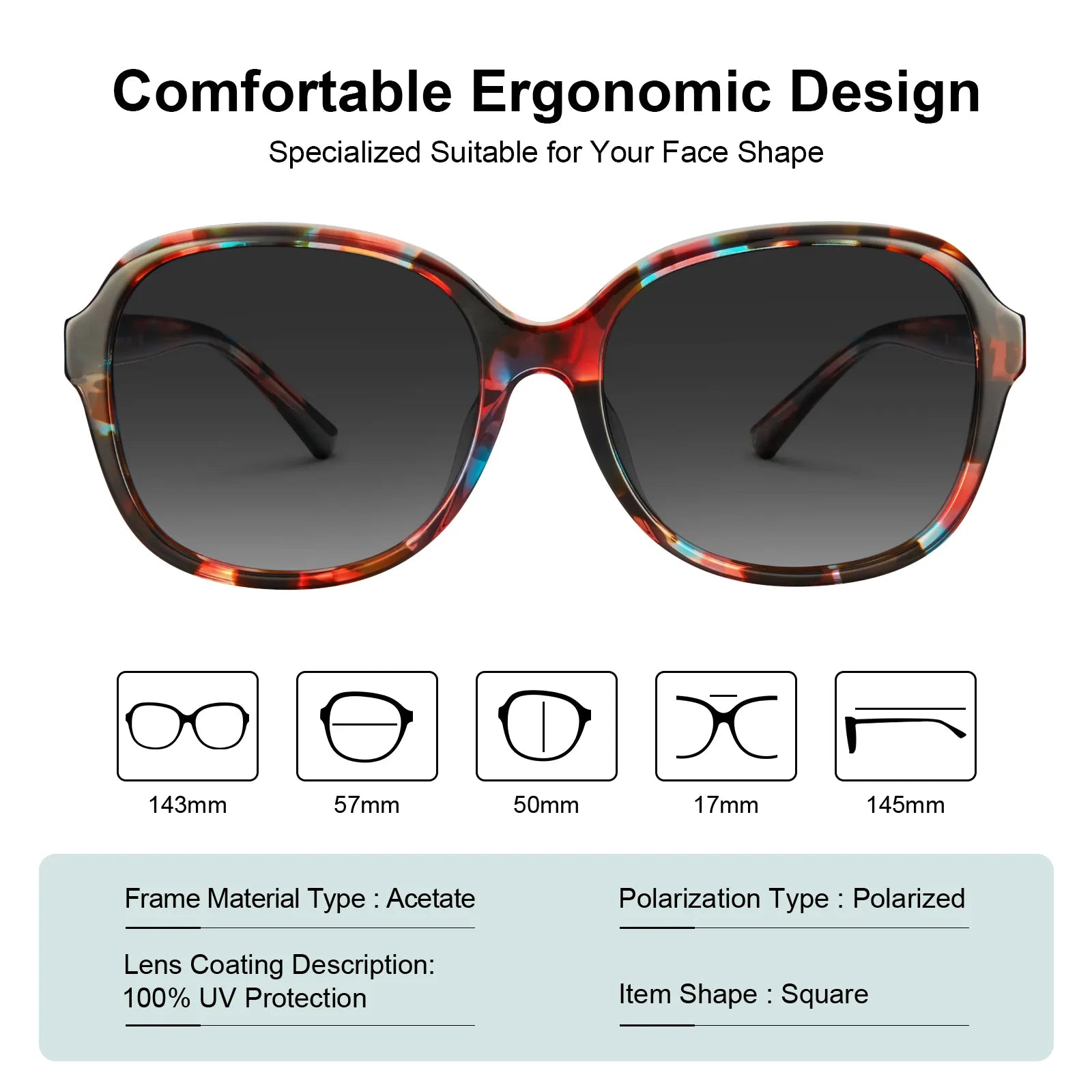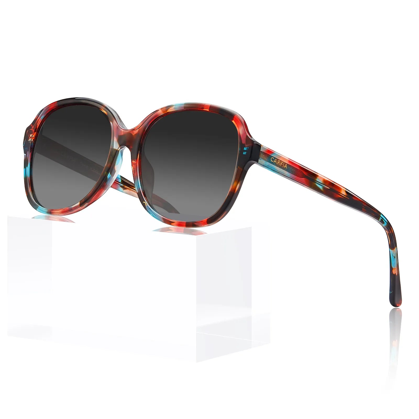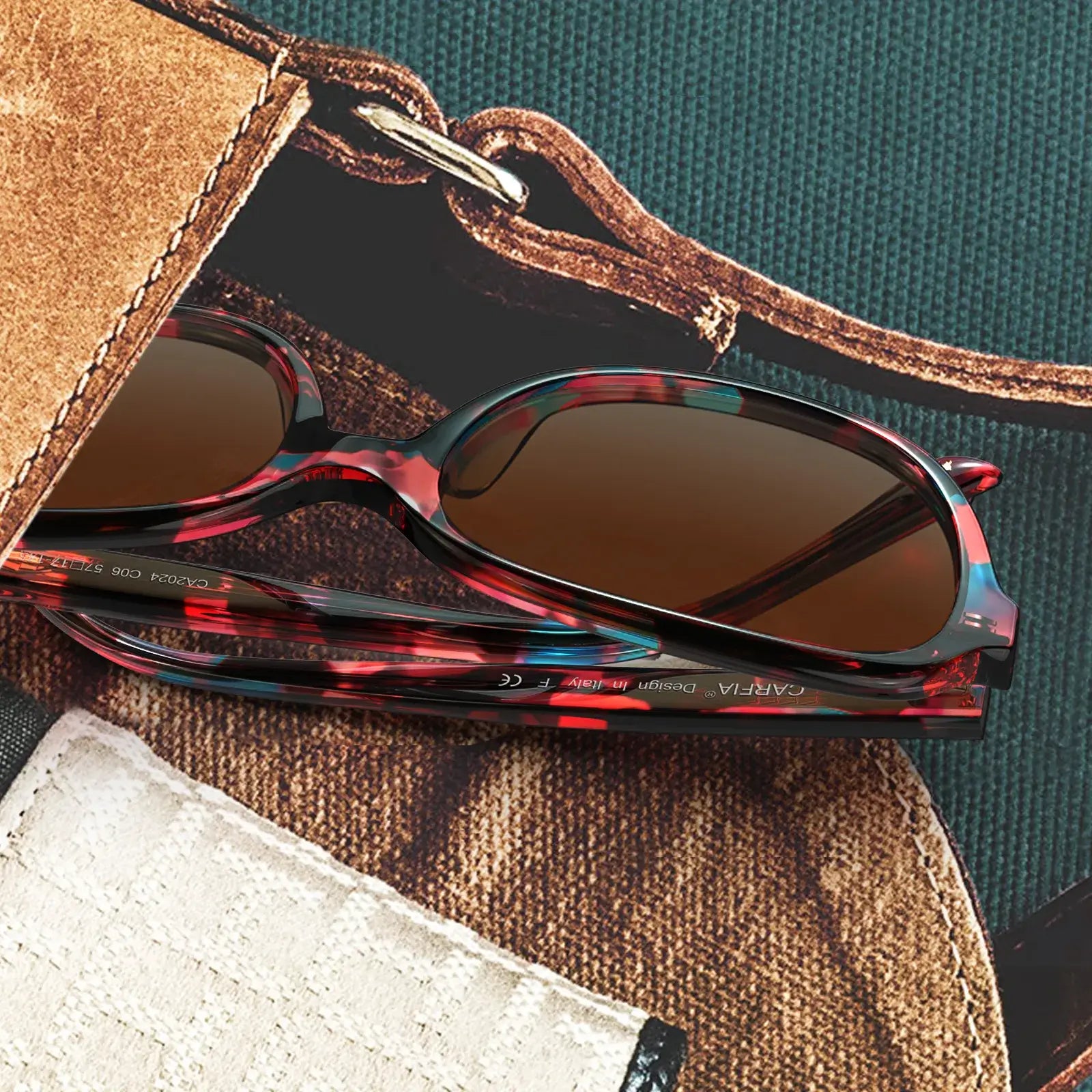 Ergonomic Construction Sun Glasses for Women - These polarized women's sunglasses offer enhanced lens coverage (with a lens width of 57mm) and a specialized lens curvature that provides perfect protection against sidelight. They are ideal for activities like golf, driving, and handling anything else that the sun presents!Polarized UVA, UVB Rays Protection - The lenses are highly effective at polarization, so your eyes won't be irritated by the brightness of the sunshine. Instead, it's a very soothing experience, allowing you to enjoy your daily life without having to squint.Real Expensive Acetate Eyewear - Carfia's hand-crafted cellulose acetate frames come with embedded patterns and feature a rich color finish, making them just as excellent as the world's most renowned brands. Because we believe that everyone should have the opportunity to wear high-quality eyeglasses.Hardware & Details - The three-barrel hinge adds durability to the frame's structure. The exclusive colors result in a unique pattern for each frame. These sunglasses are not only aesthetically pleasing for fashion but also great for protecting your eyes on sunny days, even if you have puffy eyes.Package Bonus✚✚✚ - ✔ Women's Sunglasses, ✔ Polarization Testing Card, ✔ Soft Lenses Wipe, ✔ 365 Days Free Replacement Card, ✔ Nice Leather Eyeglass Case, ✔ Hard Protection Box. It's 100% risk-free to try. In case of any issues, just contact the seller without hesitation, and they'll solve the problem to your satisfaction.