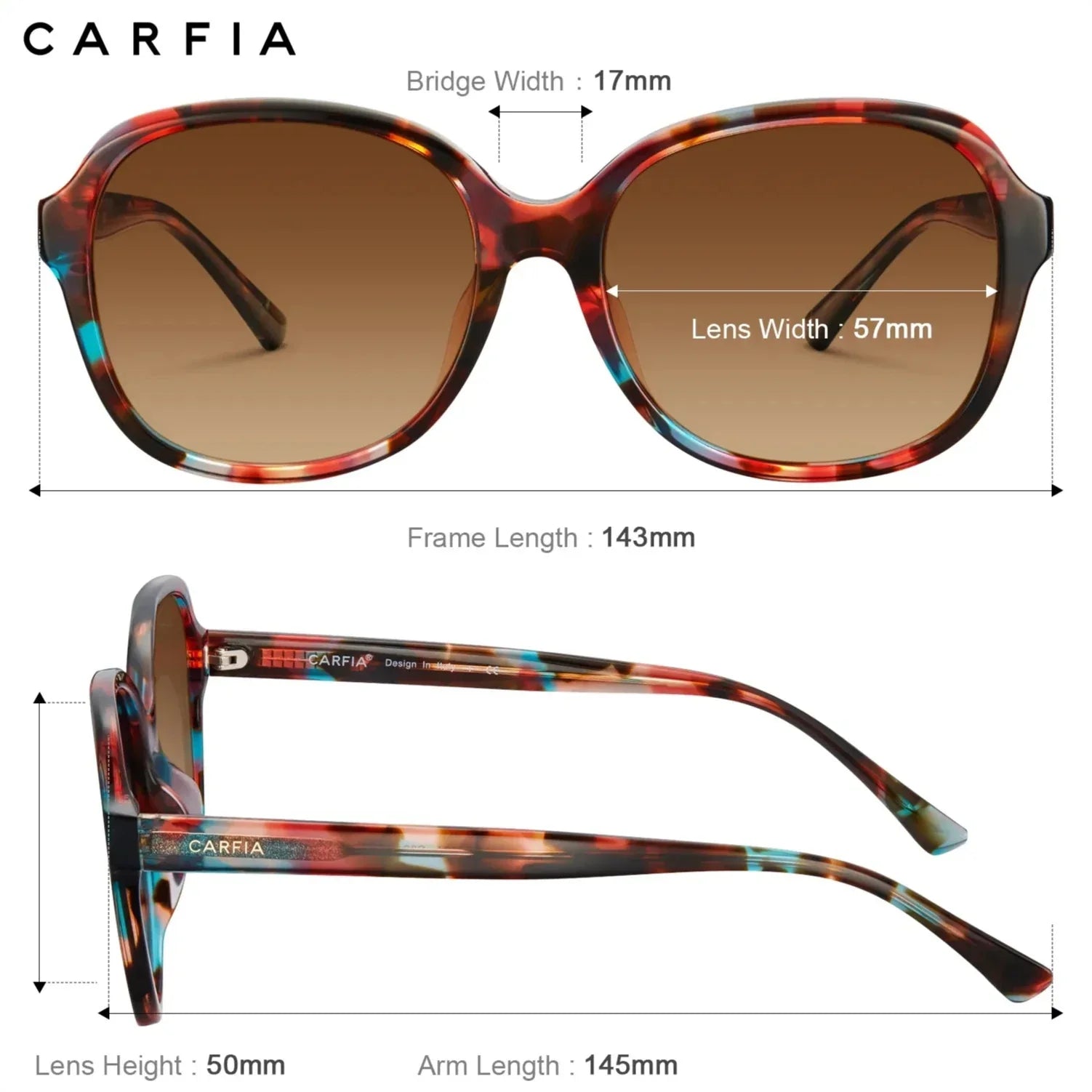 Ergonomic Construction Sun Glasses for Women - These polarized women's sunglasses offer enhanced lens coverage (with a lens width of 57mm) and a specialized lens curvature that provides perfect protection against sidelight. They are ideal for activities like golf, driving, and handling anything else that the sun presents!Polarized UVA, UVB Rays Protection - The lenses are highly effective at polarization, so your eyes won't be irritated by the brightness of the sunshine. Instead, it's a very soothing experience, allowing you to enjoy your daily life without having to squint.Real Expensive Acetate Eyewear - Carfia's hand-crafted cellulose acetate frames come with embedded patterns and feature a rich color finish, making them just as excellent as the world's most renowned brands. Because we believe that everyone should have the opportunity to wear high-quality eyeglasses.Hardware & Details - The three-barrel hinge adds durability to the frame's structure. The exclusive colors result in a unique pattern for each frame. These sunglasses are not only aesthetically pleasing for fashion but also great for protecting your eyes on sunny days, even if you have puffy eyes.Package Bonus✚✚✚ - ✔ Women's Sunglasses, ✔ Polarization Testing Card, ✔ Soft Lenses Wipe, ✔ 365 Days Free Replacement Card, ✔ Nice Leather Eyeglass Case, ✔ Hard Protection Box. It's 100% risk-free to try. In case of any issues, just contact the seller without hesitation, and they'll solve the problem to your satisfaction.