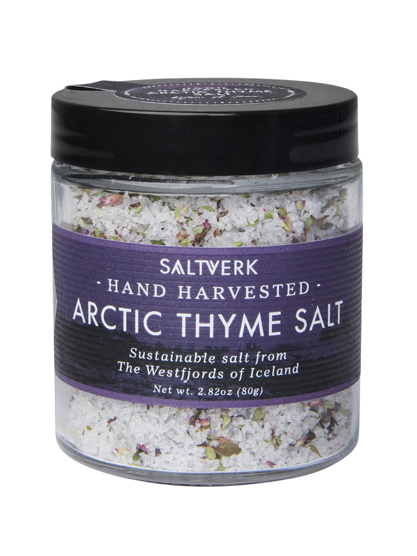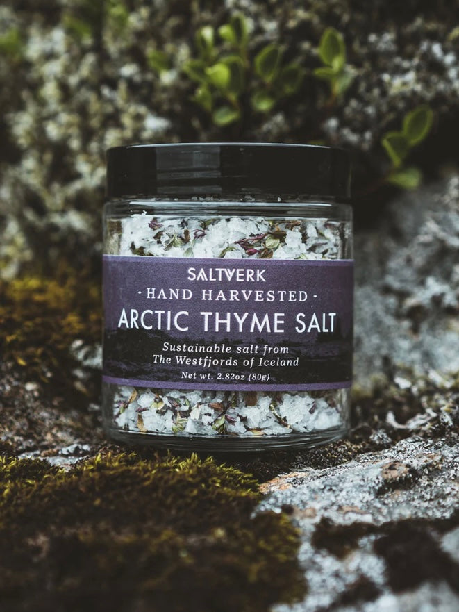 Saltverk Salz Arktischer Thymian aus Island ist eine Mischung kleiner Salzflocken mit wildem, isländischem Thymian. Das blumige Aroma des arktischen Thymians, der bevorzugt auf Kiesböden und in trockenen Heideflächen wächst, erinnert an den Duft eines Sommerregens in islands wilder Natur. Das Salz für diese Melange wird manuell gewonnen und ist ein reines Naturprodukt das die Mineralien des nordischen Eismeers enthält.