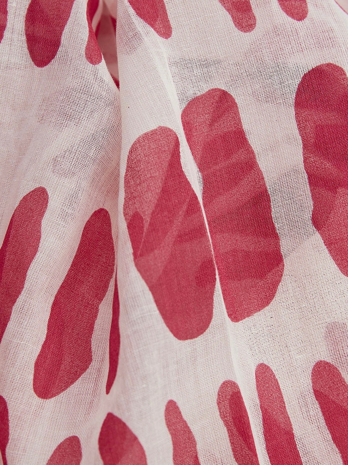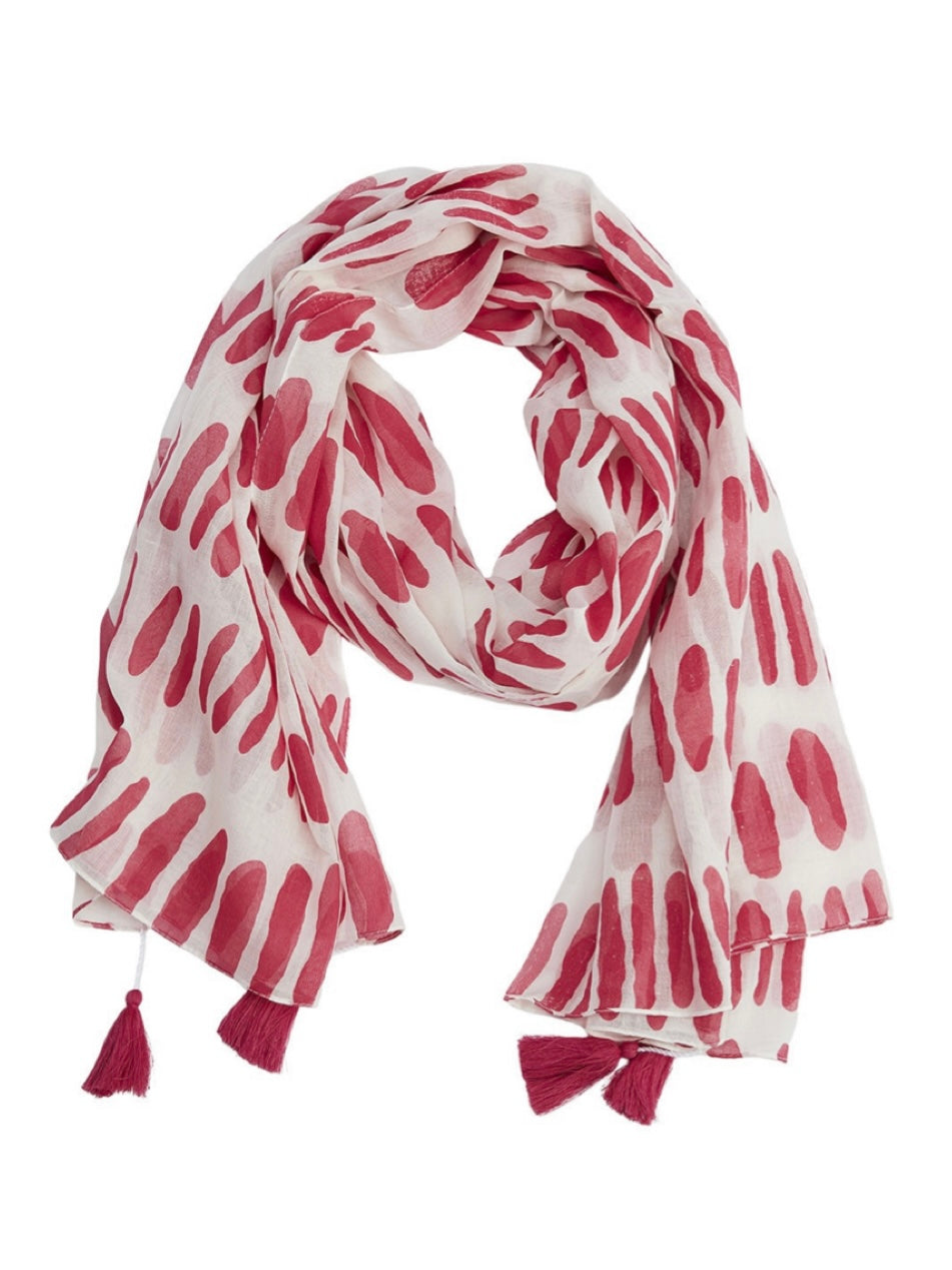 Farbenfroher Modeschal mit bedruckten Pinselstrichen aus reiner Baumwolle mit je 2 roten Troddeln an den Abschlüssen. Er lässt sich ideal zu Kleidern und Shirts kombinieren.