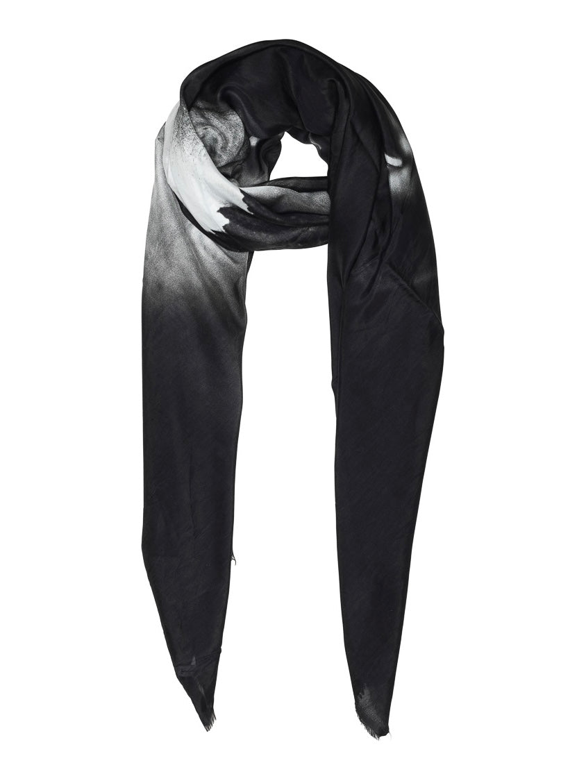 Hochwertiger Modeschal aus einer edlen Baumwolle/Seide Mischung mit einem Fantasiemuster in schwarz/weiß. Die offenen Kanten sind Teil des Designs. Perfekt zu kombinieren.