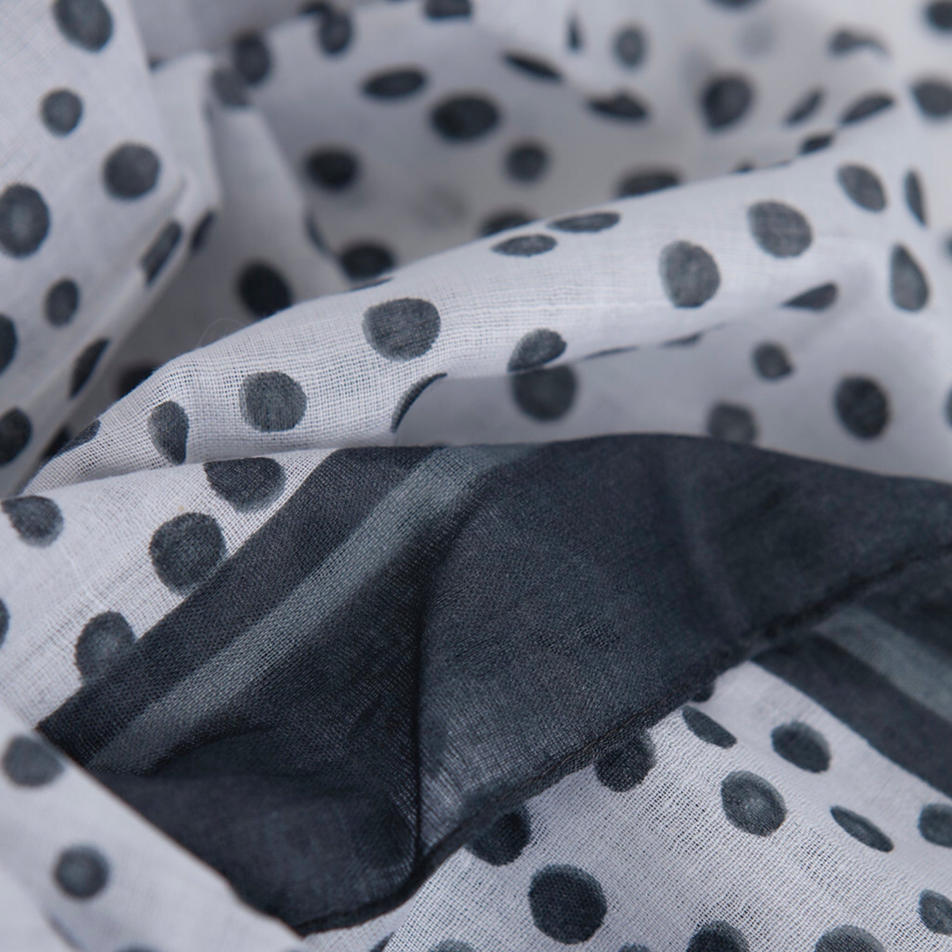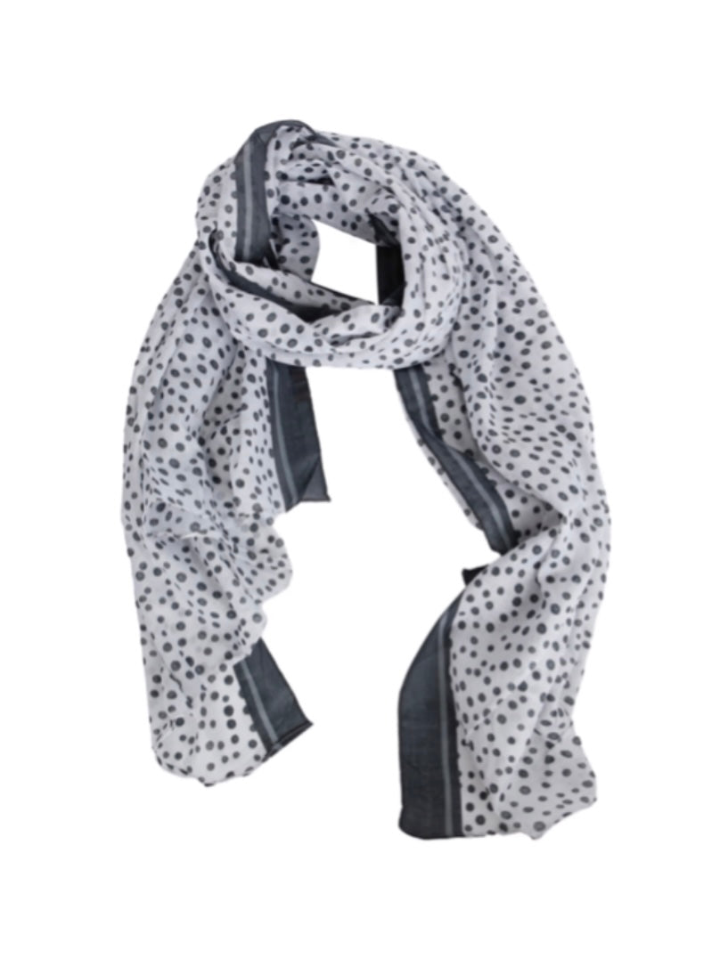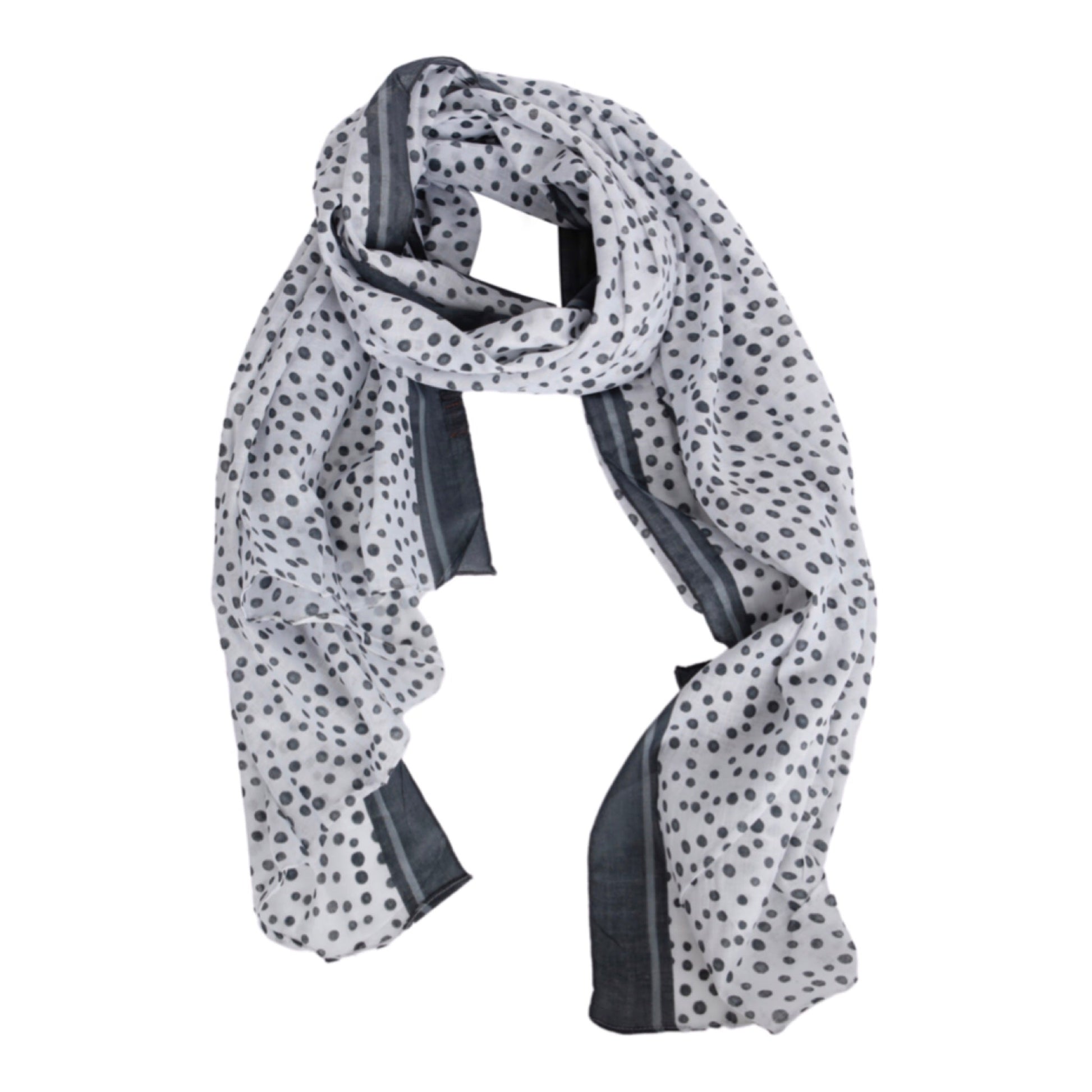 Edler Modeschal mit einem Pünktchenmuster und einer dunkelgrauen Abschlusskante. Er ist aus einer soften Baumwollqualität gearbeitet und lässt sich ideal kombinieren.