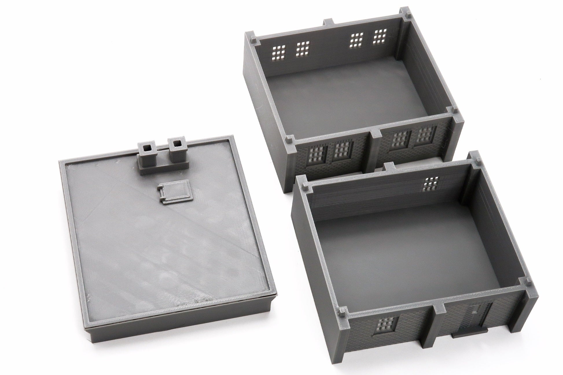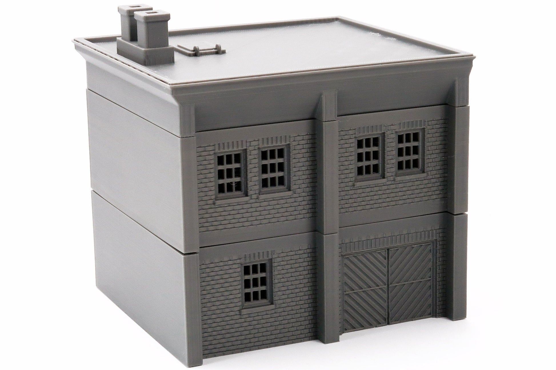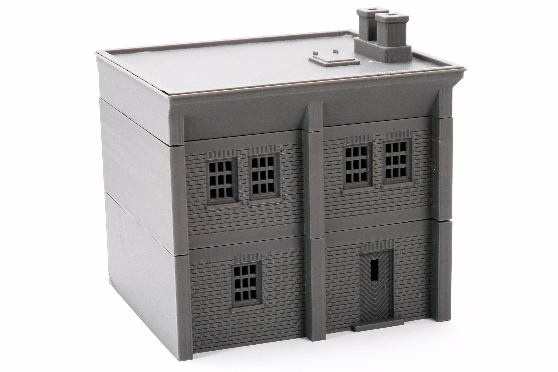 All buildings are unpainted and unprimed. I do the cleanup, but some tiny fibers may still be present. It may come in grey or black. Each building is created from stackable sections as shown in the images.