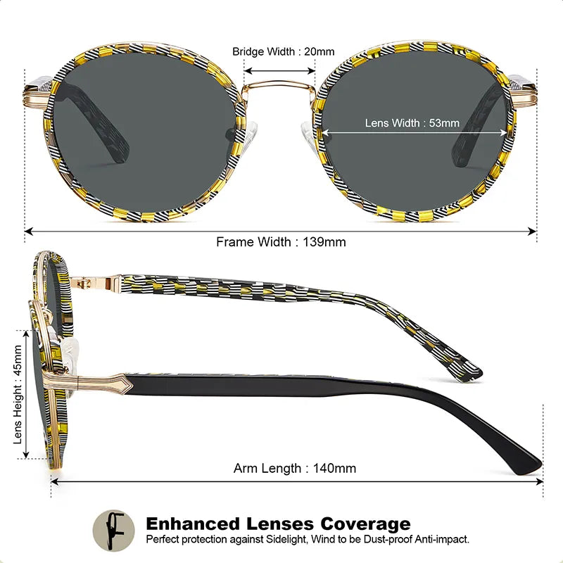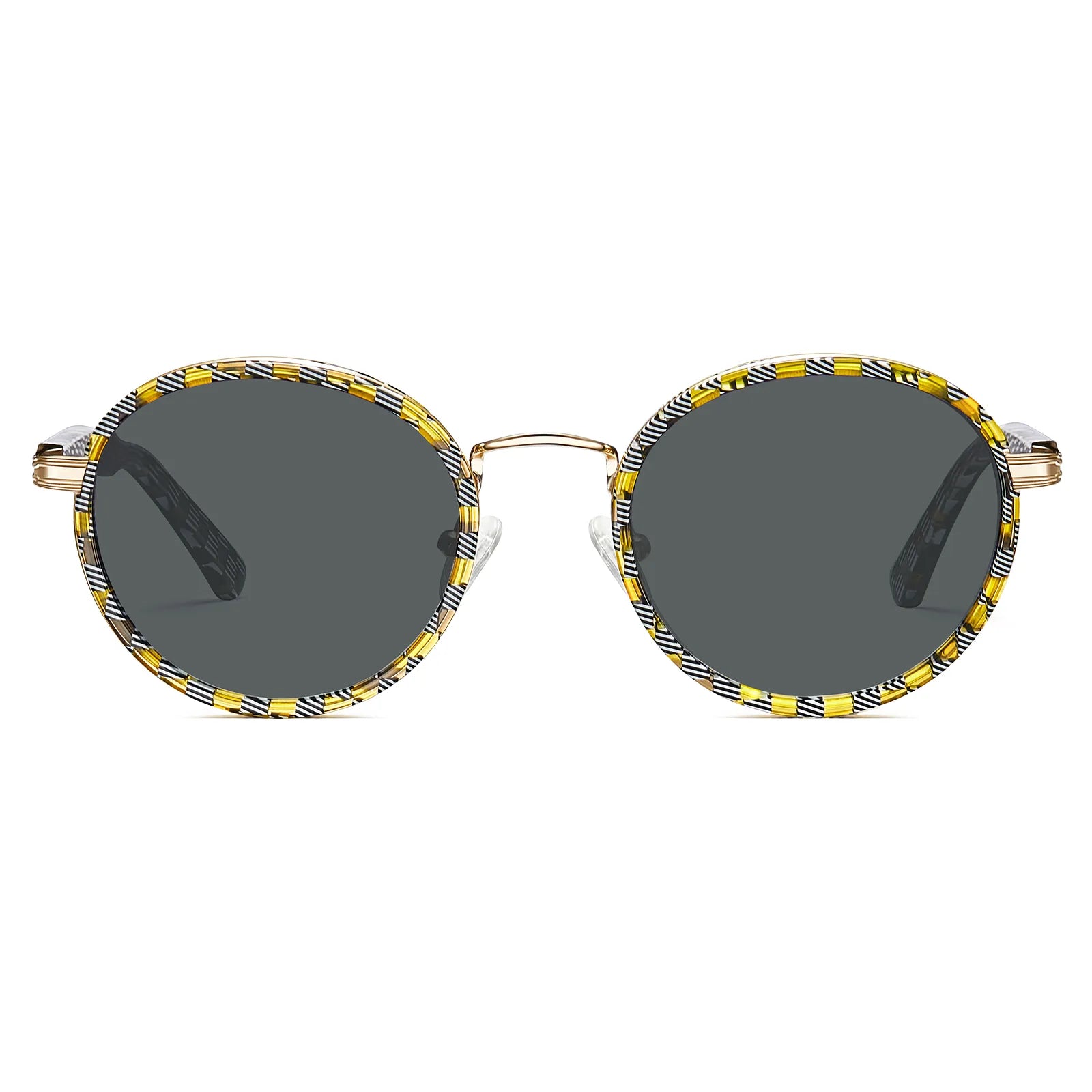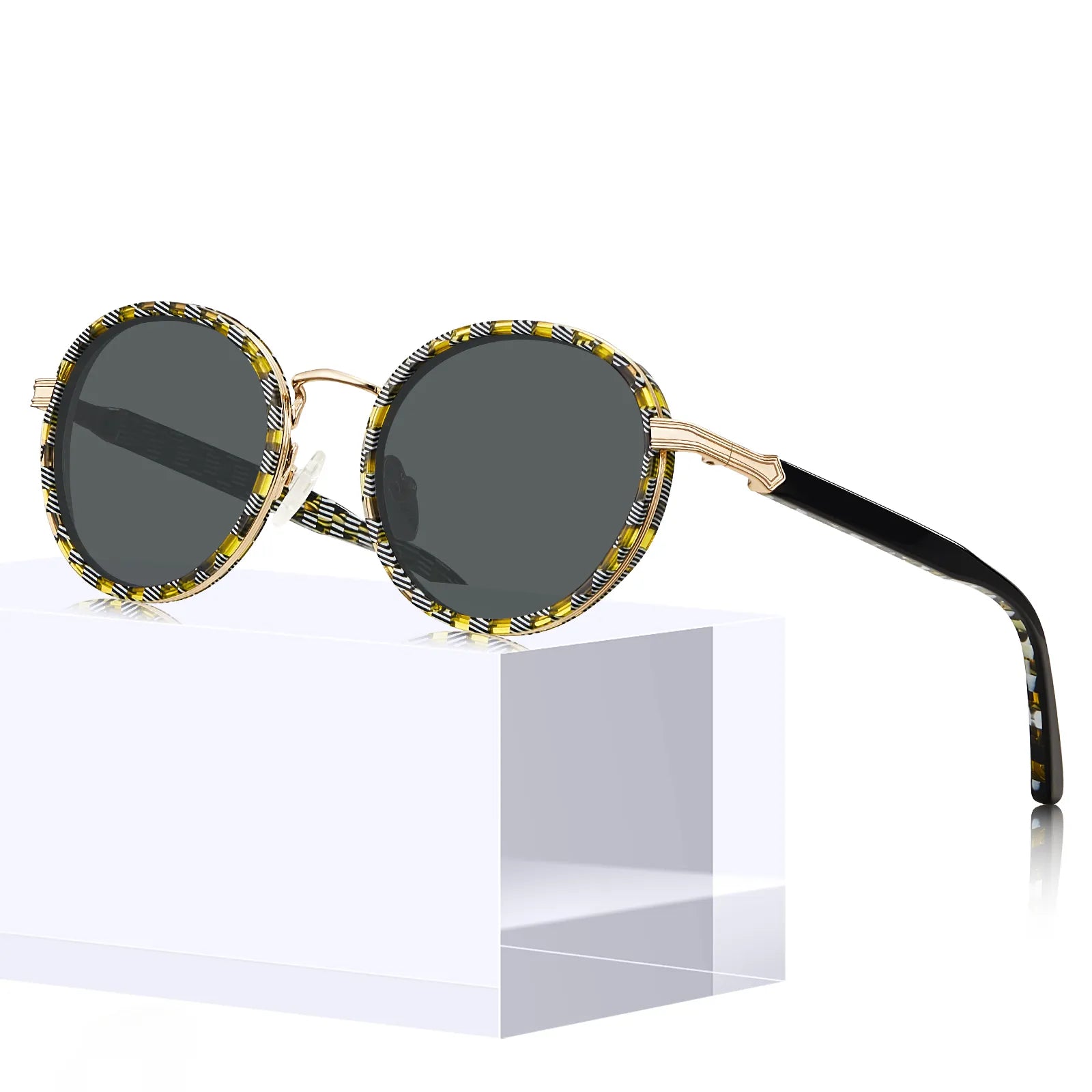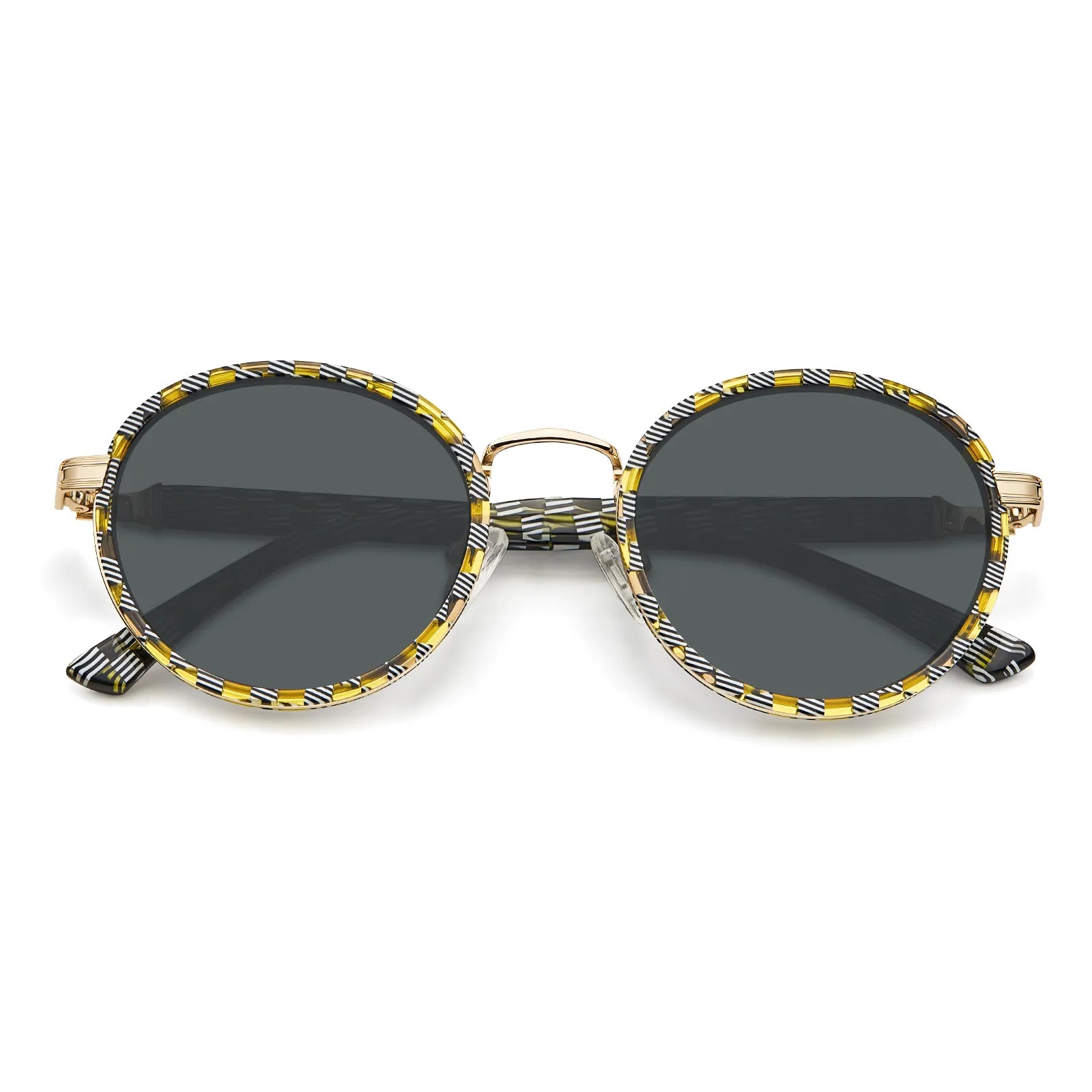 ELEGANT WOMEN SUNGLASSES: This is a mixed-material round frame with a very unique frame construction. It features a gold metal structure contrasted with a polished acetate frame, with elegant metal details and a shiny, luxurious look.