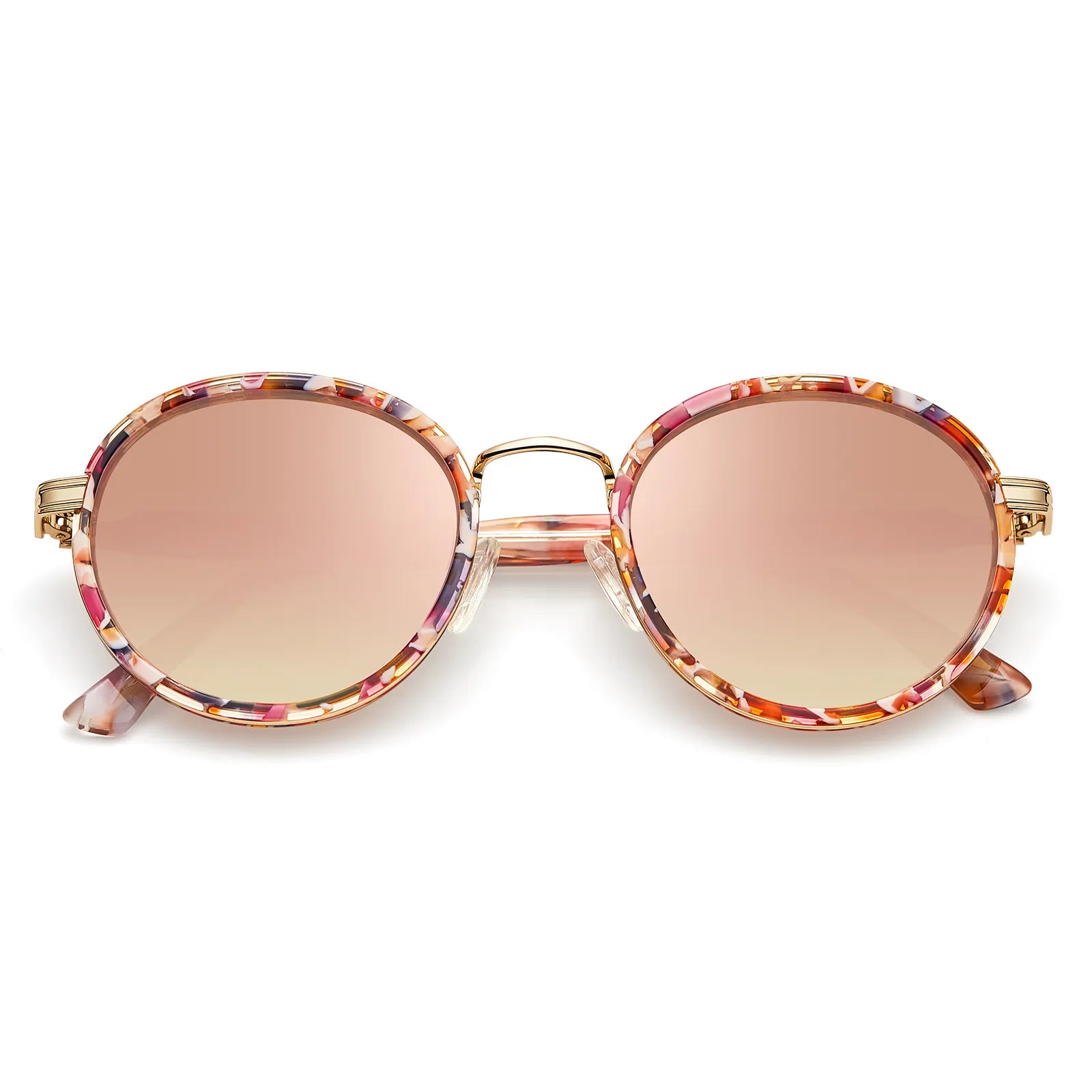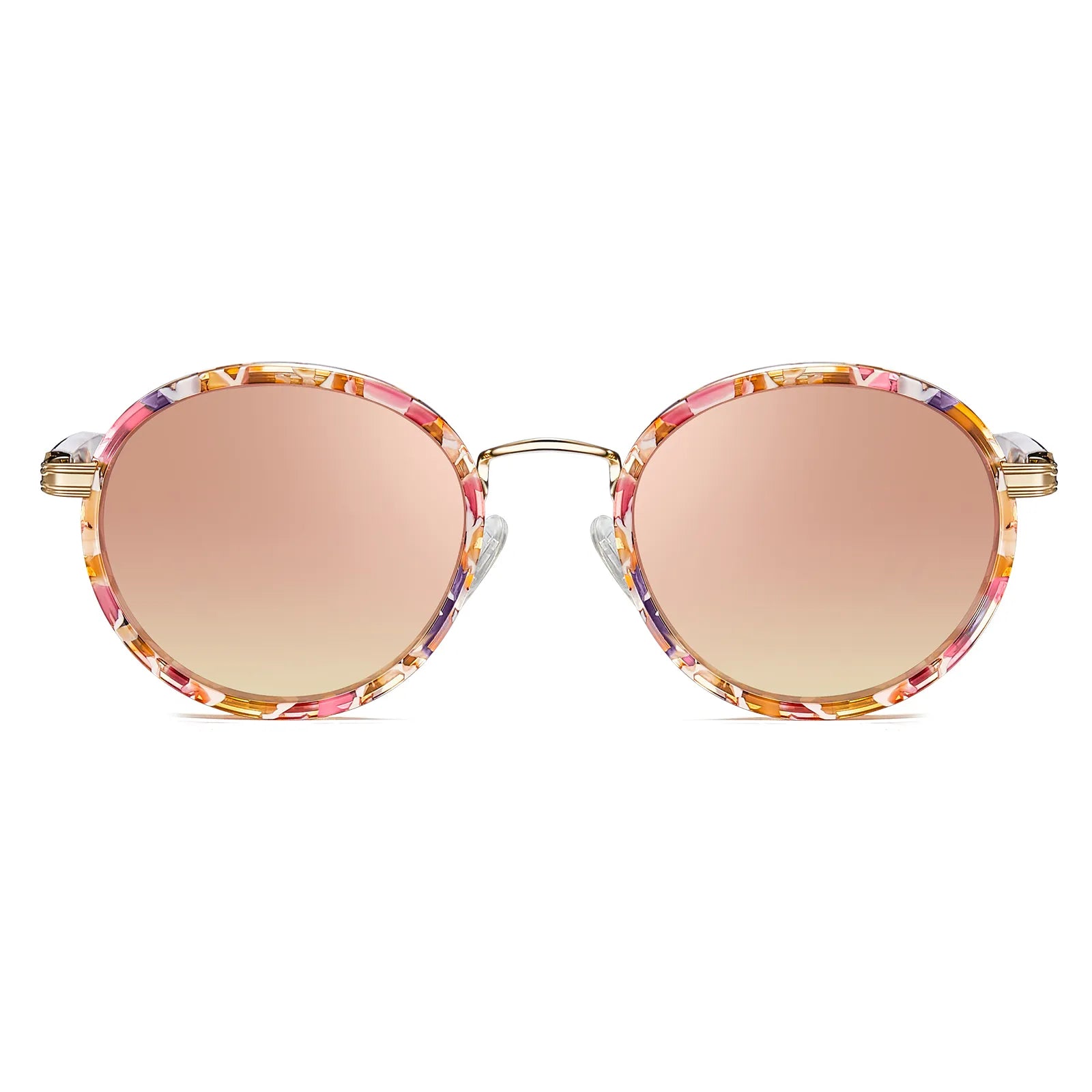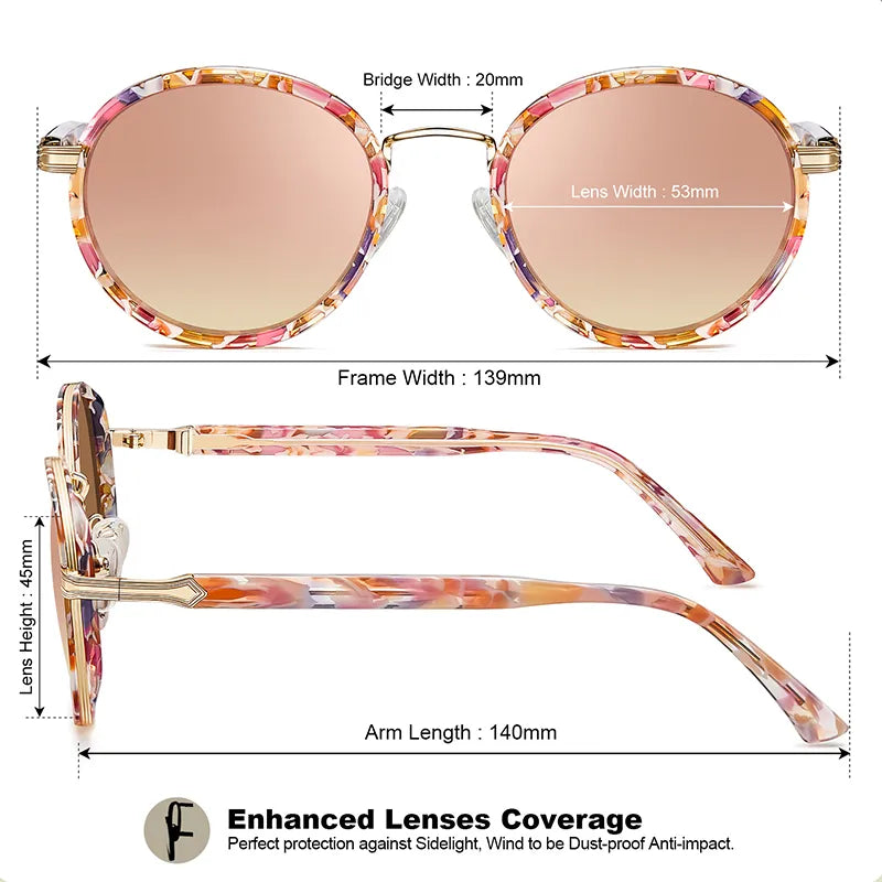 ELEGANT WOMEN SUNGLASSES: This is a mixed-material round frame with a very unique frame construction. It features a gold metal structure contrasted with a polished acetate frame, with elegant metal details and a shiny, luxurious look.