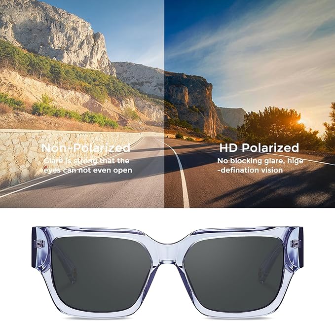 - UV400 & POLARIZED: CARFIA polarized lenses block 100% of all UV light including UVA and UVB. It also can cut reflected glare from sunlight that bounces off shiny surfaces like pavement, water or snow, reducing eye strain and enhancing clarity of view.