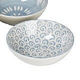 Müslischale mit verschiedenen Dessins in hellblau aus Steingut. Die passenden Kaffeebecher und Dessertteller werden ebenfalls angeboten. Für den Geschirrspüler und die Mikrowelle geeignet. Auch als 3er Set erhältlich.