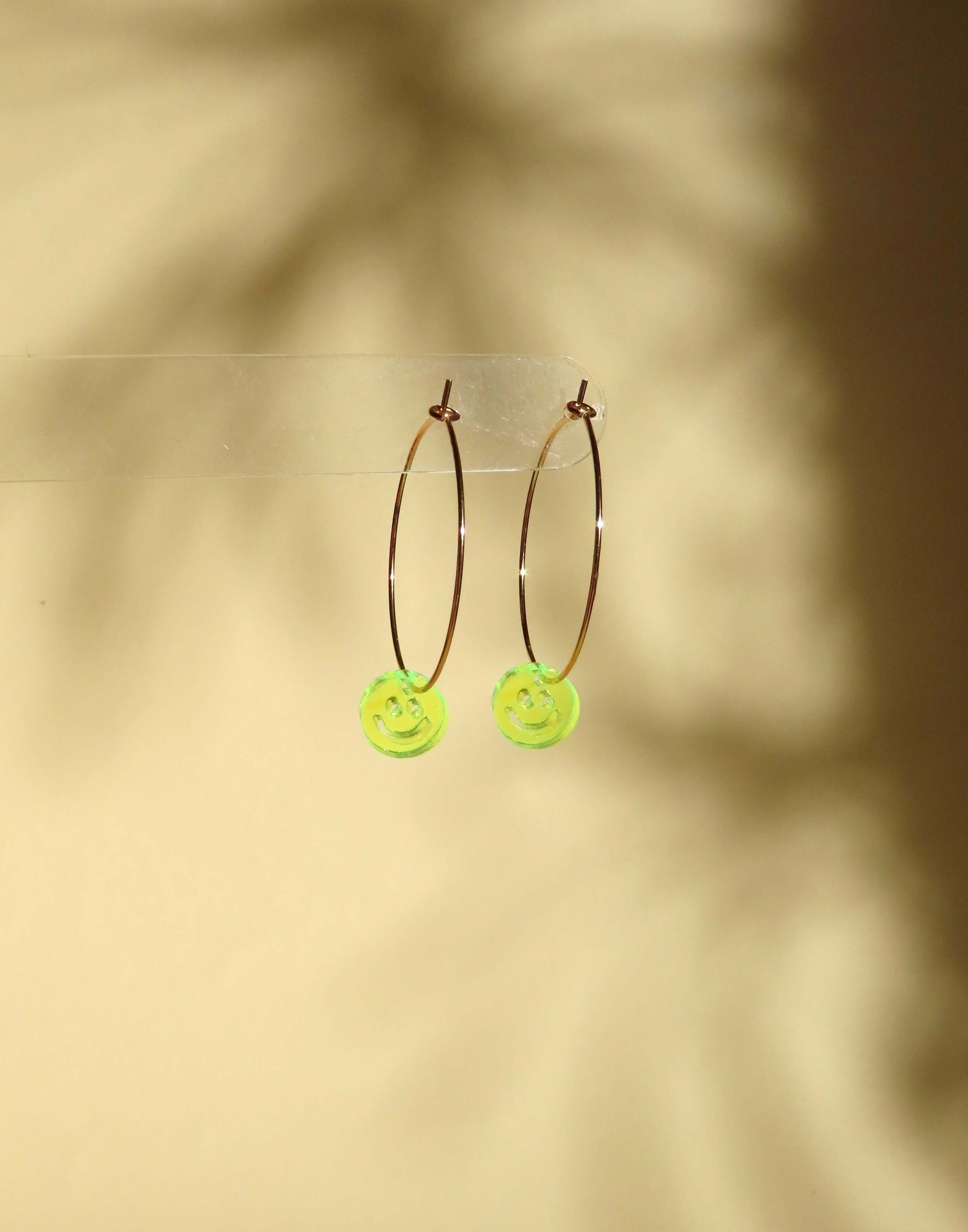 An den schlichten schicken Edelstahl-Creolen hängen runde Acrylanhänger in kräftigem Neon-Gelb, die durchsichtig schimmern und mit einem Lächeln verziert sind.