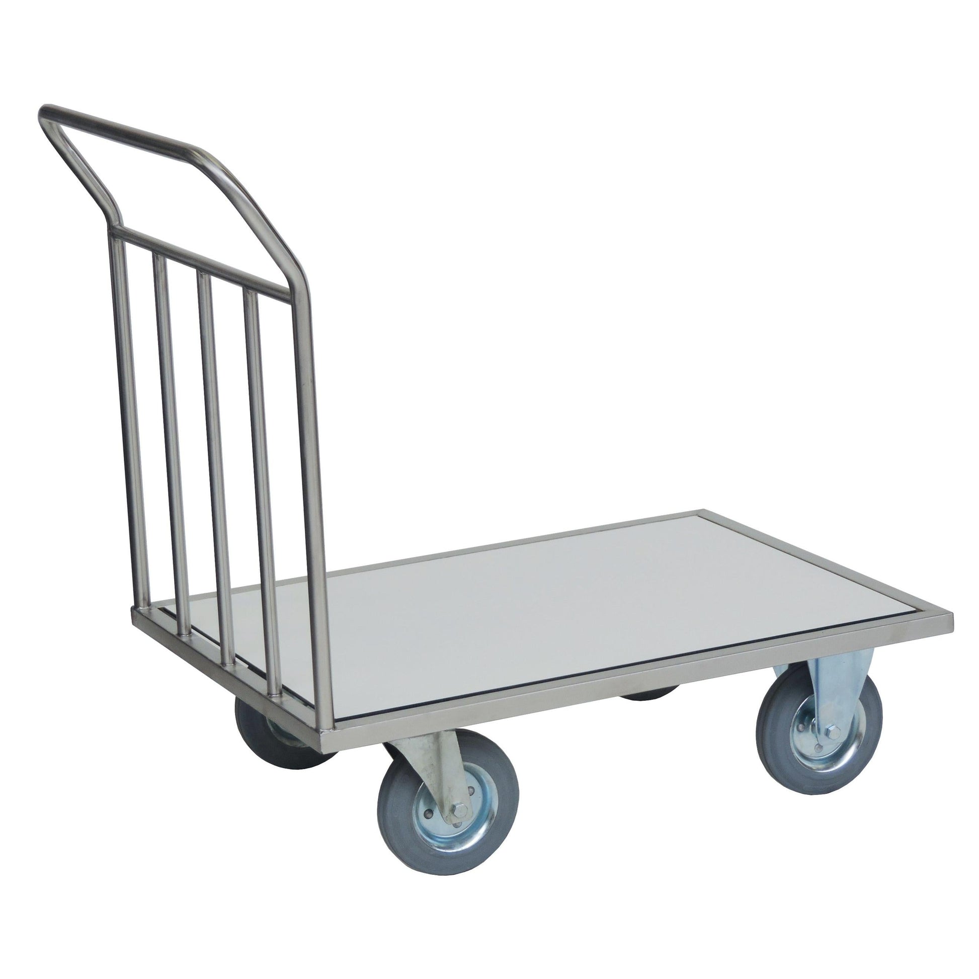 Hochwertiger Stirnwandwagen aus Edelstahl mit verschweißten Rohrverbindungen.