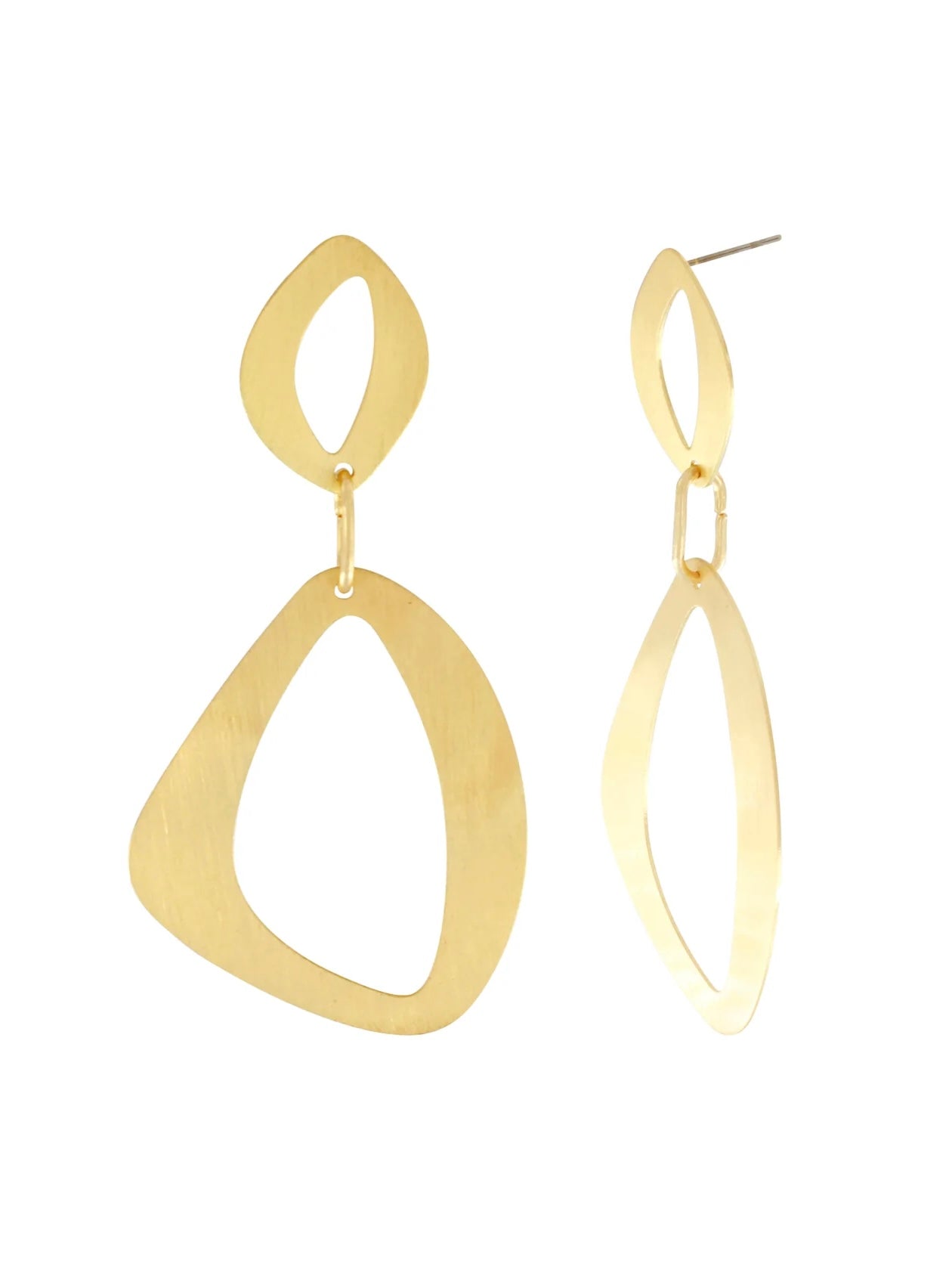 Feminine Ohrhänger mit 2 miteinander verbundenen, asymmetrisch geformten Kettenelementen in gebürsteter Optik und aus matt versilbertem oder vergoldeten Messing.