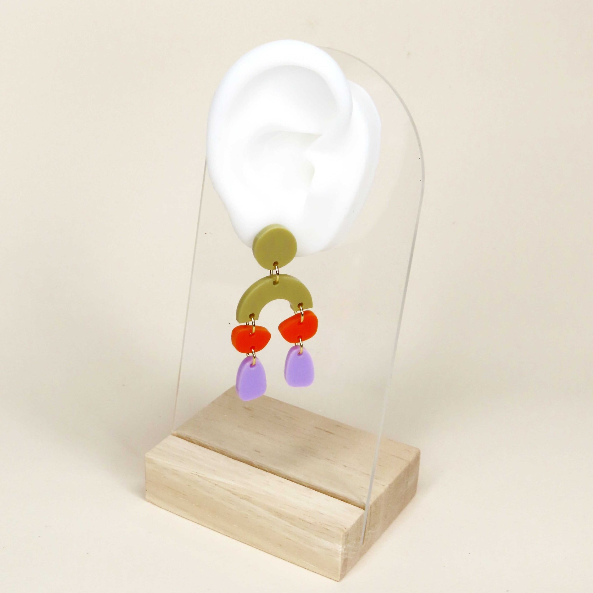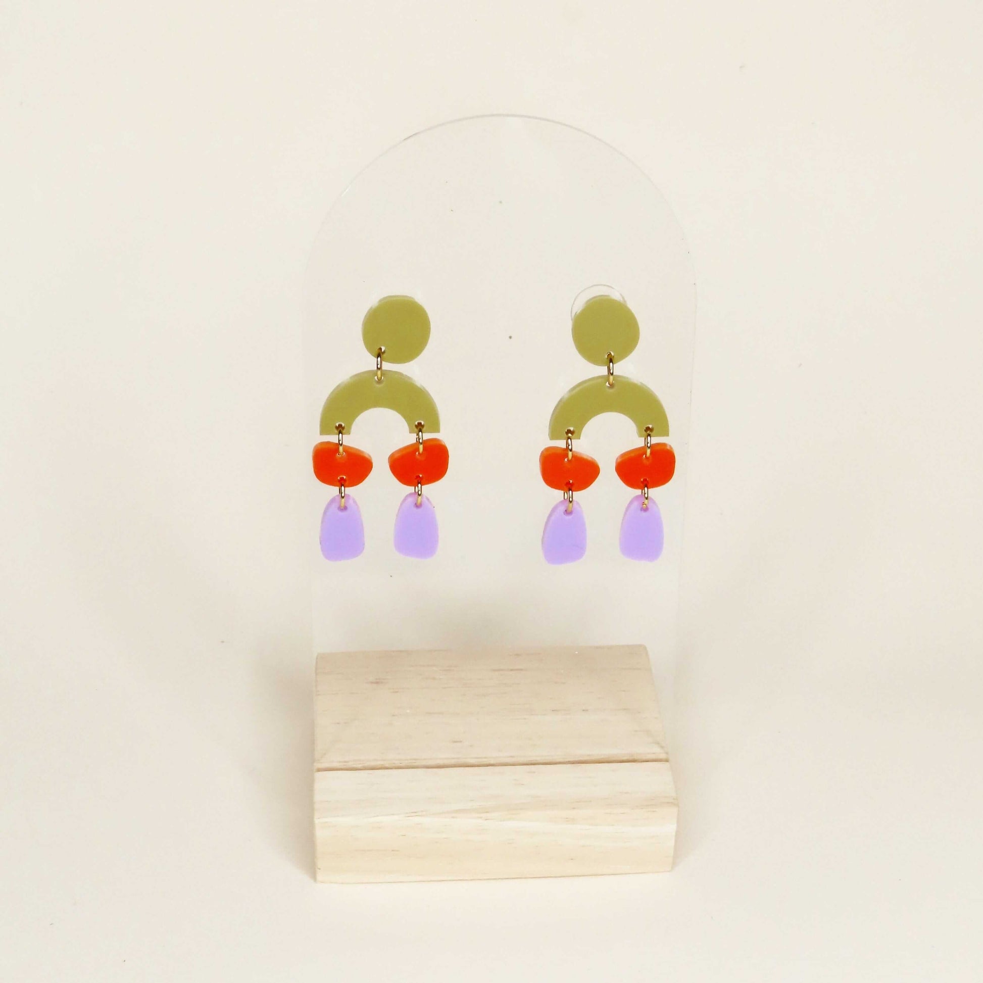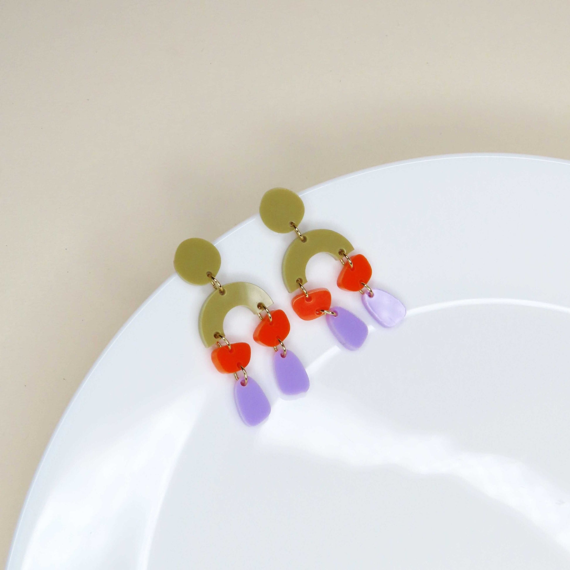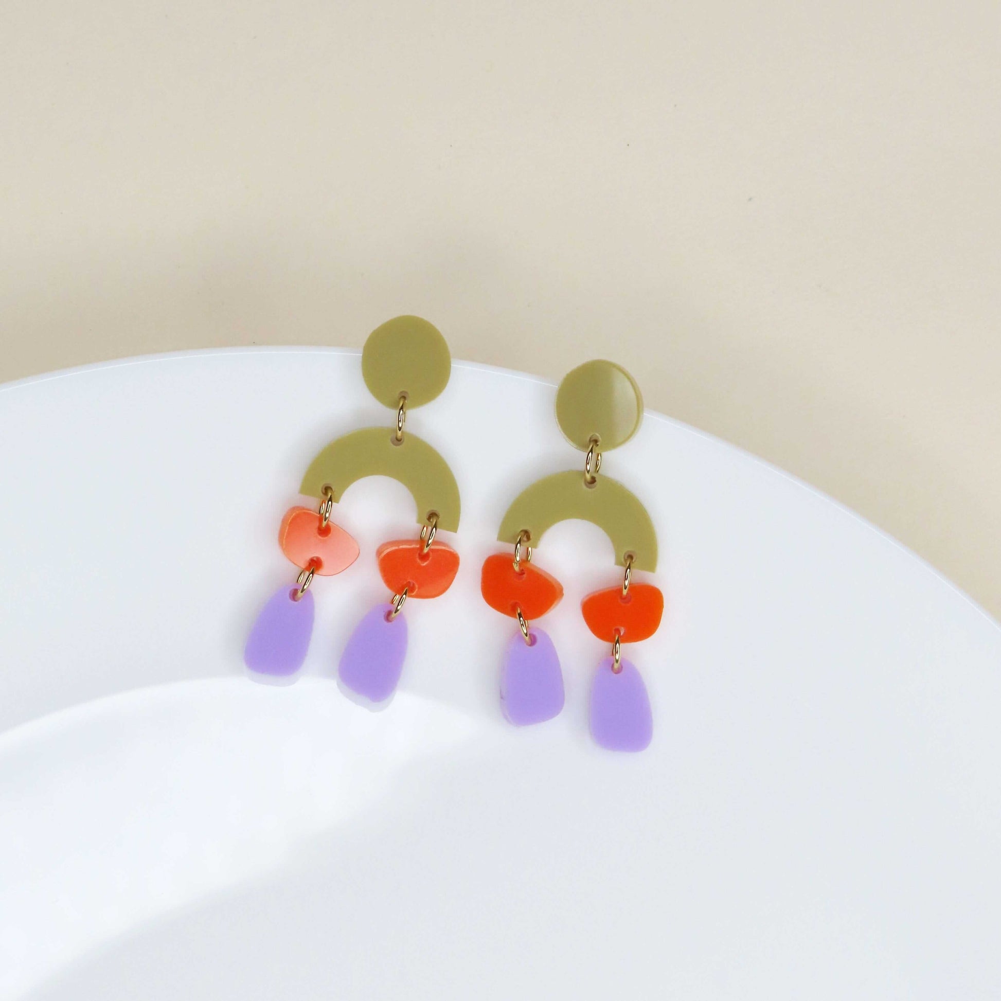 Unsere „Ophelia“ Ohrringe spielen mit spannenden Formen und starken Farben. Oben sitzt ein runder Stecker in Olivgrün, darunter ein halbkreisförmiges Element in derselben Farbe als grafische Basis. Daran hängen kleine Acryl-Elemente in leuchtendem Orange und längliche Formen in zartem Flieder.