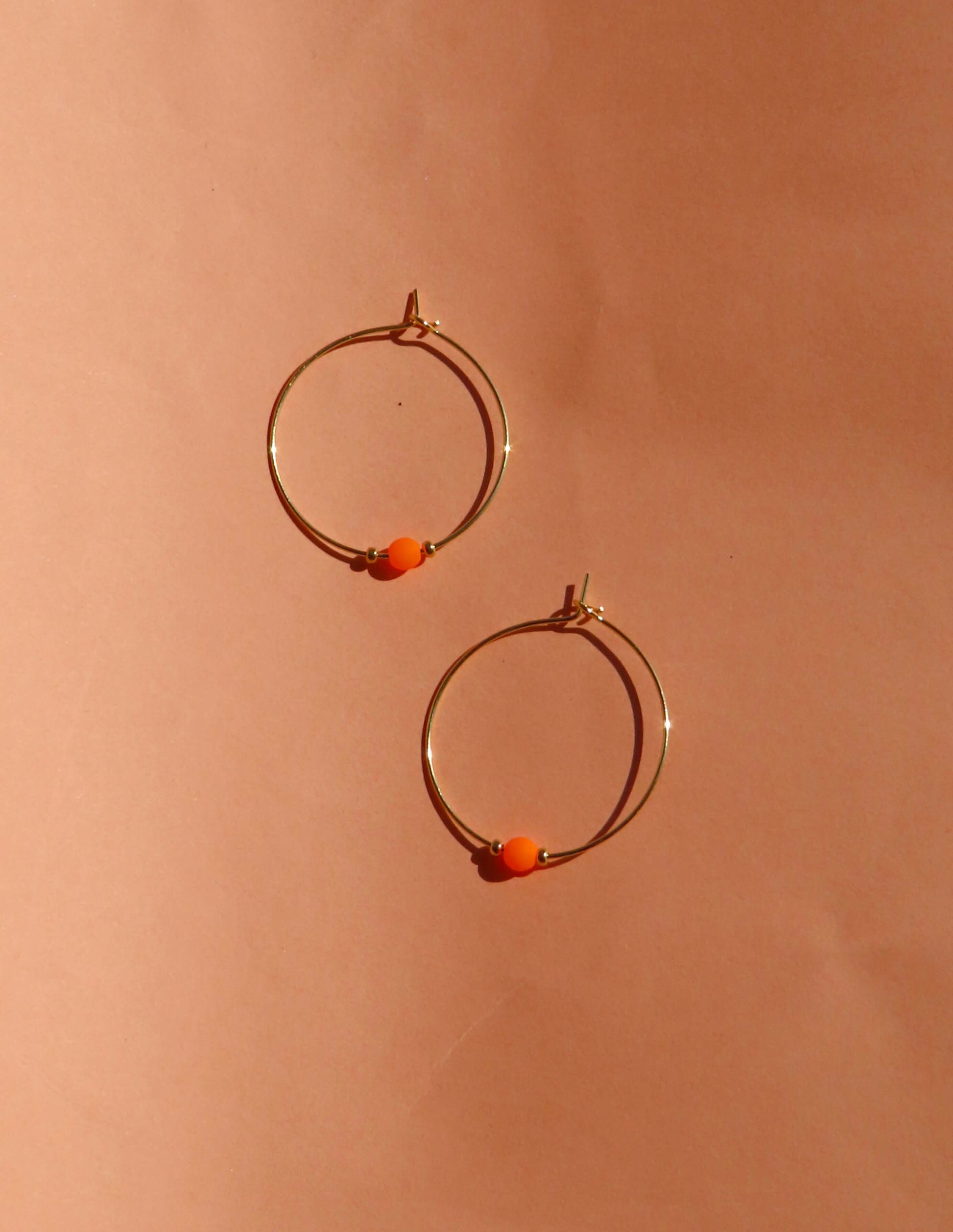 Die Creolen setzen auf eine elegante, minimalistische Form: ein feiner goldfarbener Edelstahl-Reifen, der durch seine schlichte Linie am Ohr fast schwebend wirkt. Als Highlight hängt mittig eine runde Glasperle in kräftigem Neon-Orange – sie bringt sofort Power und ein leuchtendes Farbhighlight ins Design.