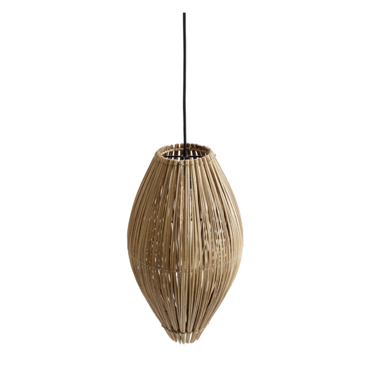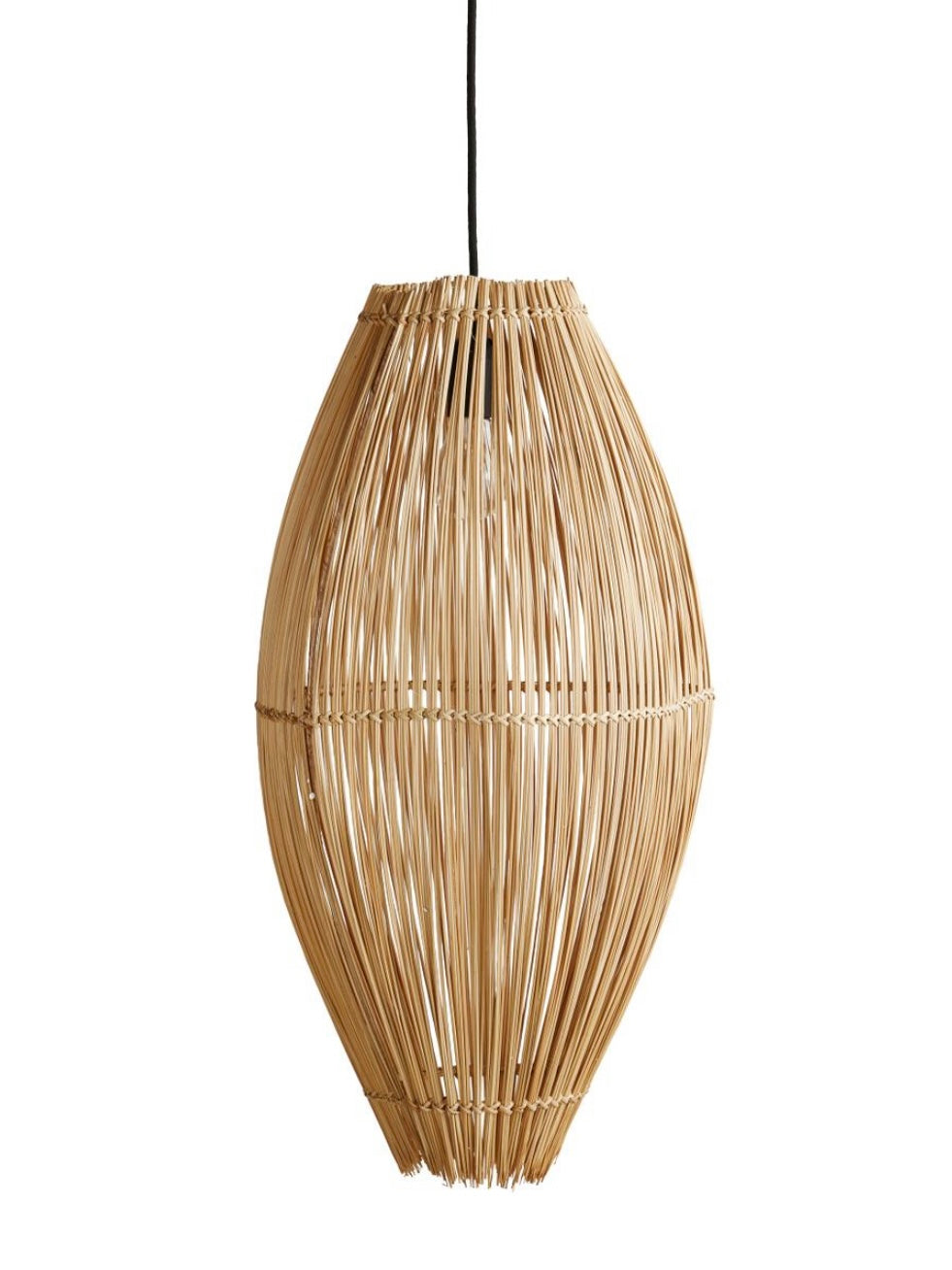 Besonders dekorative Pendelleuchte aus Bambusstäben. Die Form erinnert an eine Fischreuse. Das Licht wird durch die feinen Schlitze dezent gebrochen und sorgt für ein stimmungsvolles Ambiente.