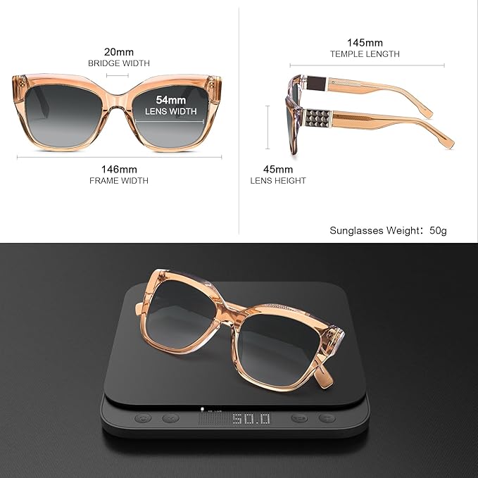 - High Quality Materials】- Crafted from Italian imported acetate, each pair of eyewear boasts a unique pattern and is meticulously handmade. After an exacting polishing process, the colors remain vibrant and fade-resistant. Robust yet chic, it's the ideal choice for women who value both durability and aesthetics. While the market average for glasses is around 25 grams, our glasses weigh 50 grams due to the use of premium acetate fiber, ensuring a perfect cat-eye shape.