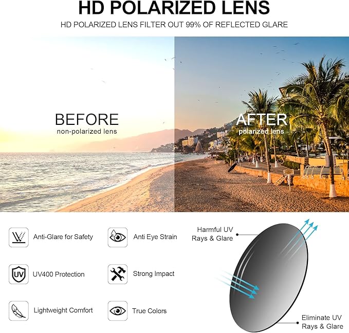 - 【Protect Your Eyes】- HD polarized lenses ensure 100% UV protection, reduce glare for clear vision on sunny or cloudy days. Say goodbye to squinting and embrace comfort during all your outdoor activities, like driving, shopping, beach vacation or photography. You can fully enjoy your moment with clarity and ease.