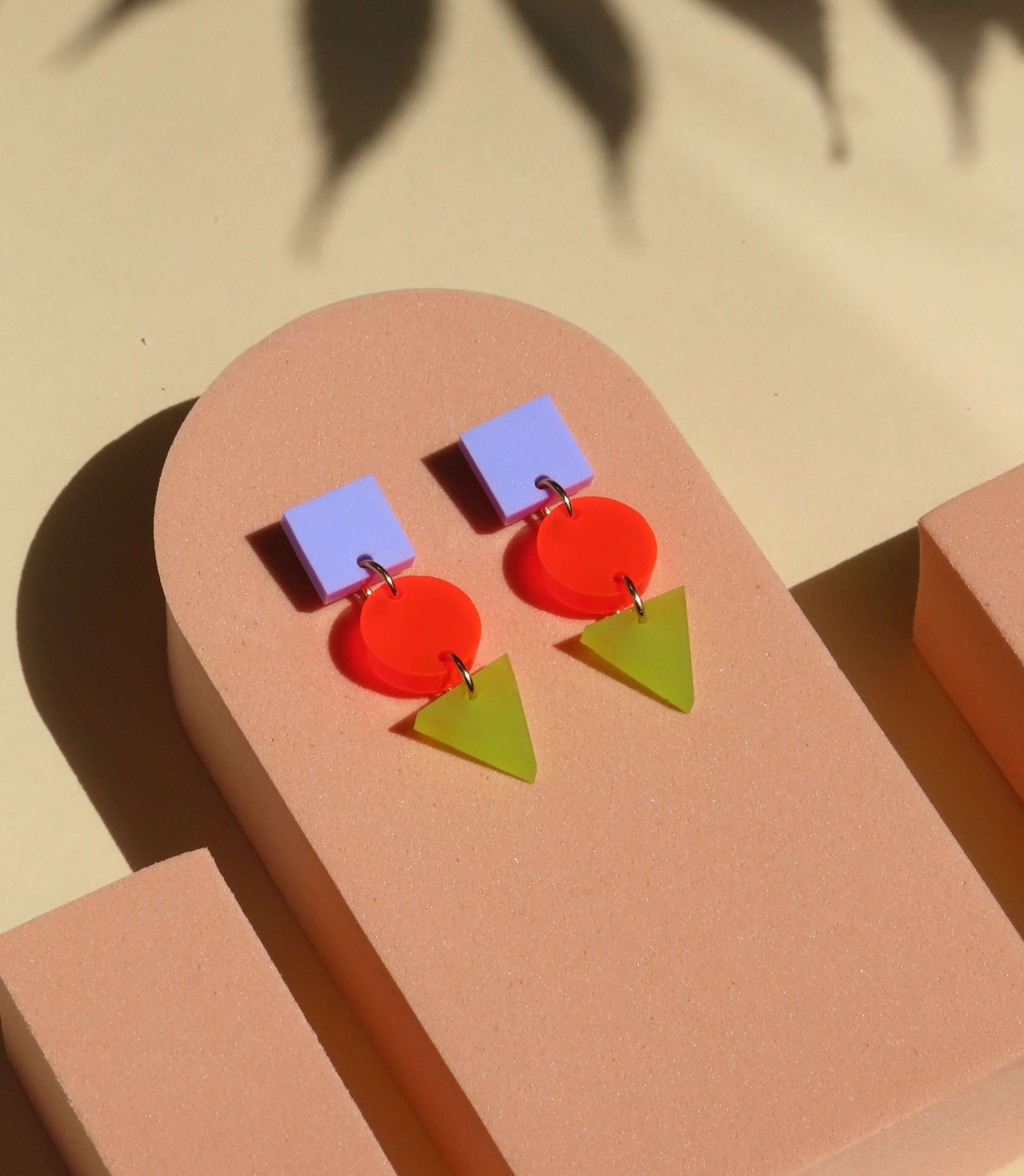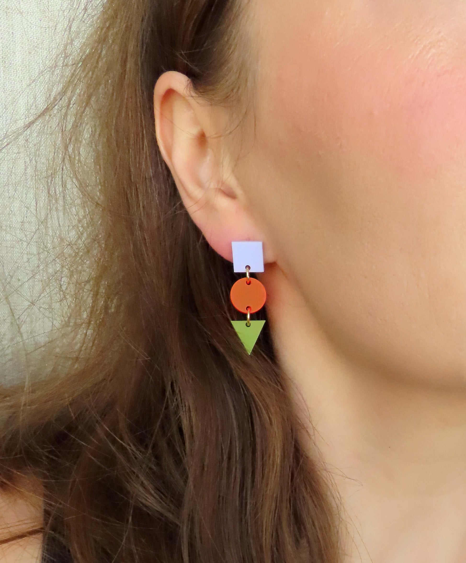 Die geometrischen Grundformen – Quadrat, Kreis und Dreieck – wirken fast wie ein kleines Baukastensystem am Ohr und erzeugen einen modernen, spielerischen Look. Durch die strahlenden Farben entsteht ein fröhlicher Mix: das ruhige Flieder bringt Balance, das Neon-Orange sorgt für Power, das Limettengrün setzt einen frechen Akzent.
