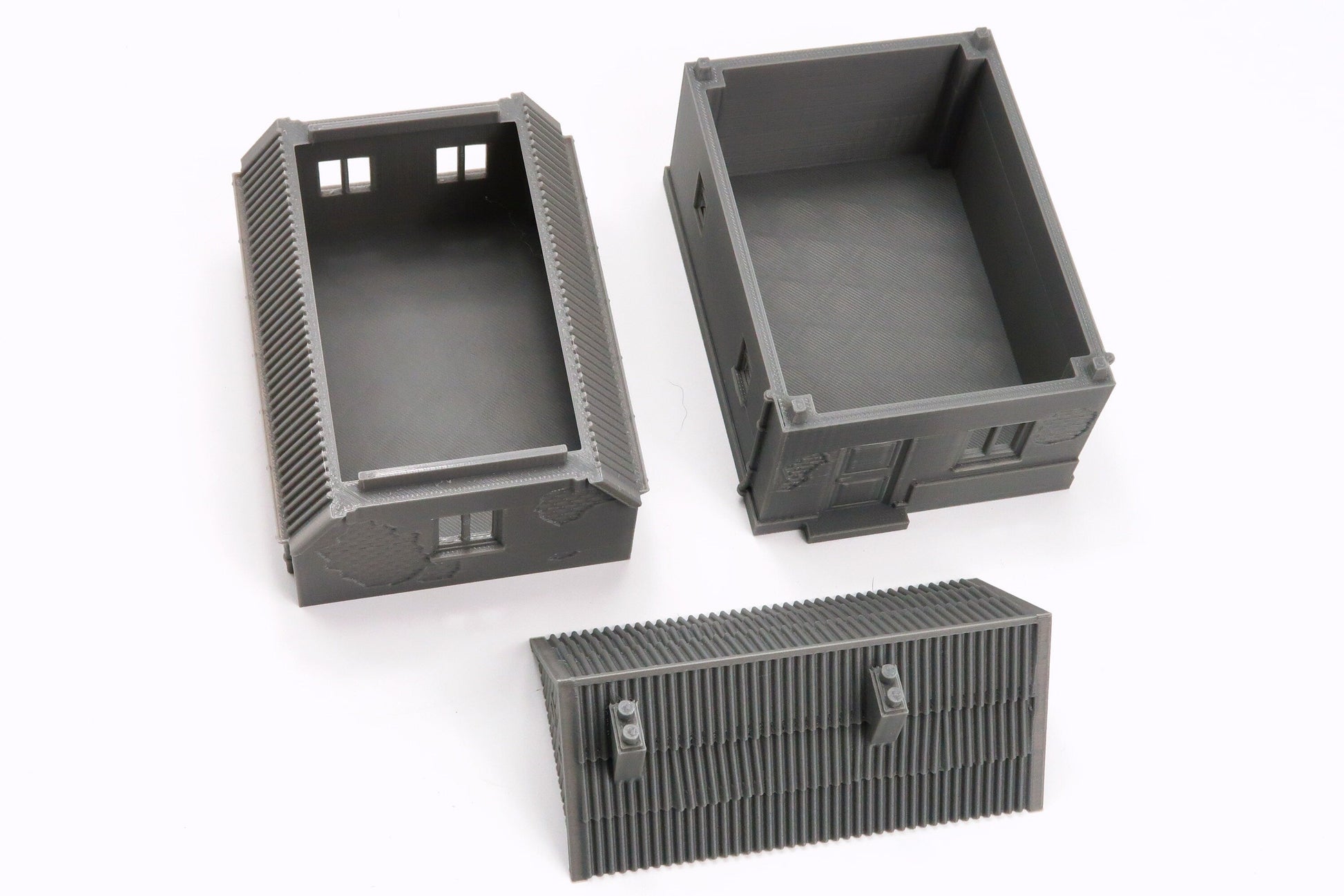 All buildings are unpainted and unprimed. I do the cleanup, but some tiny fibers may still be present. It may come in grey or black. Each building is created from stackable sections as shown in the images.