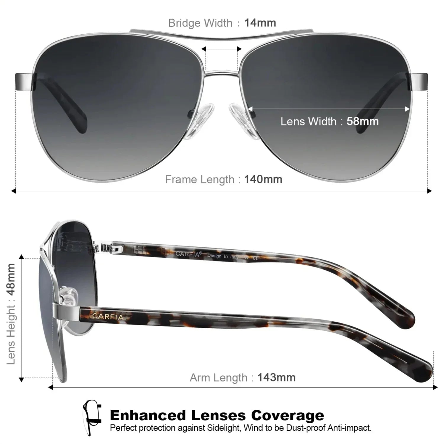 Big Sunglasses 58mm/2.28 inches - The enhanced lens curvature provides better protection against sidelight, along with being wind and dust-proof and anti-impact. They are perfect for outdoor activities such as being at the lake, playing golf, driving, and handling anything else that the sun presents. Carfia pilot sunglasses are ideal for an on-the-go active lifestyle and are flattering to all face shapes.