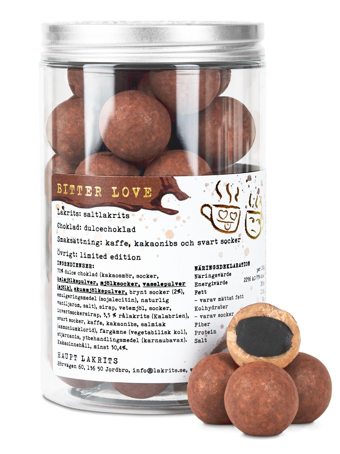 Zutaten: 70 % Dulce-Schokolade (Kakaobutter, Zucker, VOLLMILCHPULVER, MILCHZUCKER, MOLKEPULVER (MILCH), MAGERMILCHPULVER, brauner Zucker (2 %), Emulgator (SOJALECITHIN), natürliches Vanillearoma, Salz), Sirup, WEIZENMEHL, Zucker, Invertzuckersirup, 3,5 % Süßholz (Kalabrien), schwarzer Zucker, Kaffee, Kakaonibs, Ammoniumchlorid, Farbe (Pflanzenkohle), Sternanis, Überzugsmittel (Carnaubawachs). Mindestens 30,4 % Kakaogehalt