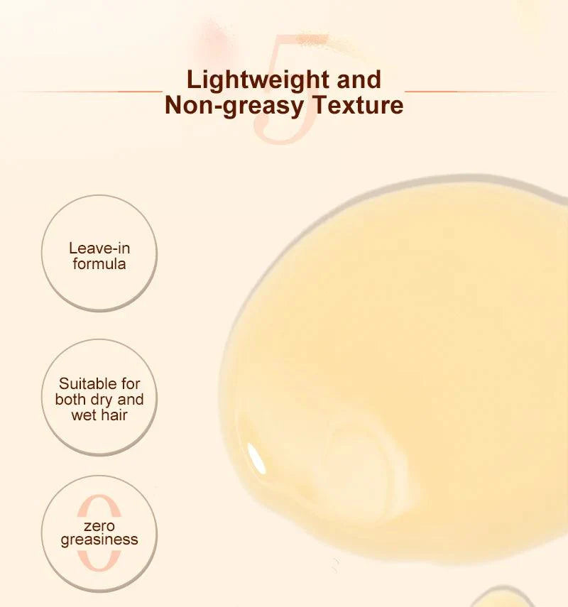This product contains a blend of four natural hair care oils, red safflower glucoside, and small molecule protein complex, zero-second wait, making your hair instantly soft and smooth.