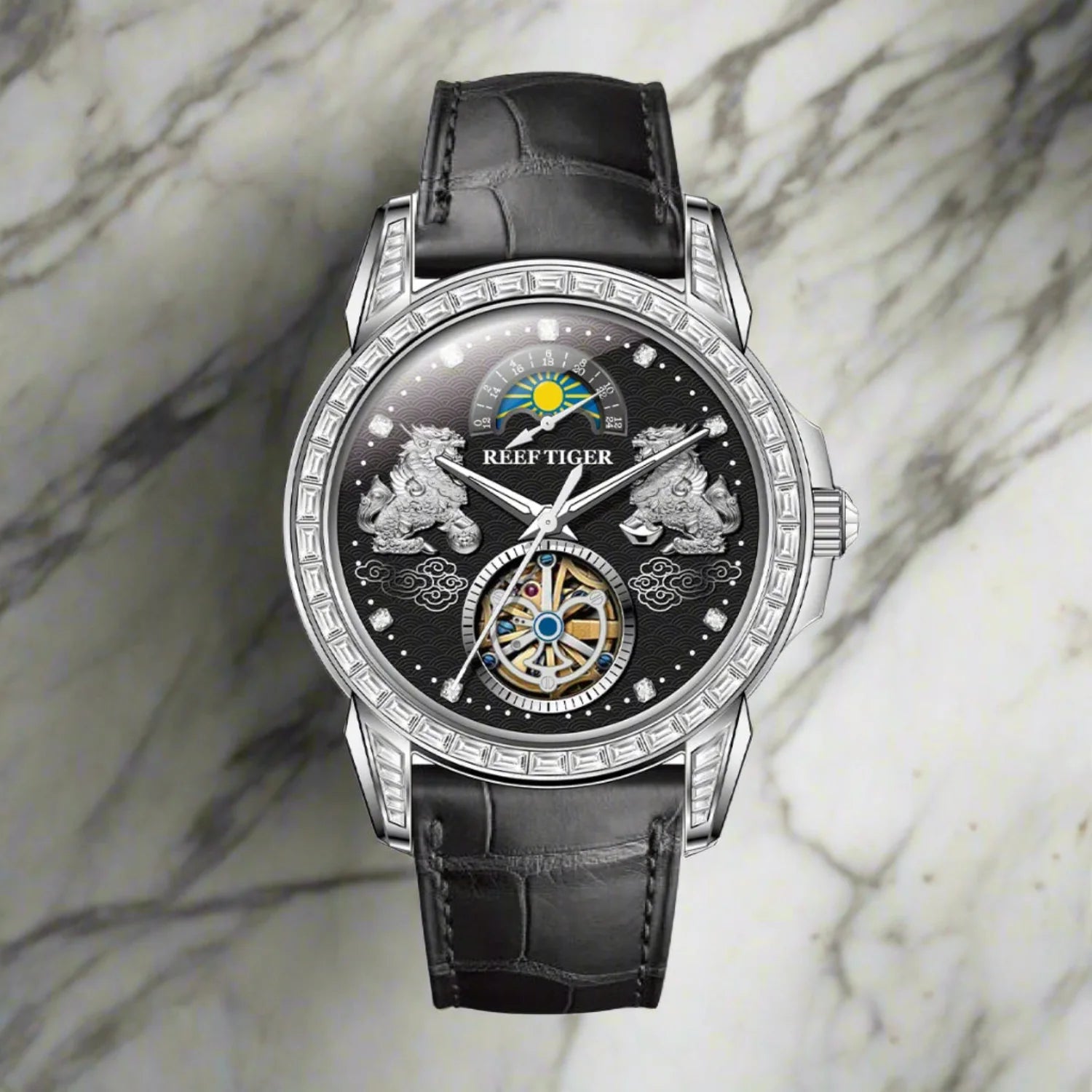 Reef tiger automatic watch rose gold pixiu dial diamond bezel leather strap