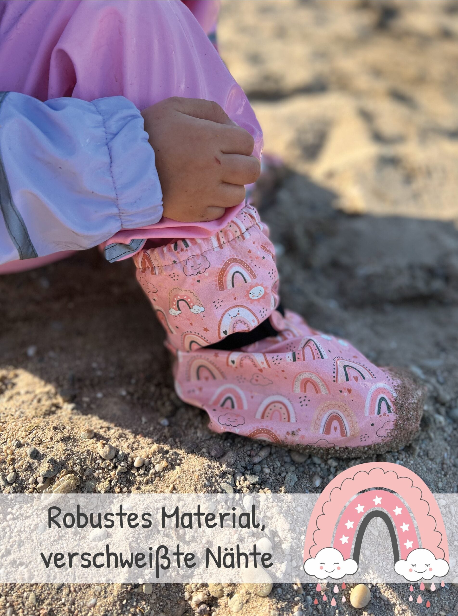 Dank des praktischen Gummizugs lassen sich die Füßlinge mühelos über Socken oder kleine Schuhe ziehen und sitzen dennoch fest am Fuß – kein Verrutschen, kein Frieren.
