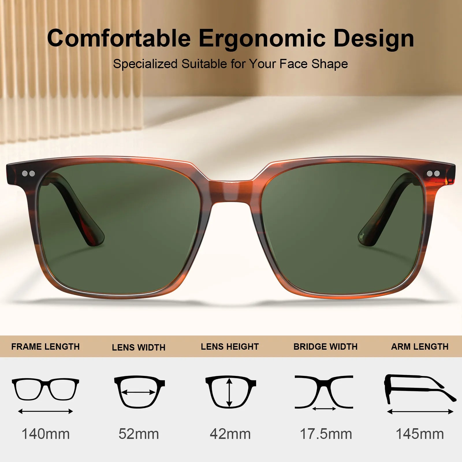 - Box within Box & Risk-Free Buying - We hope your frames always stay in the best shape for years to come, so we send an embossed leather case for better eyewear storage. The rich package includes UV400 Green Lens Men's Driving Sunglasses, a Soft Cleaning Cloth, Specific Instructions, a Polarization Testing Card, and a Hard Protection Box. We also offer a 1-Year Warranty. Please contact us for a satisfactory solution if you encounter any issues.