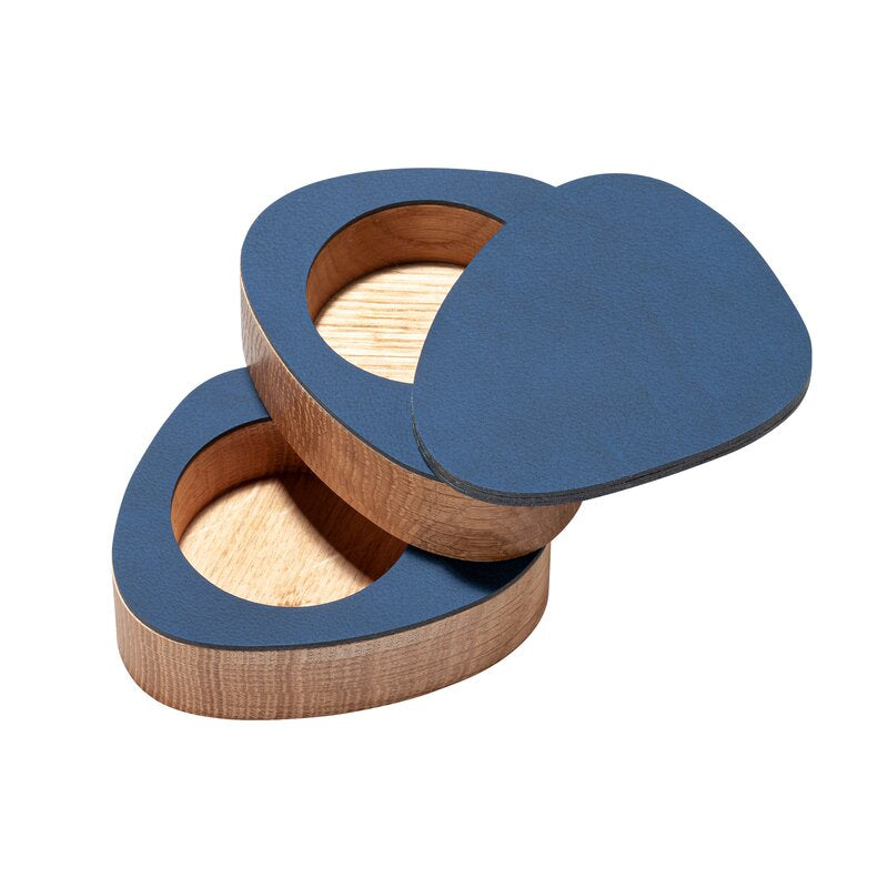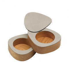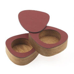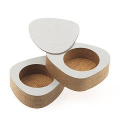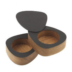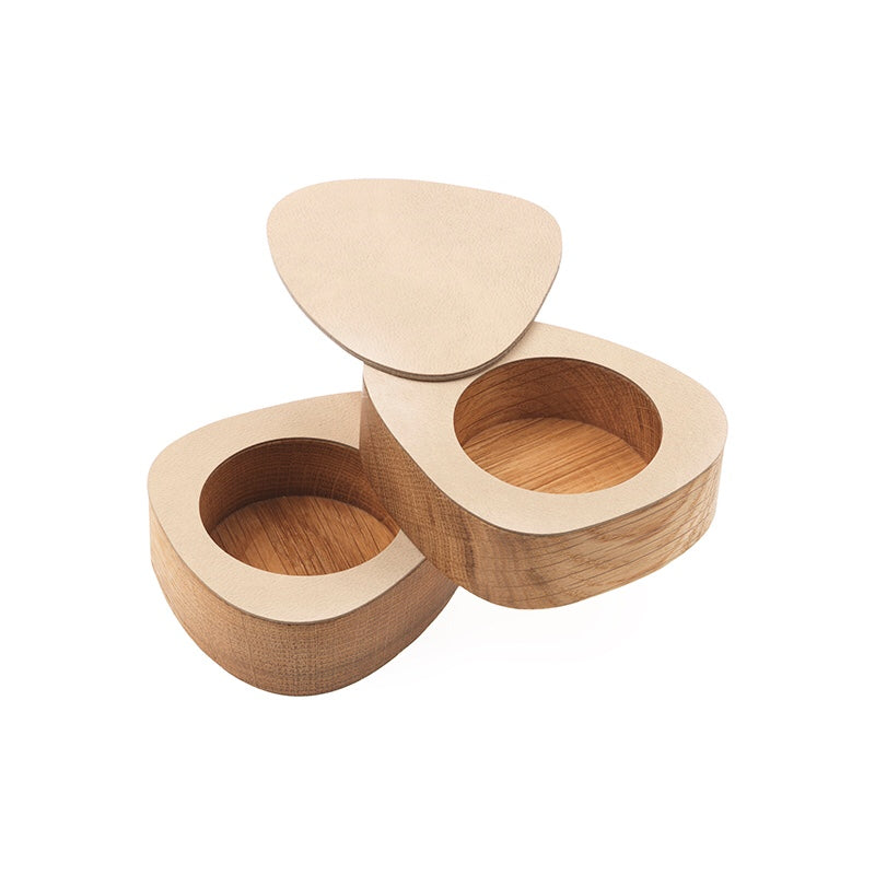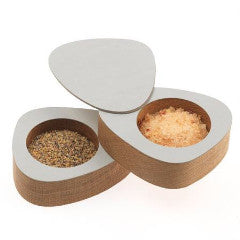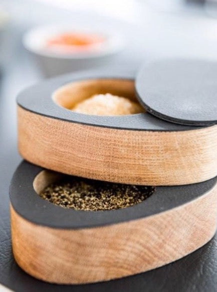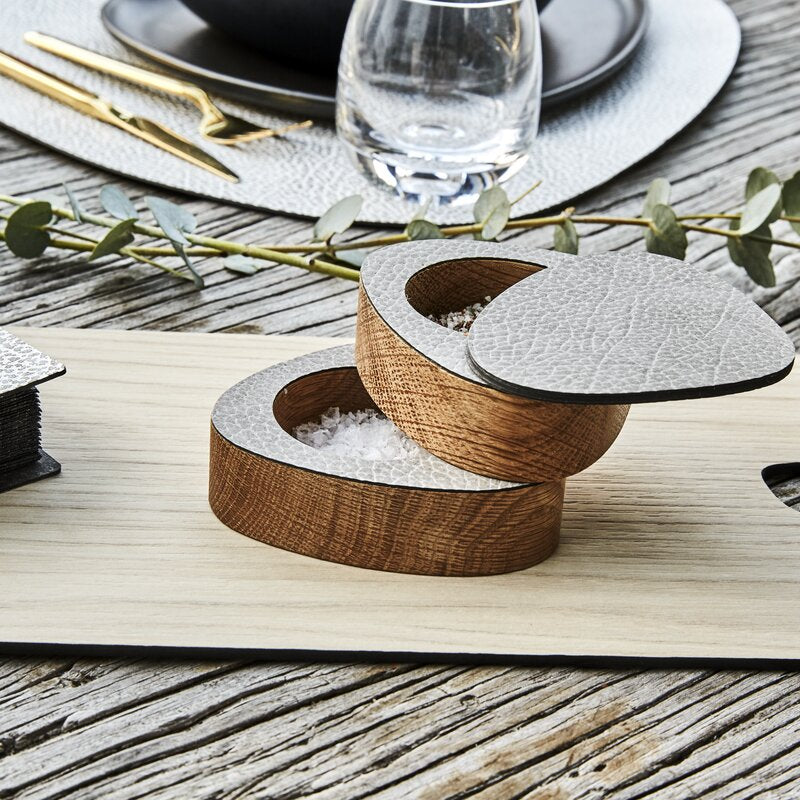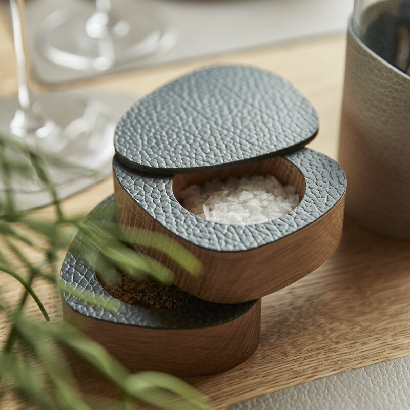 Dieser innovative Salz und Pfeffer Behälter aus hochwertigem dänischen Eichenholz ist mit farblich abgesetzten Abdeckungen aus recyceltem Leder gefertigt. Ein Magnet hält die beiden Holzelemente und die Lederabdeckung zusammen. Der Behälter lässt sich problemlos mit dem vorhandenen Tischgeschirr kombinieren. Eine moderne Ergänzung jeder Tischdekoration. Auch als Kerzenhalter für Teelichte nutzbar. In vielen Farbvariationen erhältlich.