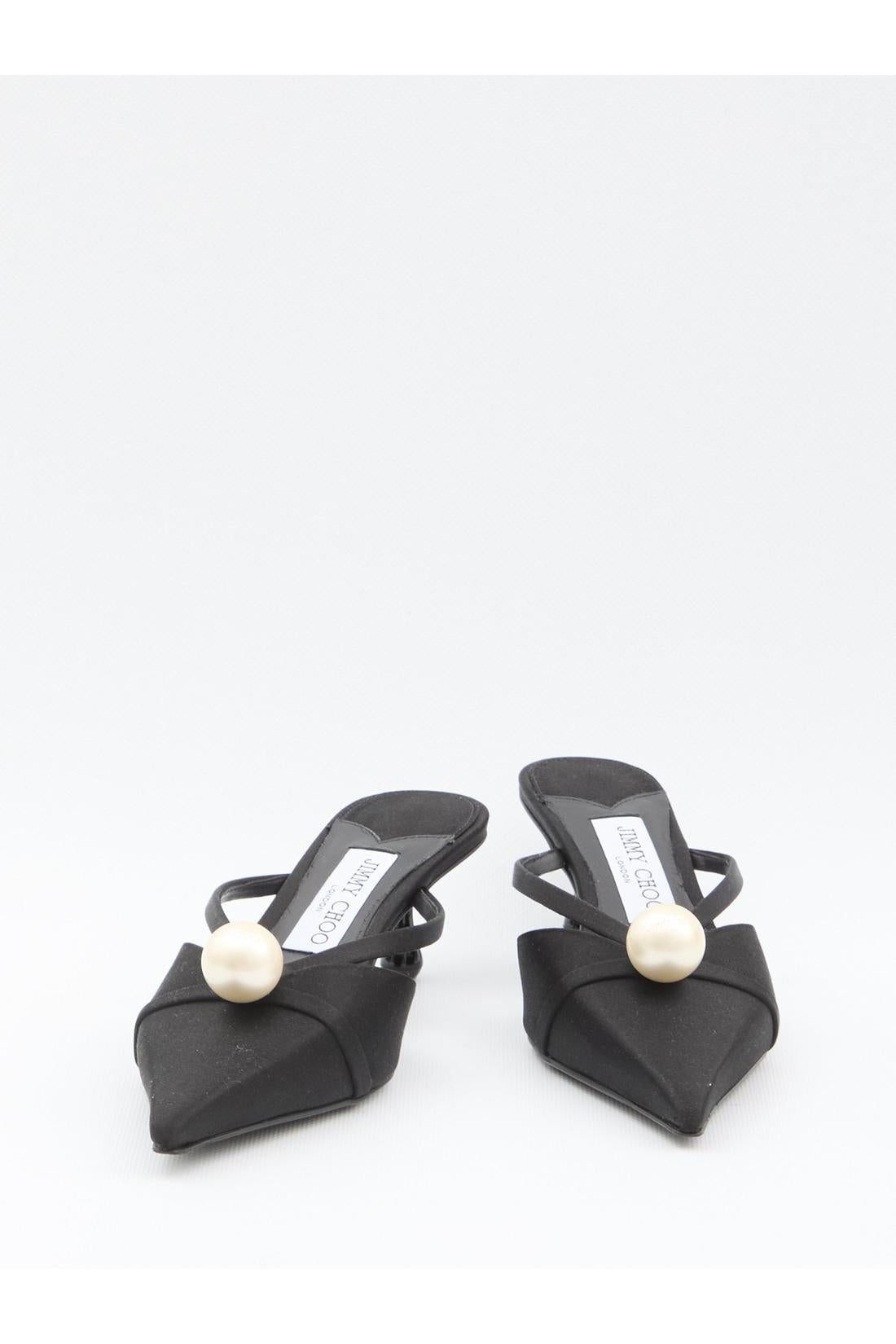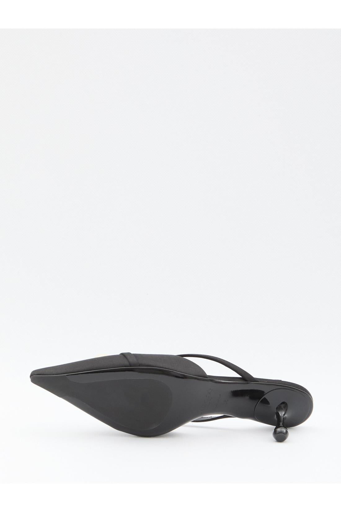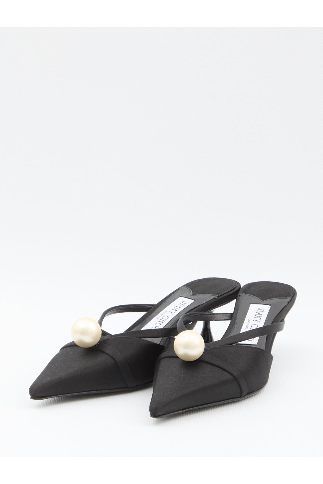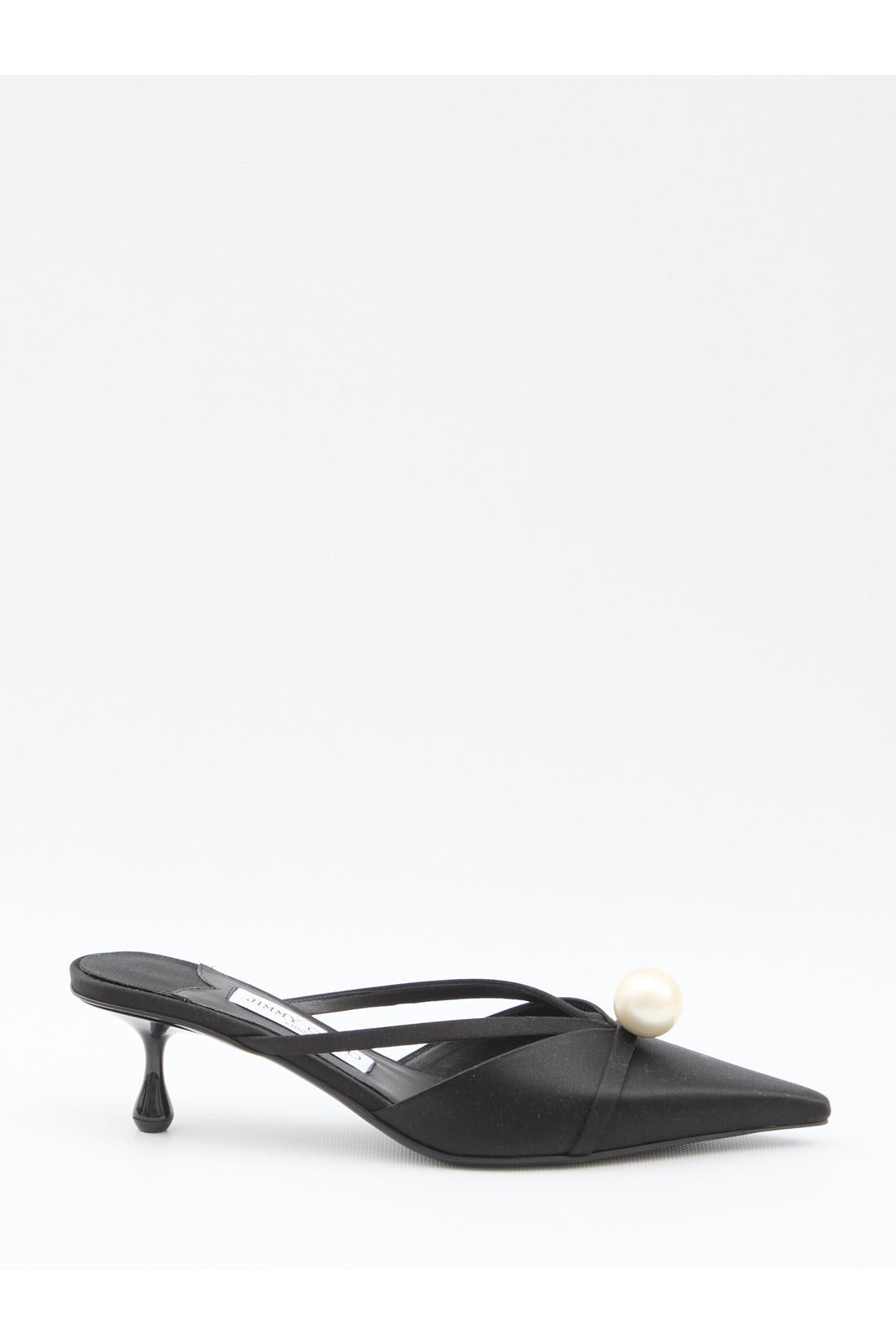 black satin mules. feature a pointed toe design, pearl-studded embellishment with embossed logo, and thin braided straps across the instep. dust bag included.