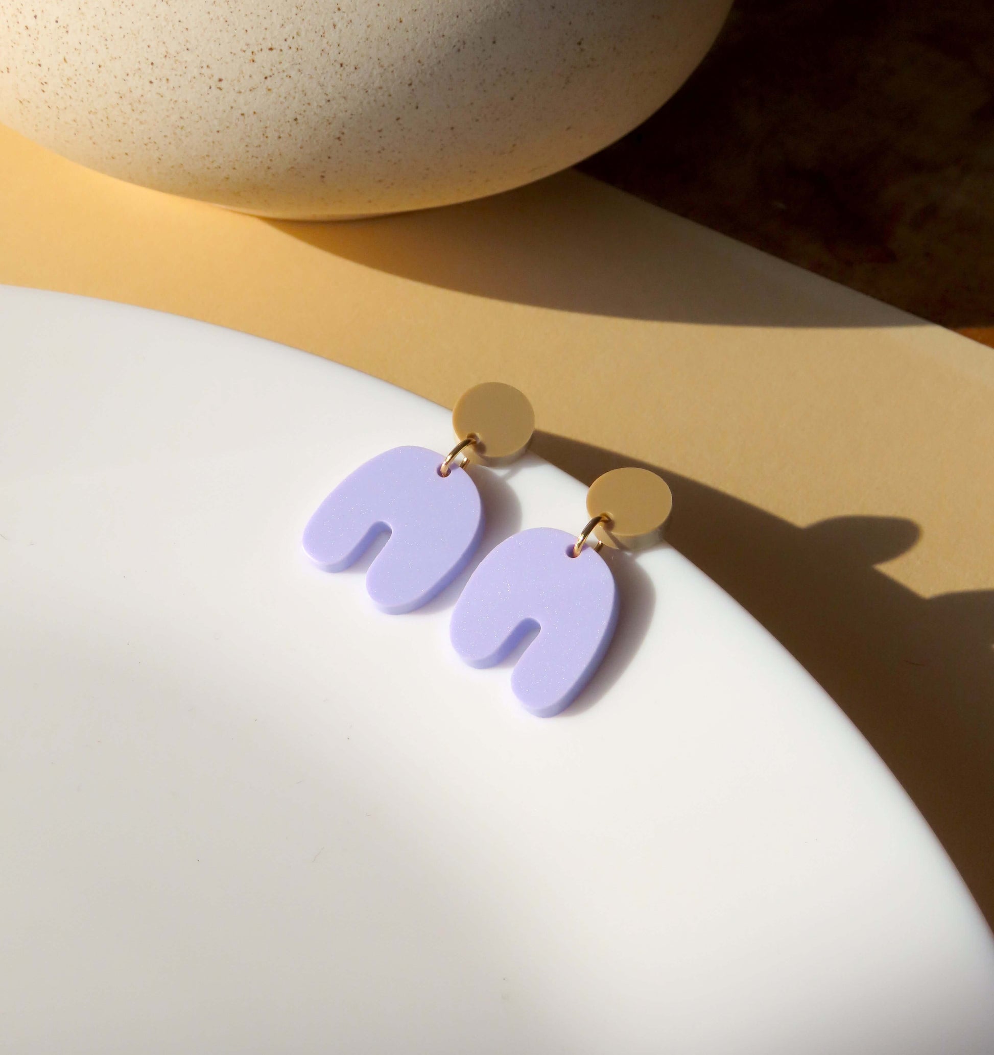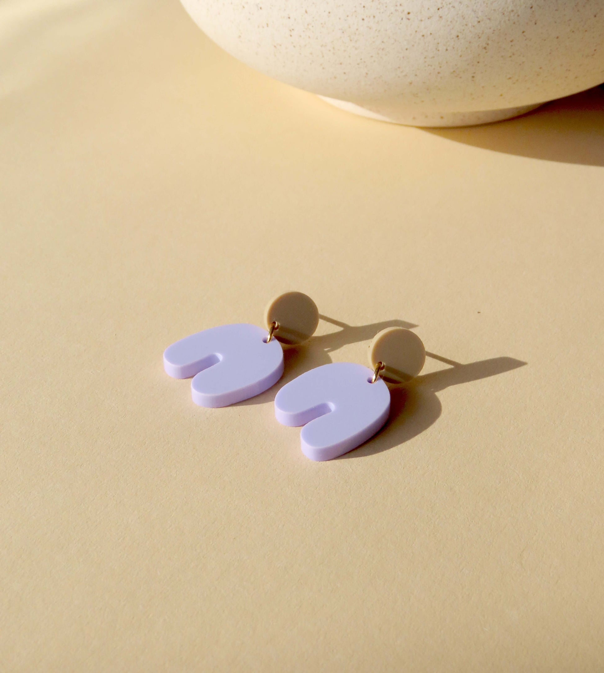 Die Sand Flieder Squishy Arch Bogen Ohrringe zeigen ein sanftes, harmonisches Zusammenspiel aus Form und Farbe.