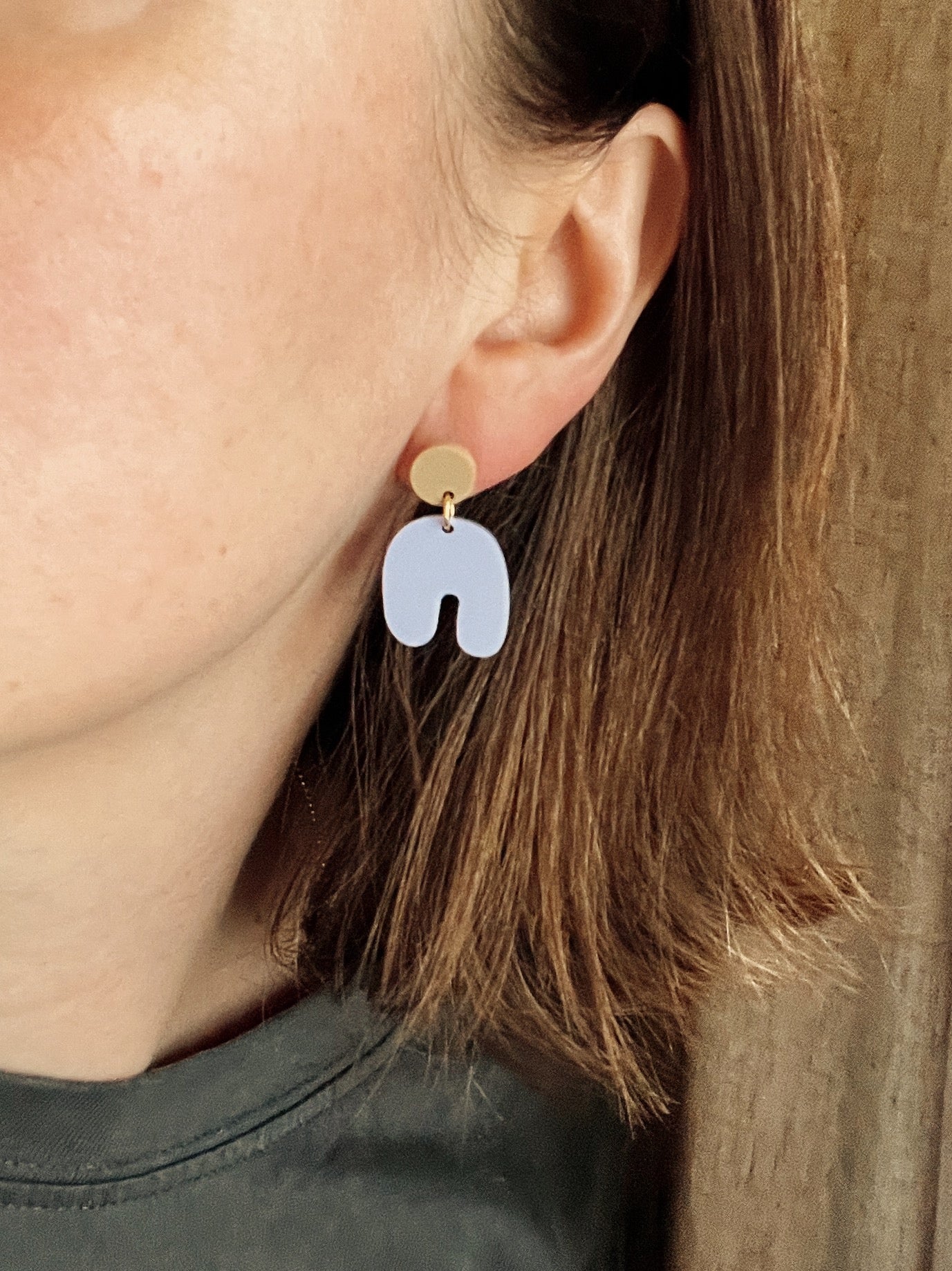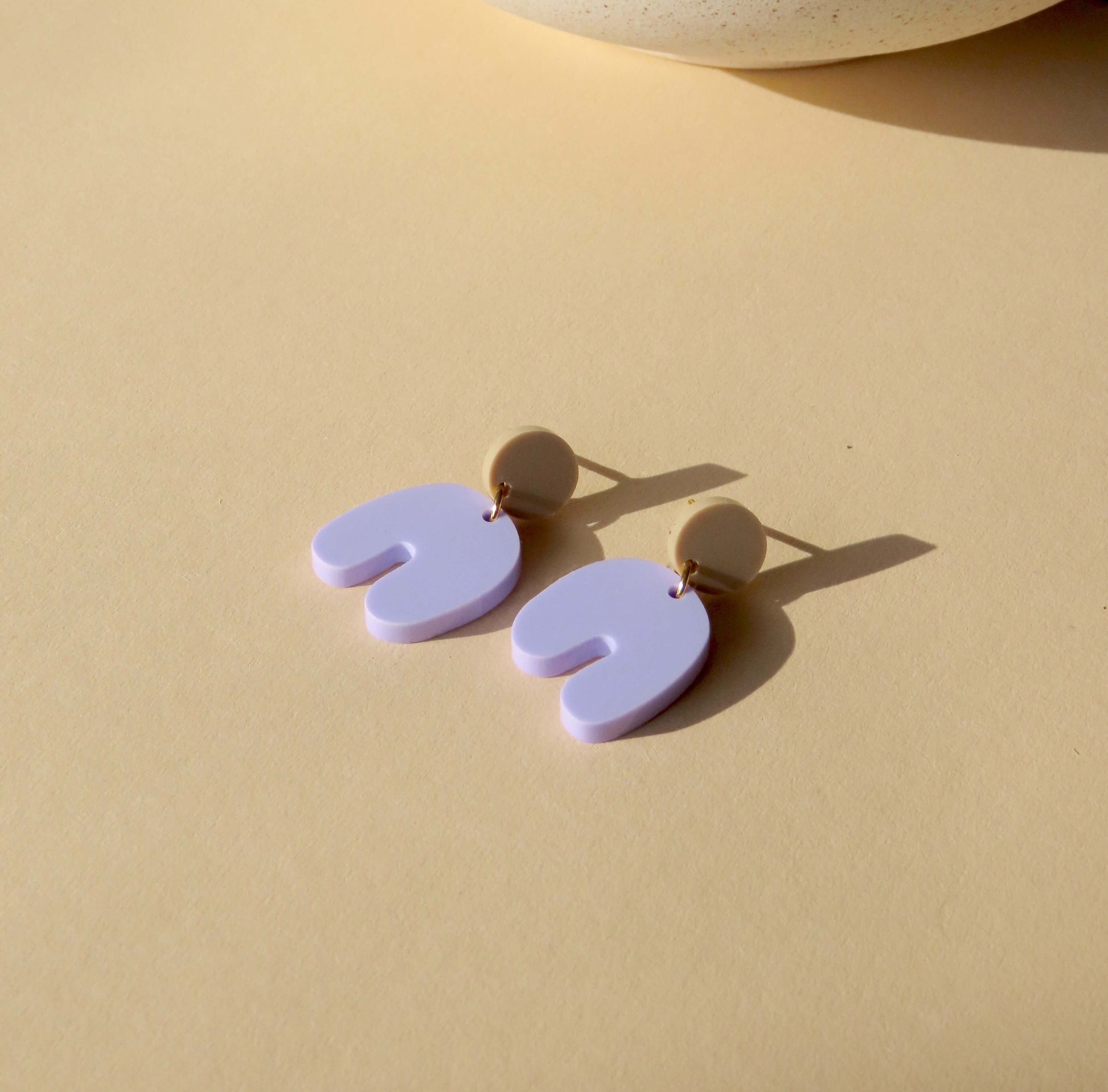 Das fliederfarbene Acryl bringt eine ruhige Note ins Design – zart und mit einem feinen Glanz. Der sandfarbene Dot bringt dazu einen leichten Kontrast. Ein minimalistisches, aber charakterstarkes Duo – leicht, hautfreundlich durch Edelstahlstecker, perfekt für alle, die sanfte Farben mit modernem Design lieben.