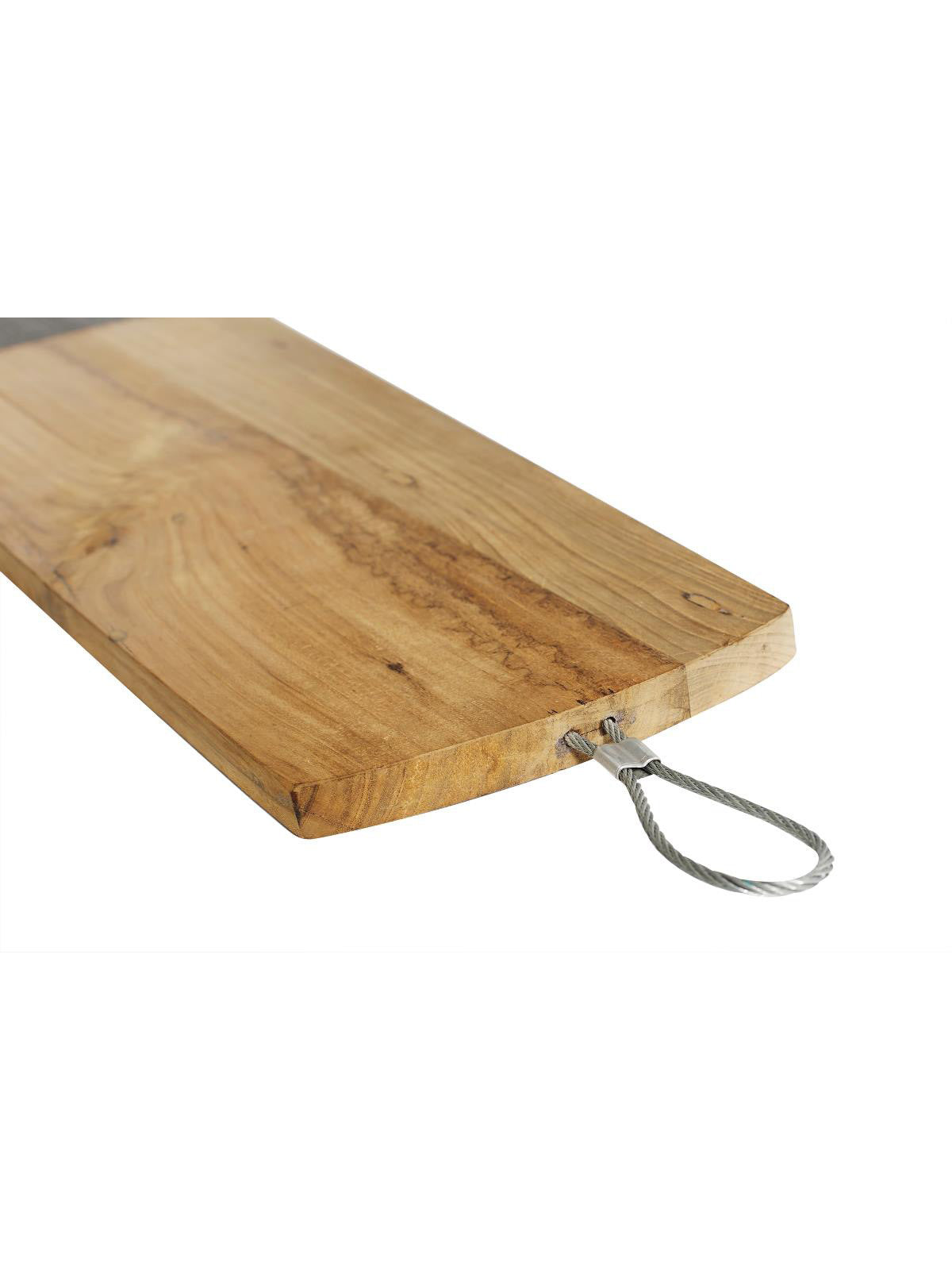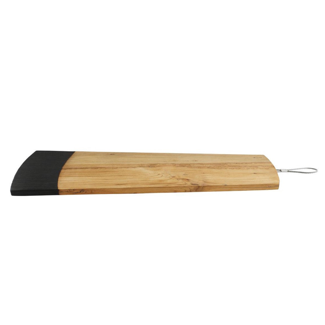 Extra großes, naturbelassenes Schneidebrett aus recyceltem Teakholz. Neben seiner Größe ist das Besondere an diesem Brett das schwarz gebrannte, matt lackierte Ende. Dieses Brett kann auch hervorragend zum Servieren verwendet werden. Eine Eisenschlaufe dient zum Aufhängen. Da es sich um ein Naturprodukt handelt, können Farbe und Form leicht variieren.