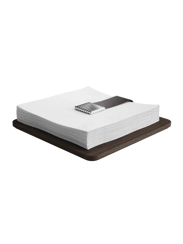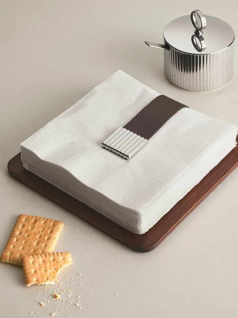 Dieser elegante Serviettenhalter ist Teil der legendären Bernadotte Serie von Georg Jensen. Eine Spange aus glänzendem Edelstahl hält die Servietten auf der Unterlage aus geräuchertem Eichenholz. Der Serviettenhalter ist ein Design, das in raffinierter Weise Form mit praktischer Funktion vereint.