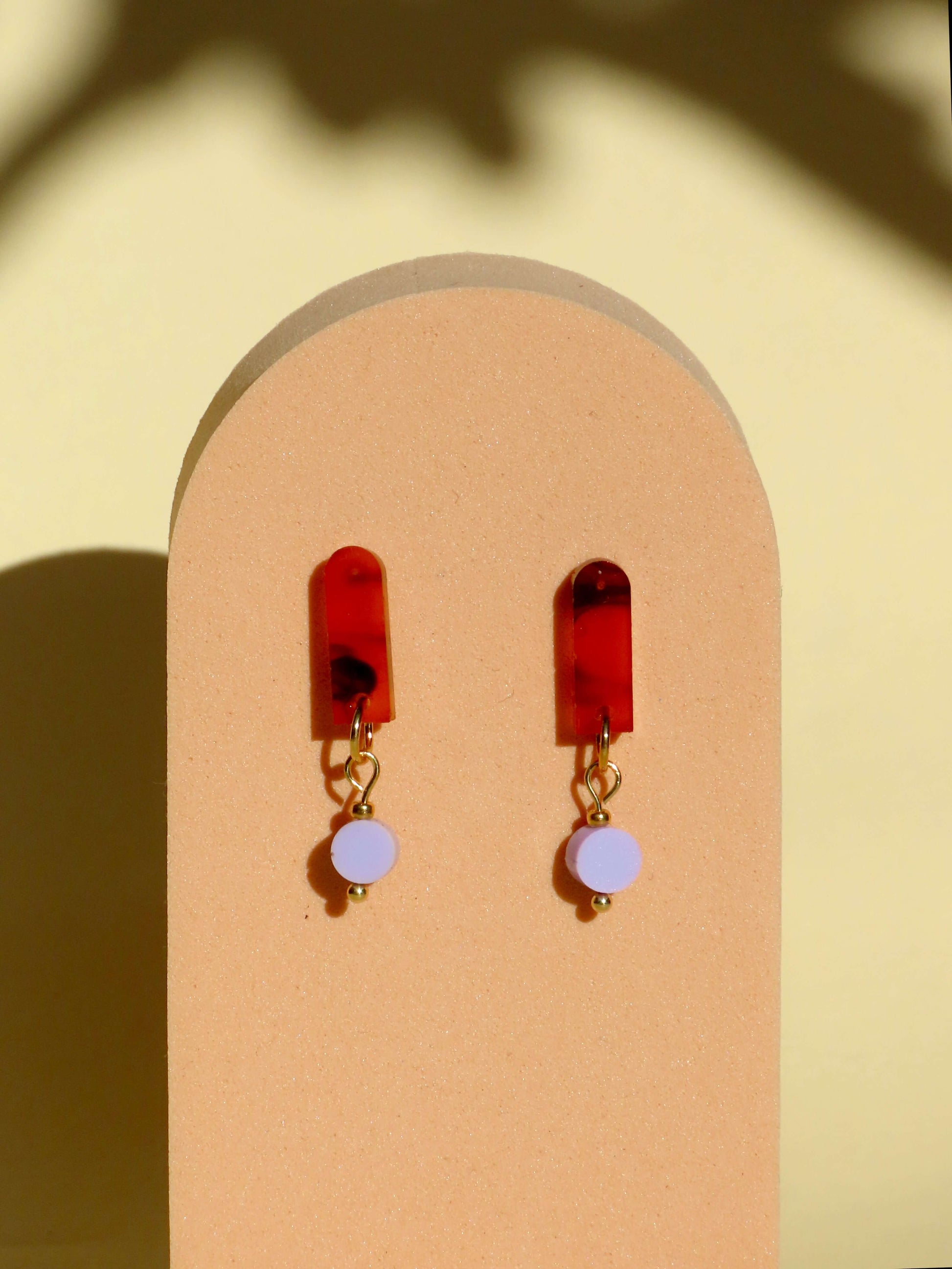 Die geradlinige Acrylform in marmoriertem Rot trifft auf eine fliederfarbenen Dot. Beide Elemente sind durch feine Golddetails verbunden und ergeben zusammen einen stilvollen Farbkontrast.