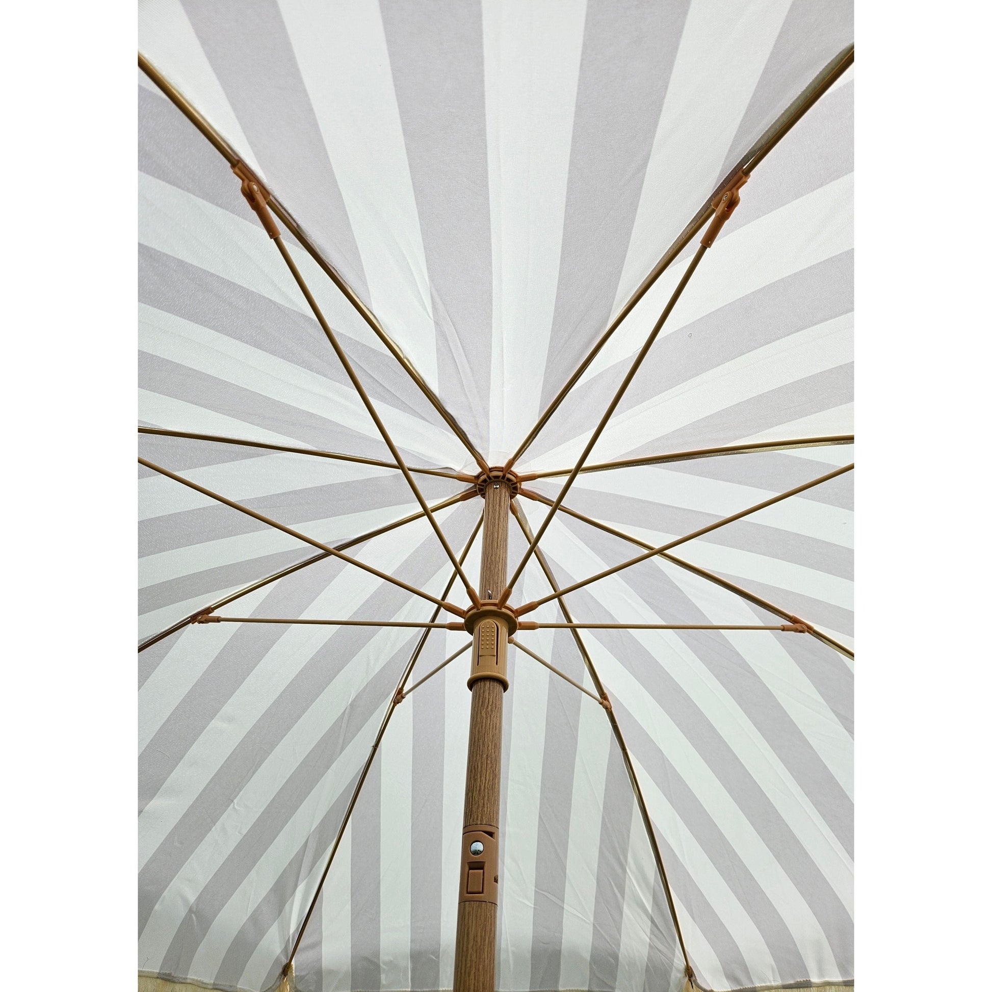 Schöner runder Sonnenschirm mit UV-Schutz 30+ und Fransen. Ideal für den Strand, im Garten und auf dem Balkon.