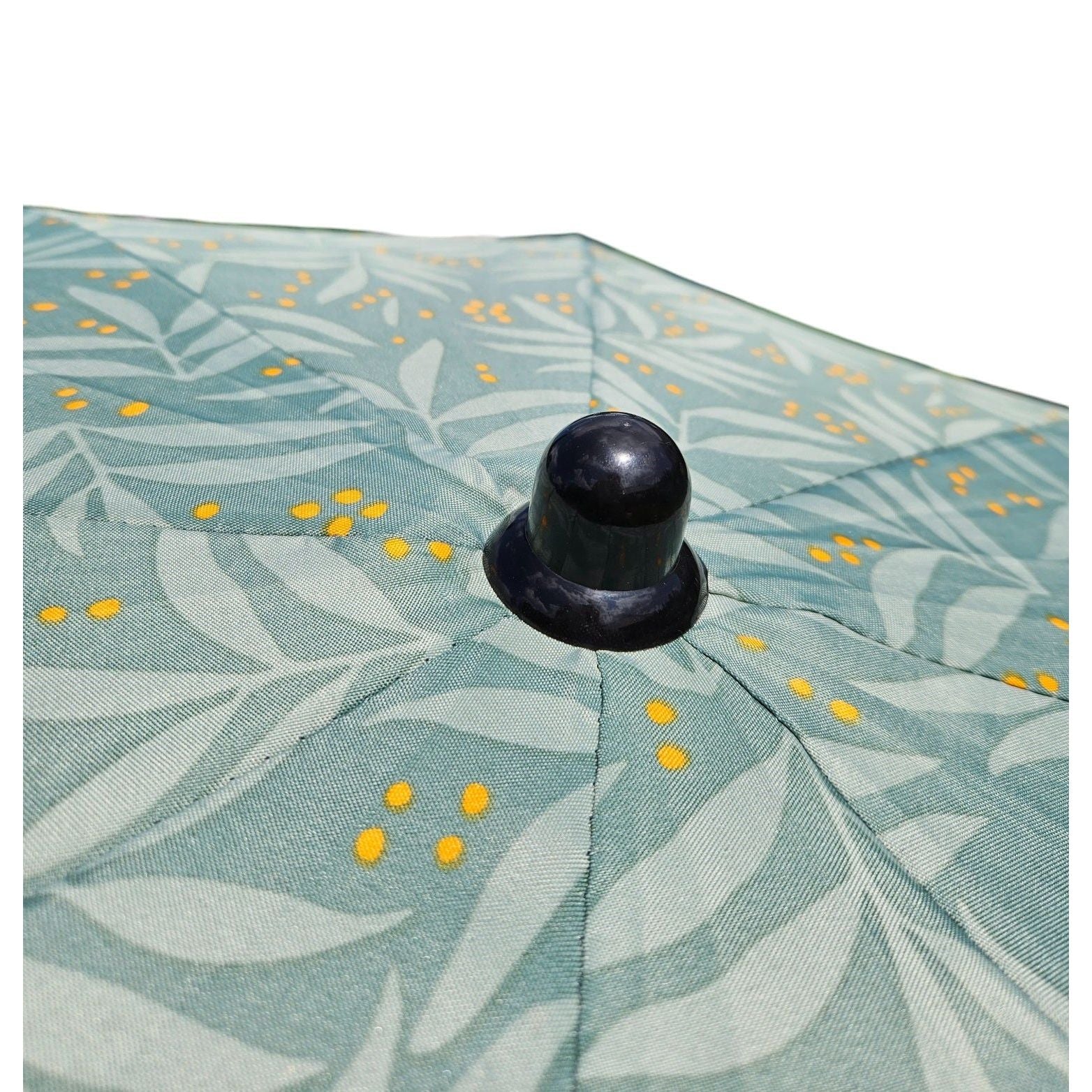 grüner Sonnenschirm mit hellgrünem Blätter-Muster und gelben Punkten