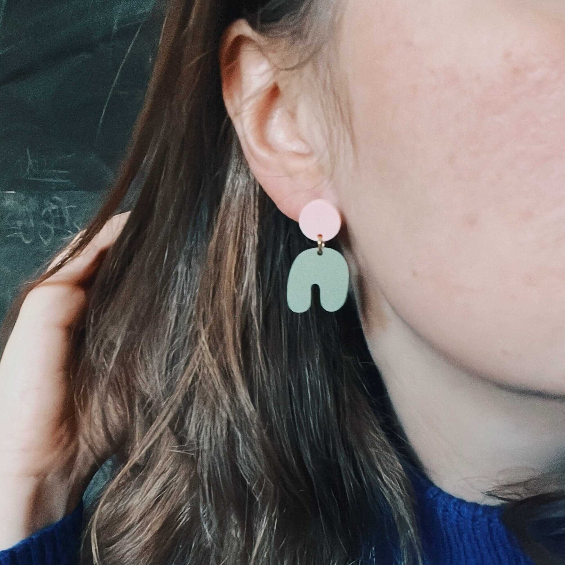 Ein rundes Rosa-Element kombiniert mit einem geschwungenen Bogen in Olivgrün – die Formen dieser Ohrringe ergänzen sich wie zwei kleine Design-Puzzleteile.