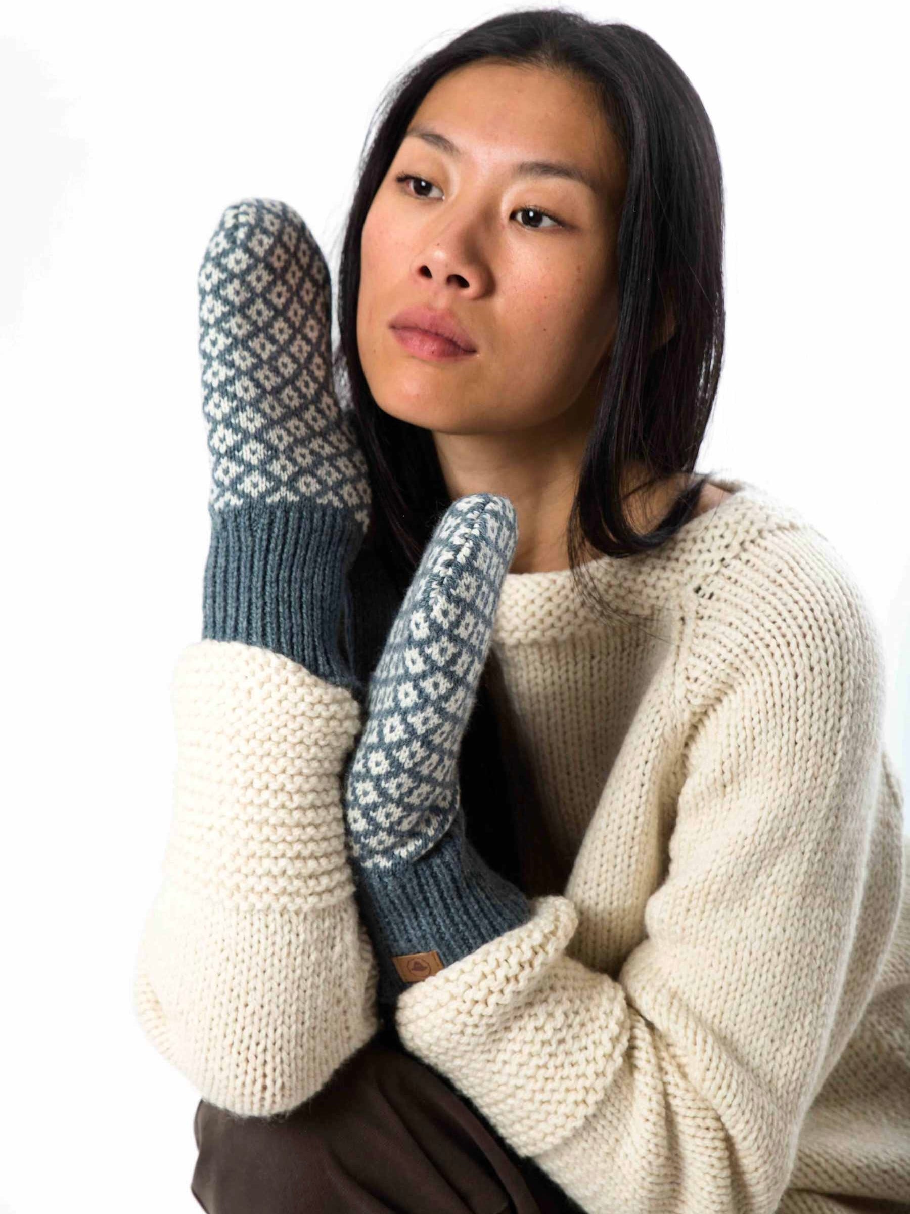 Modische Strickfäustlinge im Norweger Muster aus besonders weicher Merinowolle. Die Wolle atmet und hilft, die Körpertemperatur zu regeln. Innen mit einem recycelten Fleecefutter gearbeitet. Eine passende Strickmütze wird ebenfalls angeboten.