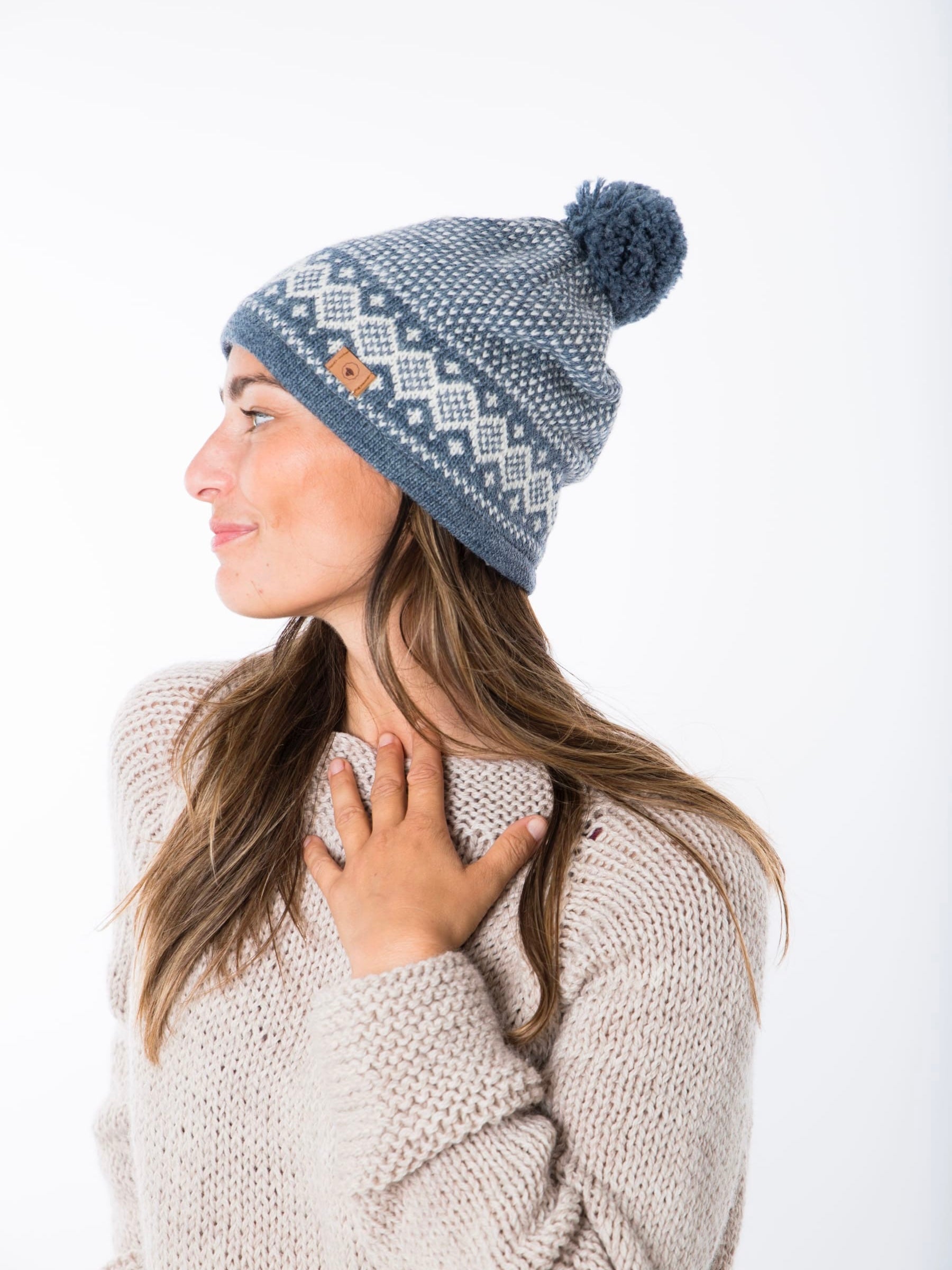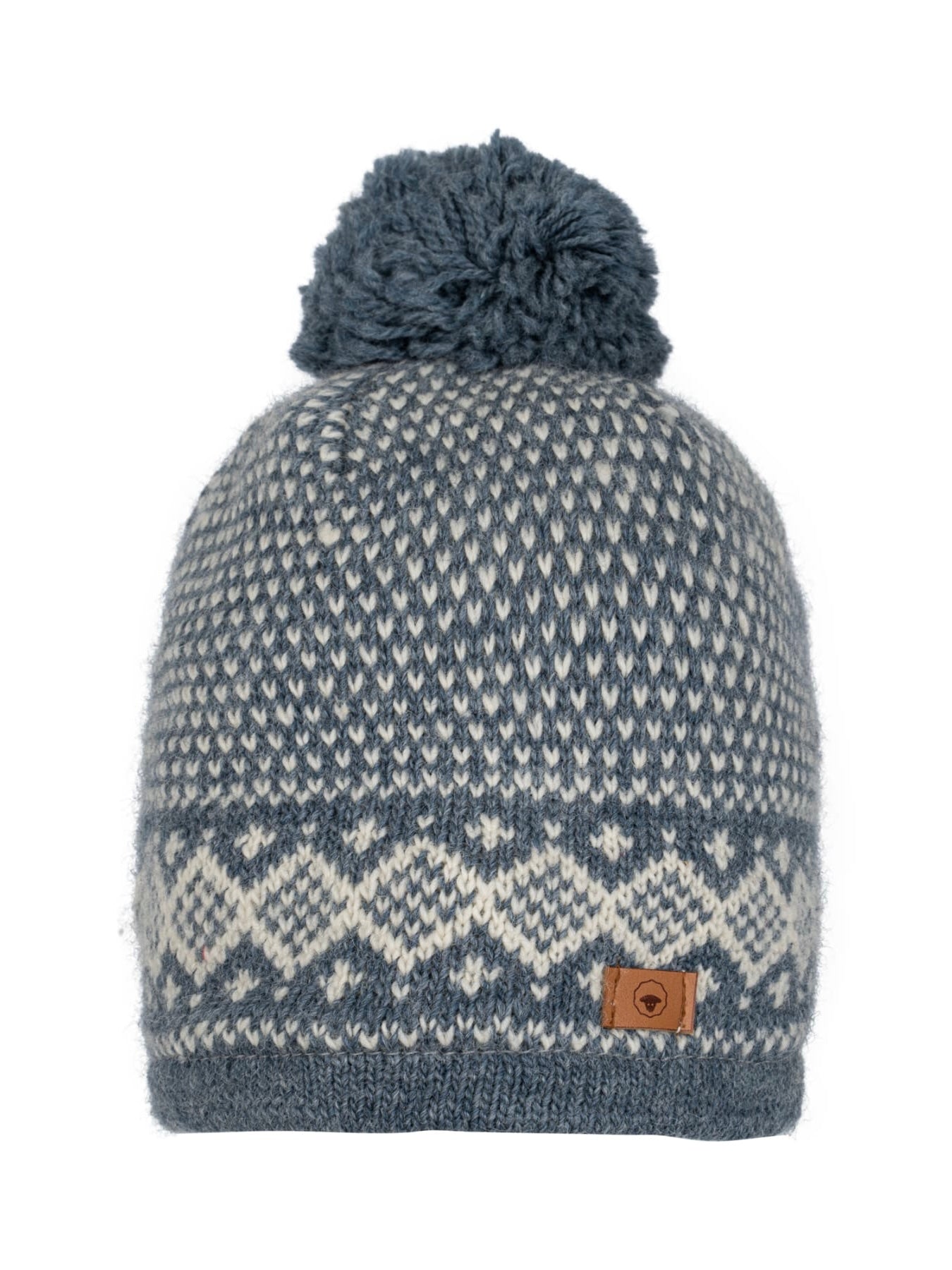 Modische Strickmütze mit Bommel im Norweger Muster aus besonders weicher Lambswool. Die Wolle atmet und hilft, die Körpertemperatur zu regeln.