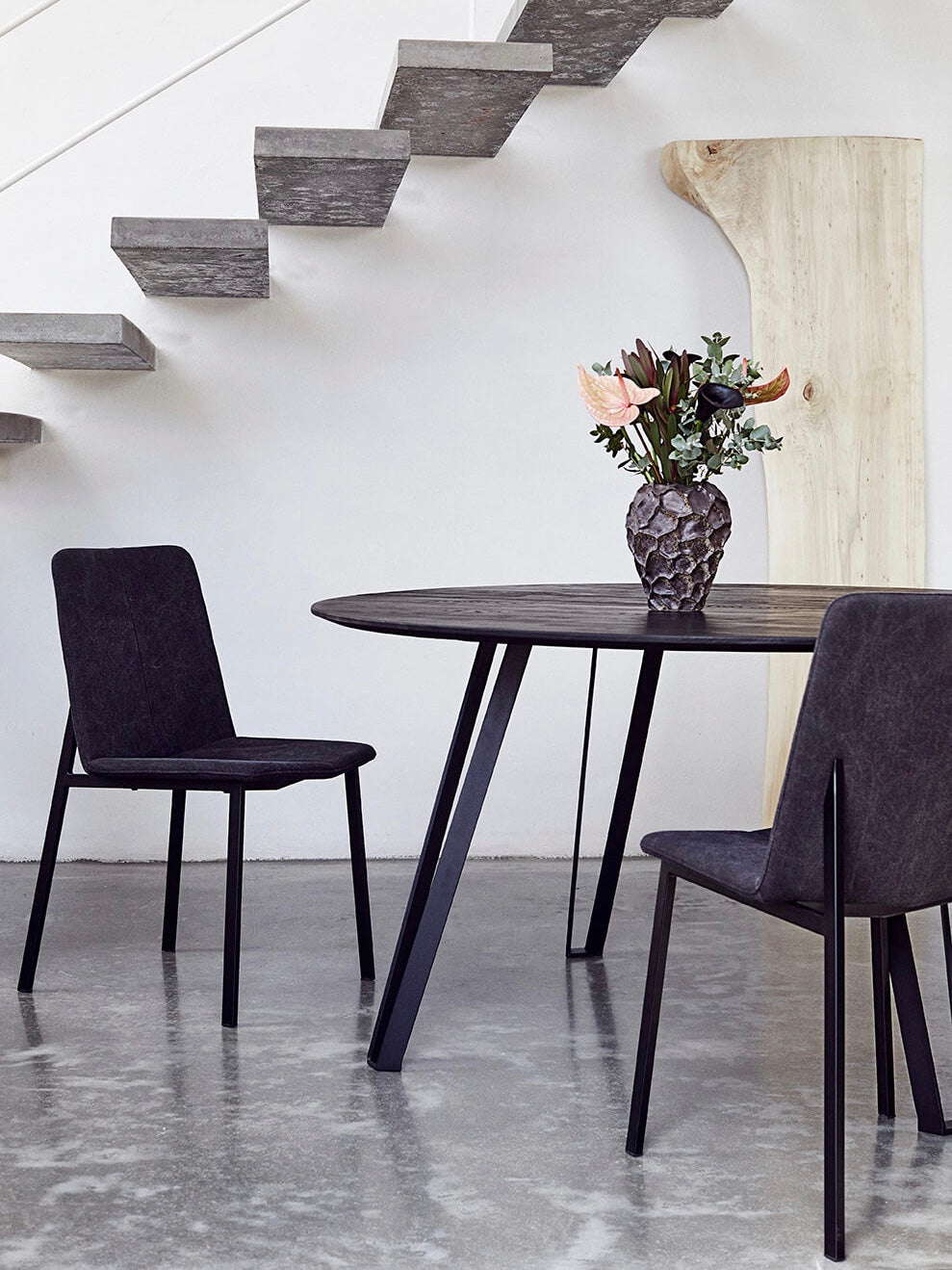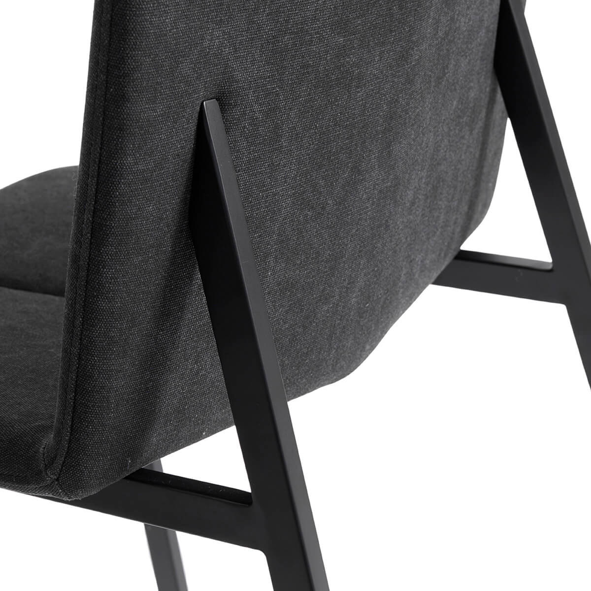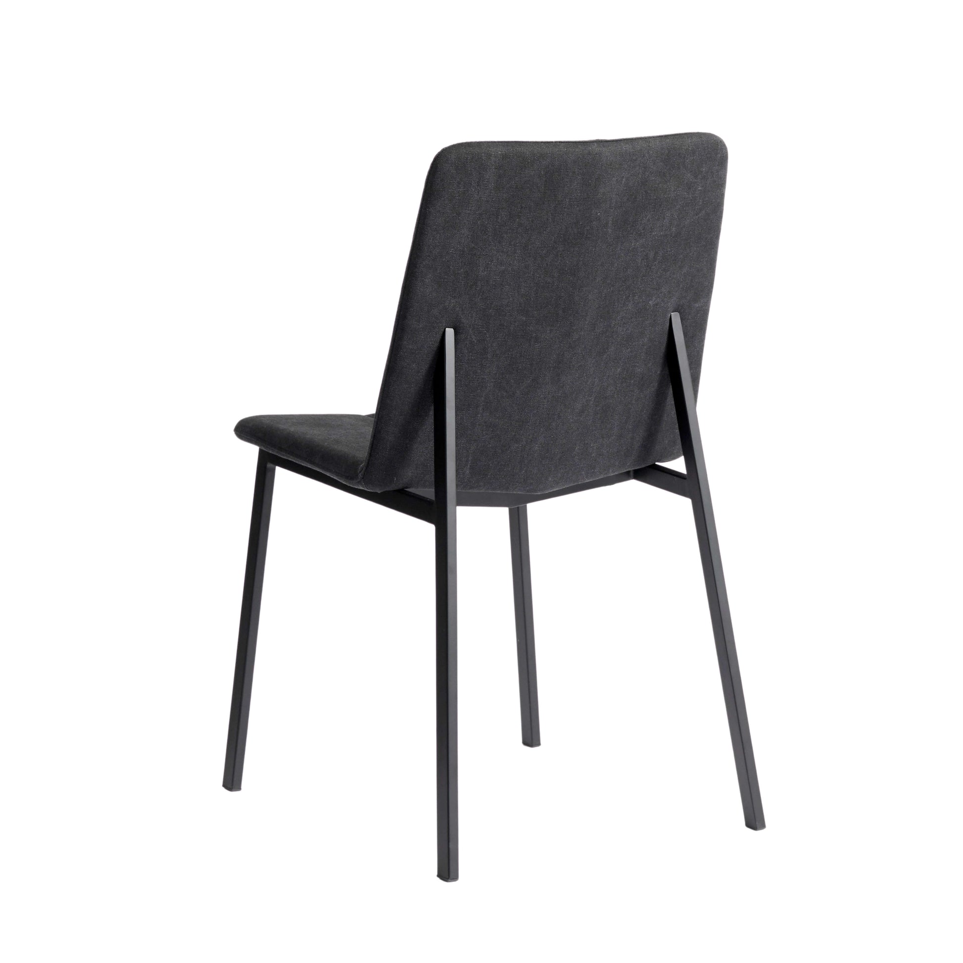 Bequemer Stuhl für Esstische in coolem, nordischen Design. Die Sitzfläche und Rückenlehne sind mit einem sehr strapazierfähigen und abwaschbaren Textilstoff aus Polyester gefertigt. Die Beine sind aus schwarz pulverisiertem Eisen.